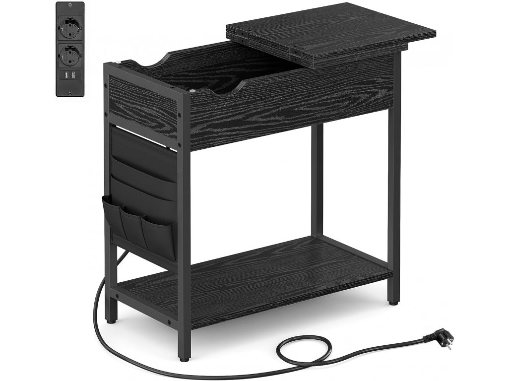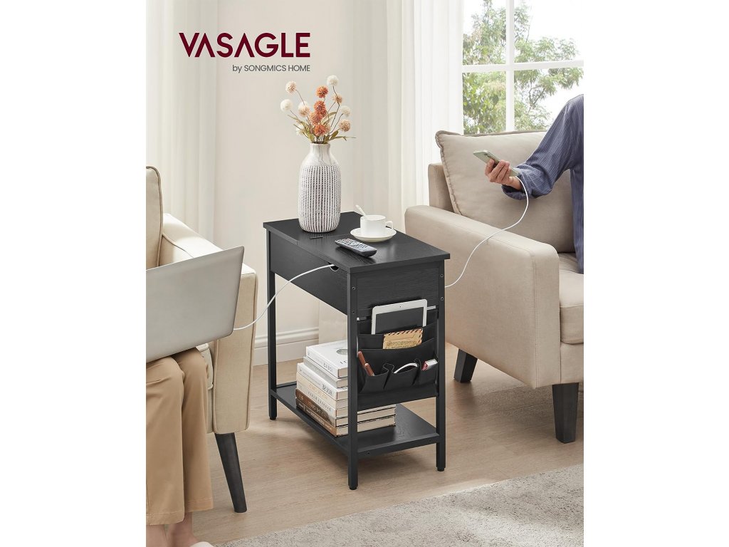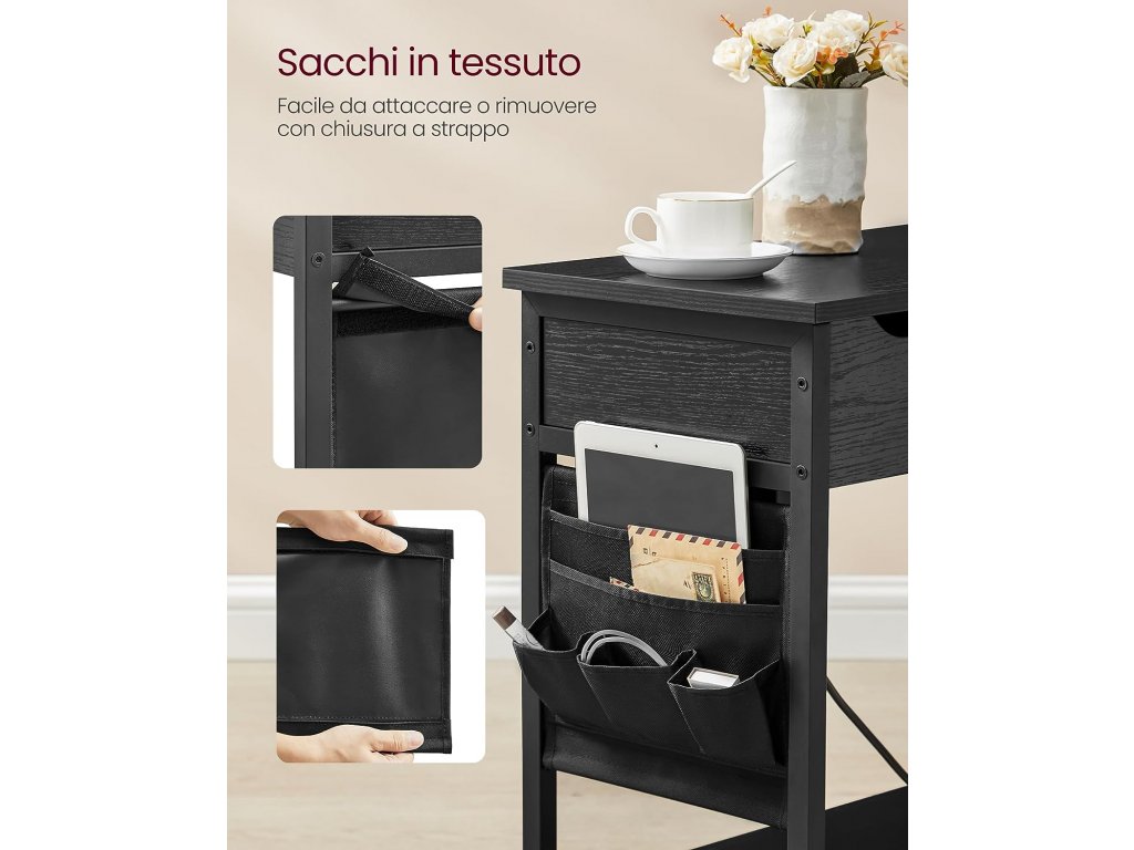Díky 2 zásuvkám, 2 portům USB a 2,1m kabelu můžete pohodlně nabíjet více zařízení. Také prostor mezi zásuvkami zabraňuje vzájemnému blokování adaptérů. Přihrádka pro ukrytí drobností, horní část pro vystavení dekorací a polička pro uložení časopisů. Díky otevřeným a uzavřeným prostorům pomáhá tento noční stolek vytvořit dobře organizovaný prostor. Látkové tašky jsou navrženy tak, aby se do nich vešly předměty každodenní potřeby: jedna o rozměrech 23,1 x 17 cm na tablet nebo časopisy, jedna o rozměrech 23,1 x 13,2 cm na notebook a 3 perfektní malé tašky na dálkové ovládání, telefon a adaptéry. Tento boční stolek se může pochlubit 2 bočními otvory pro kabely, 1 velkou odkládací deskou pro snadný přístup k předmětům a 1 boční napájecí lištou, která neruší při ukládání předmětů uvnitř. Díky rozměrům 60 x 31,5 x 60 cm (D x Š x V) se tento prostorově úsporný boční stolek skvěle hodí do malých prostor mezi dvě křesla nebo vedle postele