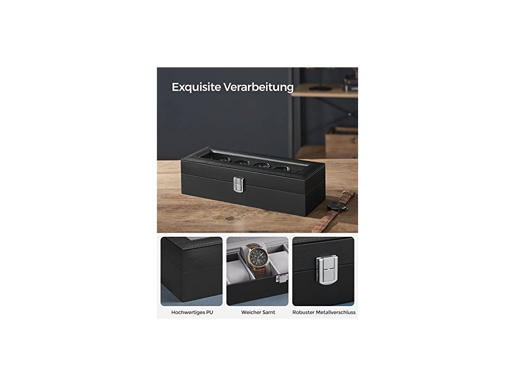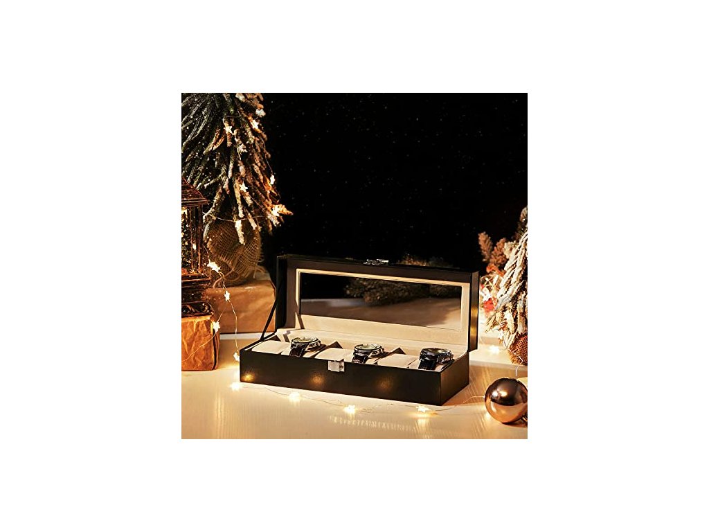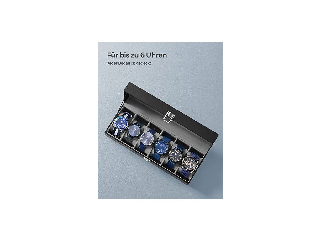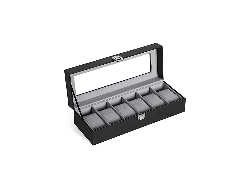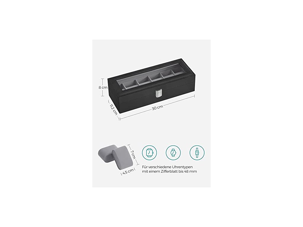 Velké průhledné skleněné víko tohoto boxu na hodinky umožňuje na první pohled vidět a najít ty správné hodinky a zároveň chrání hodinky před prachem. Kovová spona. Černá syntetická kůže, šedá podšívka