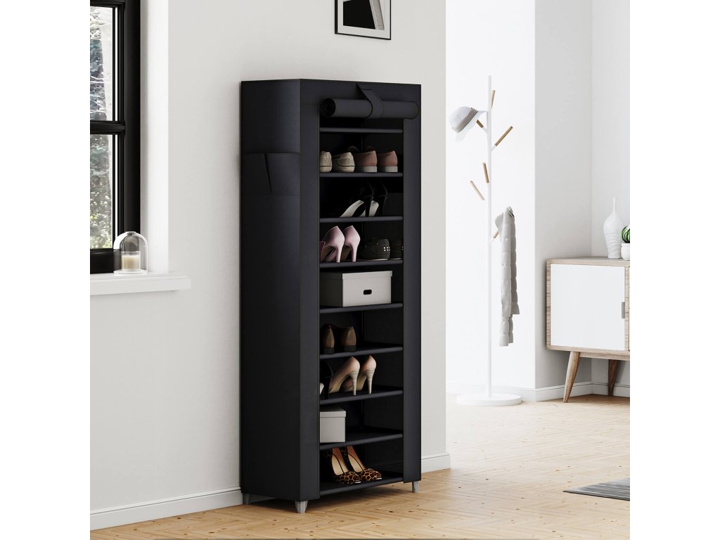 Tento botník, podepřený robustními ocelovými trubkami, nabízí pevnou oporu pro vaše oblíbené boty. Díky povrchové úpravě trubek odolné proti korozi tento úložný prostor pro vaše boty vydrží zkoušku času. Potah z netkané textilie o gramáži 75 g/m² poskytuje vašim botám všestrannou ochranu. Vlhkost? Prach? Nemají šanci! A co je ještě lepší, k čištění organizéru na boty stačí pouze hadřík. Chtěli byste se pochlubit svou sbírkou bot? Je to snadné! Rozepněte potah, vyhrňte dvířka a upevněte je pomocí suchého zipu. Chcete je skrýt? Stejně snadné! Kromě bot tento 10patrový úložný regál vítá i vaše hračky, oblečení nebo úložné boxy. Zkontrolovali jste boky? Jsou zde kapsy na drobnosti, jako jsou kartáče na boty a leštidla. Barva: Černá. Materiál: Netkaná. Textilie 75 g/m², ocelová trubka. Rozměry výrobku: 58 x 28 x 160 cm. Výška mezi úrovněmi: 17 cm. Hmotnost výrobku: 2,4 kg