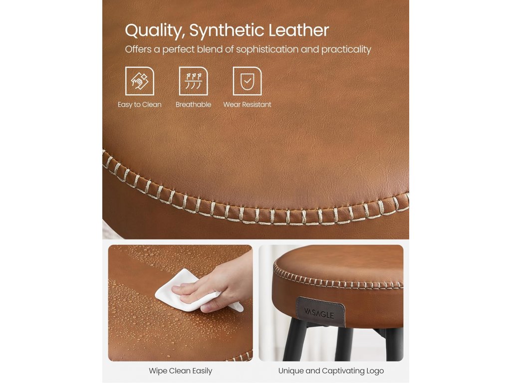 Po hladkém potahu přejeďte rukou a pak si vychutnejte podpůrný luxus silné vysoce pružné pěny. Tyto barové židle poskytují pohodlné sezení, které vydrží a obstojí ve zkoušce času. Sada 2 barových židlí s unikátními stupňovitými podnožkami. Bez námahy se přizpůsobí přátelům všech výšek a nabízejí bezkonkurenční kombinaci pohodlí a všestrannosti. Díky otočným vyrovnávacím nohám zajišťují tyto kuchyňské stoličky stabilitu na nerovném povrchu a hladký kontakt bez poškrábání, což vnáší klid do klidného domova. Příležitostné rozlití tekutin? Nebojte se! Voděodolný potah ze syntetické kůže, který lze vyčistit během okamžiku. Matné ocelové nohy odolávají poškrábání a zachovávají si svůj sofistikovaný půvab i při každodenním používání.