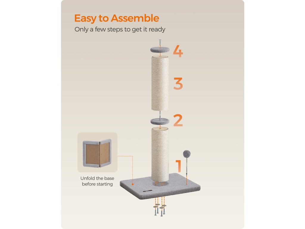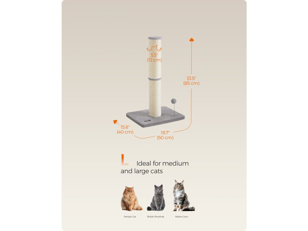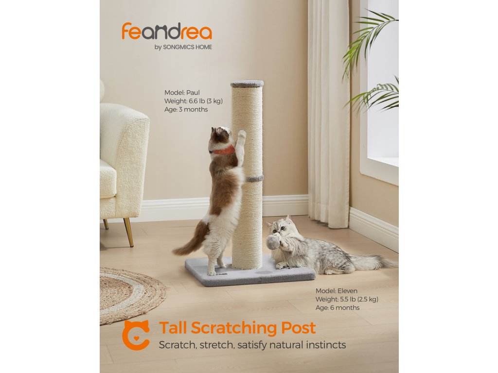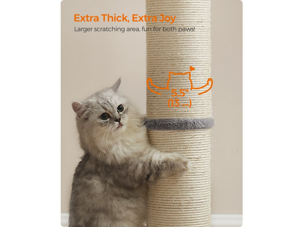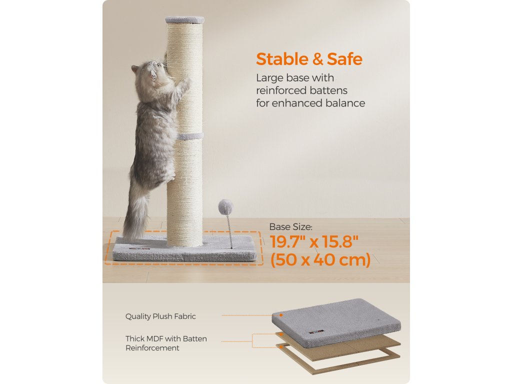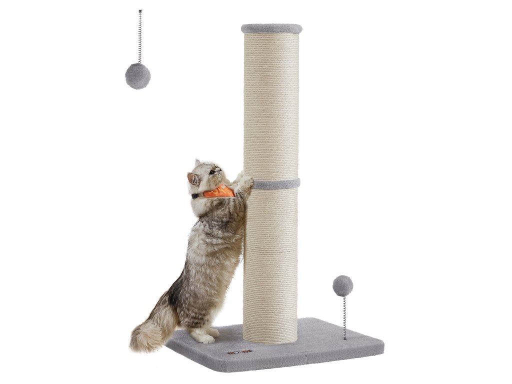 S velkorysým průměrem 5,5" toto škrabadlo pro kočky splňuje instinkt vaší kočky škrábat oběma tlapkami. Větší škrabací plocha, více zábavy ze škrábání! Toto škrabadlo pro kočky s výškou 89 cm umožňuje vašemu kočičímu příteli plně si protáhnout tělo a uvolnit svaly – ideální pro střední a velké kočky. Ostré drápy? Žádný problém. Tento škrábanec je obalen sisalem odolným proti opotřebení, který je odolný a chrání vaši pohovku nebo křeslo před poškrábáním. Jarní bambulka má uvnitř zastrčený okouzlující zvoneček, který láká kočky ke hře a zároveň zajišťuje jejich bezpečnost. Vaše zvědavé chlupaté miminko mu neodolá! S velkou základnou o rozměrech 49,7 cm x 39,2 cm a vyztuženou extra látkami zajišťuje tento sisalový sloupek pro kočky stabilní a bezpečné místo, kde si vaše malá chlupatá kočička může škrábat, hrát si a šplhat – aniž by se převrhla. Barva: Holubí šedá. Materiál: Sisal, MDF (dřevovláknitá deska střední hustoty), plyš. Rozměry výrobku: 50 x 40 x 85 cm. Hmotnost výrobku: 5 kg