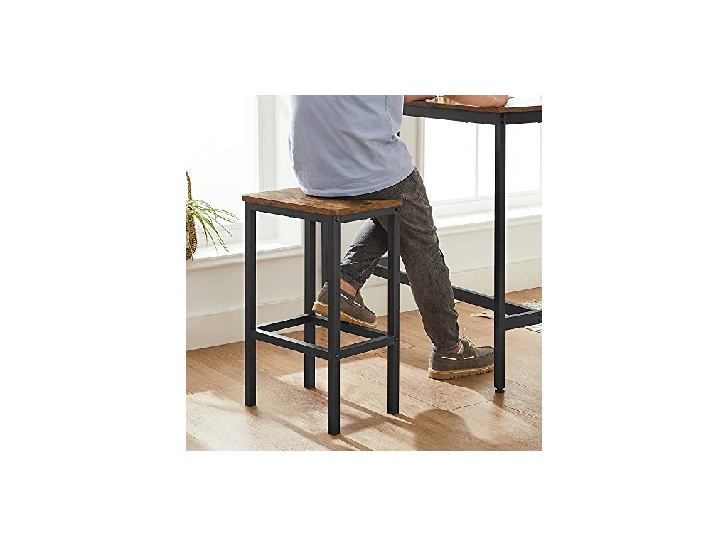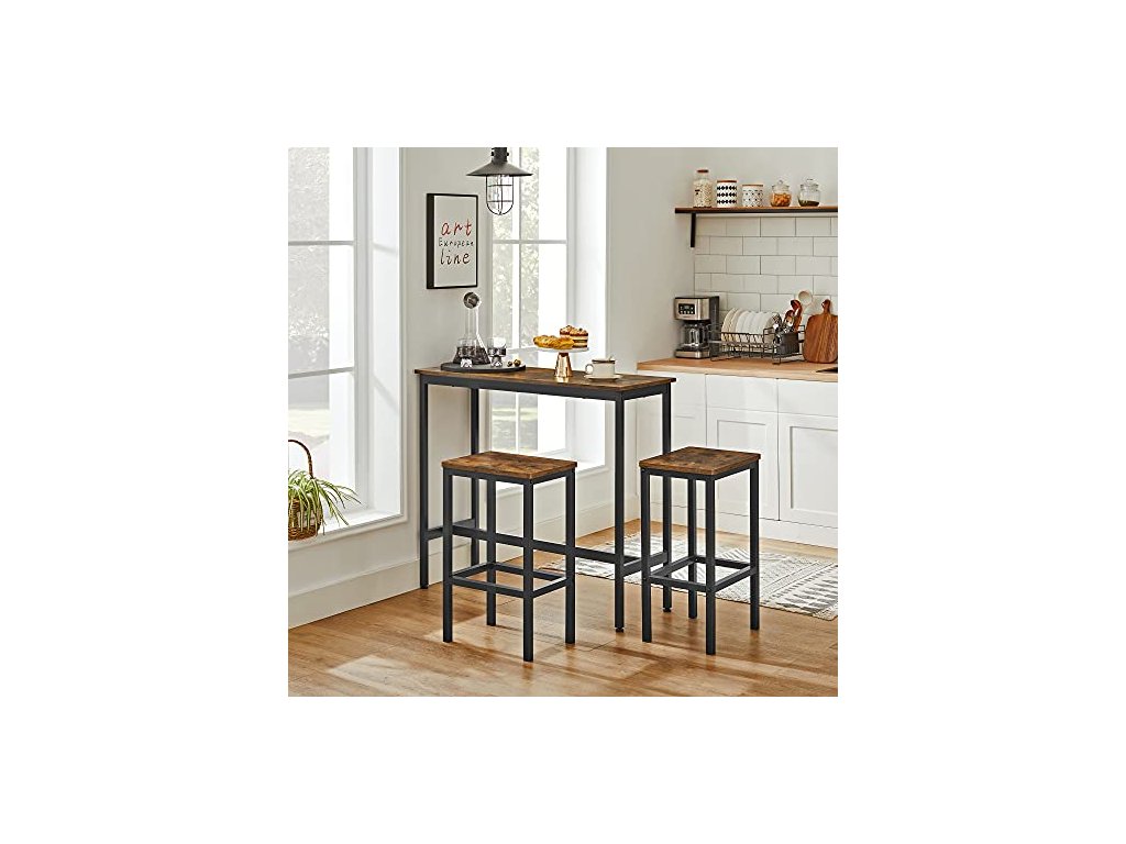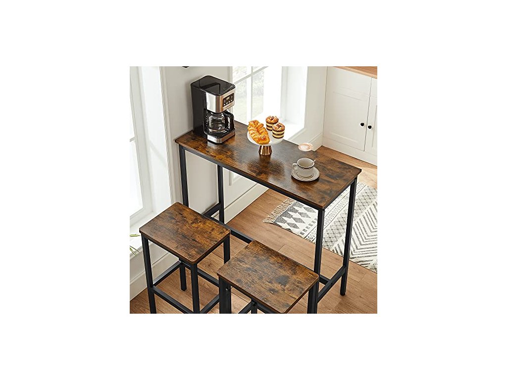 Vysoký barový stůl o rozměrech 100 x 40 cm je prostorný pro uložení kávy, croissantu a džusu; dvě stoličky o rozměrech 40 x 30 cm umožňují pohodlnou snídani pro 2 osoby - stačí jeden koutek. Stabilní ocelový rám