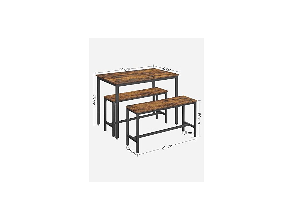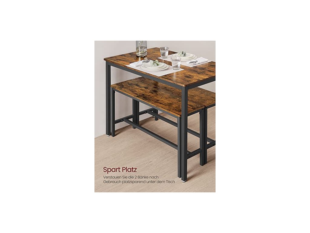 Dvě lavice lze po jídle uložit pod jídelní stůl, takže tento jídelní set je ideálním řešením pro malé prostory, abyste měli pořádek. Ocelová konstrukce. Rozměry stolu: 110 x 70 x 75 cm, rozměry lavice: 97 x 30 x 50 cm.
