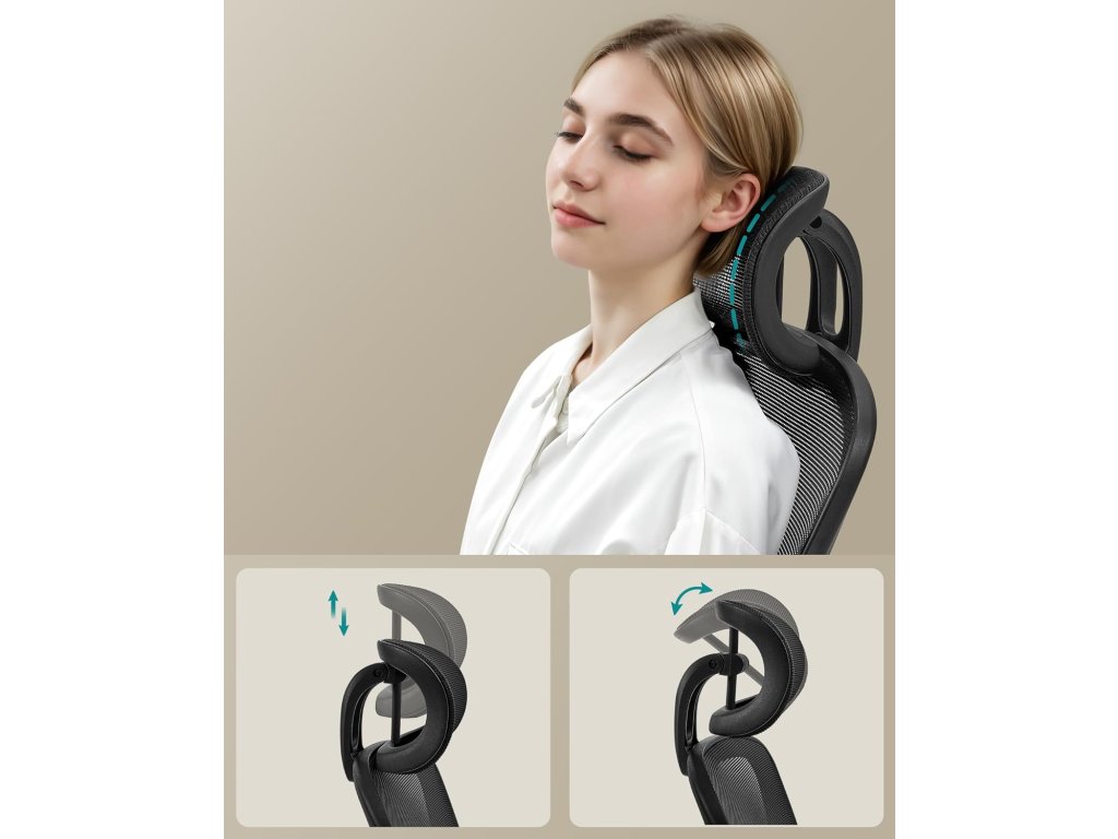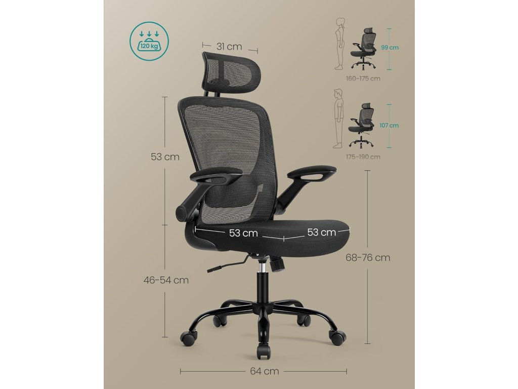 Opěradlo ve tvaru S se přizpůsobí vašemu tělu a díky nastavitelné polstrované bederní opěrce a opěrce hlavy jsou vaše záda a krk dobře podepřeny. Flexibilní nastavení: Sedák a bederní opěrka jsou výškově nastavitelné. Loketní opěrky lze sklopit a židli tak uložit pod stůl, čímž se ušetří místo. Pro relaxaci lze aktivovat funkci houpání 90°-105°. 6 cm silná vysoce kvalitní pěna, ne příliš měkká, ne příliš tvrdá, prostě perfektní; 53 cm měkký sedák ulevuje od tlaku při dlouhém sezení; Prémiová tkanina je pohodlná a prodyšná. Díky vysoce kvalitnímu plynovému zvedacímu válci a robustní kovové základně má tato kancelářská židle nosnost až 120 kg a poskytuje pevný a stabilní úchop. Nylonová kolečka jsou odolná proti opotřebení, tichá a chrání podlahu před poškrábáním. Kolečka navíc prošla 100 000násobným cyklickým testem komponentů (testováno dodavatelem). Barva: Inkoustově černá. Materiál: Plast, pěna, nylon, ocel. Rozměry: Celkové rozměry: 64 x 64 x 115-130 cm. Výška sedáku (od podlahy): 46-54 cm. Rozměry sedáku: 53 x 53 cm. Rozměry opěradla: 51 x 53 cm. Hmotnost: 11,9 kg. Max. statická nosnost: 120 kg
