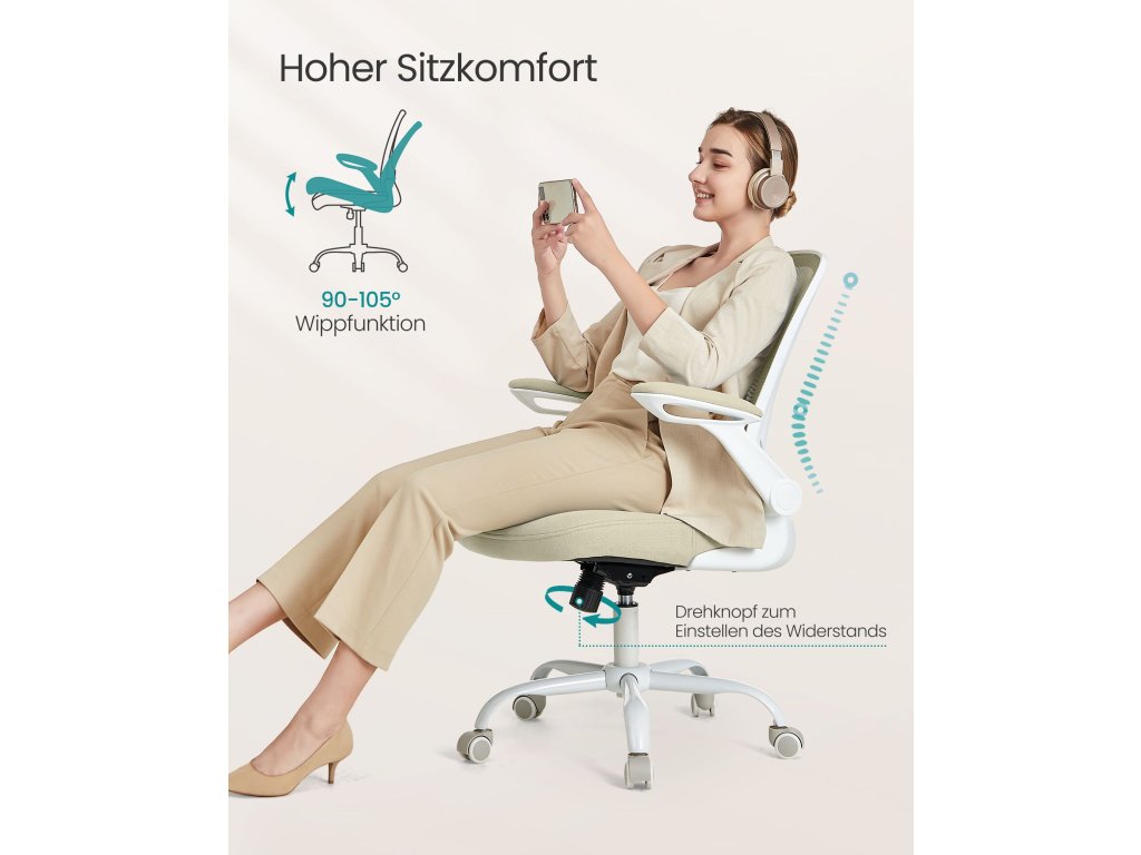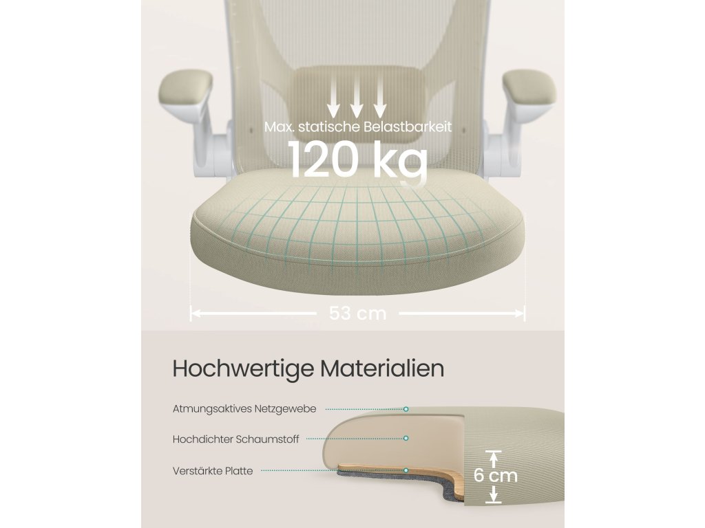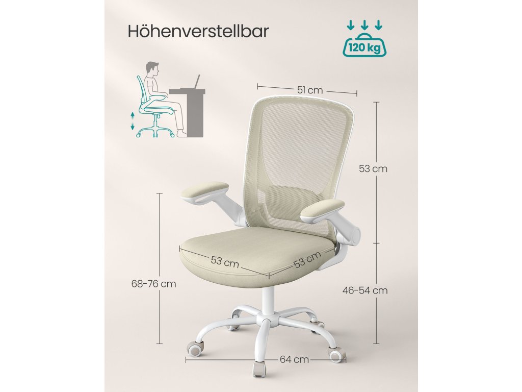 Opěradlo ve tvaru písmene S pohodlně obejme vaše záda, díky nastavitelné polstrované bederní opěrce jsou vaše záda dobře podepřena a snižují únavu. Výška sedáku a bederní opěrky je nastavitelná; područky jsou sklopné, židli můžete při používání zasunout pod stůl; můžete také aktivovat funkci houpání (90°-105°), abyste si odpočinuli. Kvalitní pěna o tloušťce 6 cm není příliš měkká a není příliš tvrdá; měkký 53 cm široký sedák zmírňuje tlak při dlouhém sezení; kvalitní tkanina je pohodlná a prodyšná. Díky kvalitní plynové vzpěře a robustní kovové základně unese tato kancelářská židle až 120 kg a nabízí pevné a stabilní držení. Tichá nylonová kolečka jsou robustní a chrání podlahu před poškrábáním. Kolečka navíc prošla testem dodavatele dílů na 100 000 cyklů (testováno dodavatelem). Barva: Béžová. Materiál: Plast, Pěna, Nylon, Ocel. Rozměry produktu: 66 x 60 x 99-107 cm. Výška sedu: 46-54 cm. Rozměry sedáku: 53 x 60 cm. Hmotnost výrobku: 11 kg. Max. nosnost: 120 kg