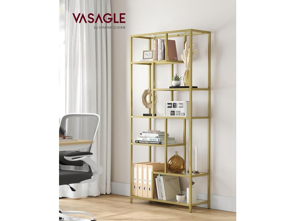 Tato knihovna geometrického tvaru o rozměrech 80 x 30 x 180 cm má police různých výšek (max. výška: 57,2 cm, min. výška: 26,4 cm), což usnadňuje ukládání drobností různých velikostí. Tuto šestipatrovou knihovnu lze použít v pracovně k uložení knih a časopisů, v obývacím pokoji k vystavení fotografií nebo ozdob nebo v kuchyni k uložení lahví a sklenic. Díky robustnímu tvrzenému sklu a oceli unese tento regál až 40 kg. Zajišťuje odolnost, stabilitu a dlouhou životnost, ať už jej ve vaší domácnosti umístíte kamkoli, a bude vám dělat společnost ve všech nadcházejících krásných časech. Tato vysoká knihovna má ve spodní části nastavitelné nožičky, díky nimž je police stabilní i na mírně nerovném povrchu; sada proti převrácení dále zvyšuje stabilitu a bezpečnost této dekorativní knihovny. Není potřeba žádné další nářadí! Díky podrobnému návodu a očíslovaným dílům můžete tento 6patrový dekorativní regál rychle sestavit a začít s dekorováním, než se nadějete. Barva: Metalicky zlatá. Rozměry produktu: 80 x 30 x 180 cm; 18,5 kg. Maximální nosnost: 40 kg. Hmotnost produktu: 18,5 kg