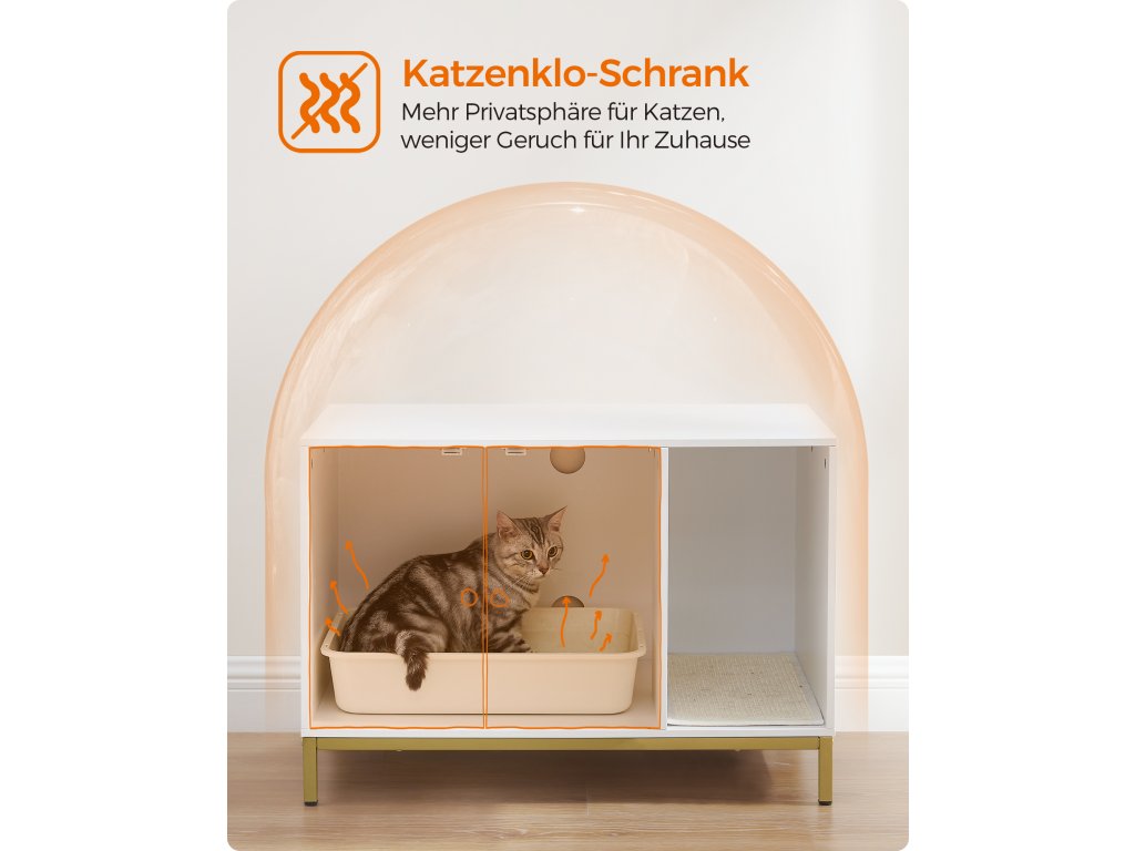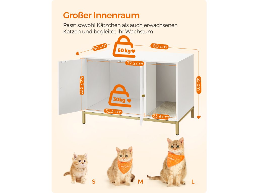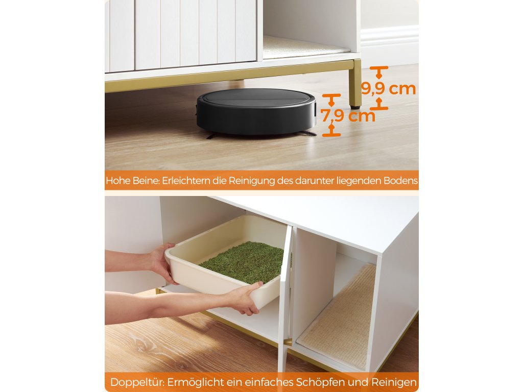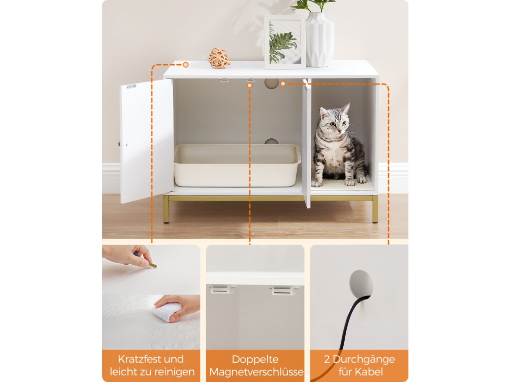 Díky bílé povrchové úpravě a zlatému kovovému rámu se tento moderní kočičí záchod snadno začlení do většiny stylů domácností a promění kdysi nepříjemný prostor kočičího záchodu v okouzlující záchod. Díky bílé povrchové úpravě a zlatému kovovému rámu se tento moderní kočičí záchod snadno začlení do většiny stylů domácností a promění kdysi nepříjemný prostor kočičího záchodu v okouzlující záchod. Rozměry vnitřní přihrádky 52 x 50 x 41,9 cm se hodí do většiny toalet. Přední vstup umožňuje instalaci na většinu míst, aniž byste se museli starat o směr. Udělejte z něj skříňku na toaletu, abyste schovali nepořádek, nebo dovnitř přidejte kočičí pelíšek pro útulný kočičí domeček a pro vaše pohodlí jej použijte jako odkládací stolek nebo televizní stolek – vy i vaše kočky se můžete o tento multifunkční kus kočičího nábytku podělit. Díky podrobným pokynům a označeným dílům budete mít vše připravené do 30 minut. 2 dvířka umožňují snadné nabírání a vysoké nohy usnadňují čištění prostoru pod ním. Barva: Bílá, Zlatá. Materiál: Dřevotříska, Ocel. Rozměry výrobku: 80 x 50 x 55 cm. Hmotnost výrobku: 16,3 kg. Max. statická nosnost horní části: 60 kg. Max. statická nosnost spodní části: 30 kg