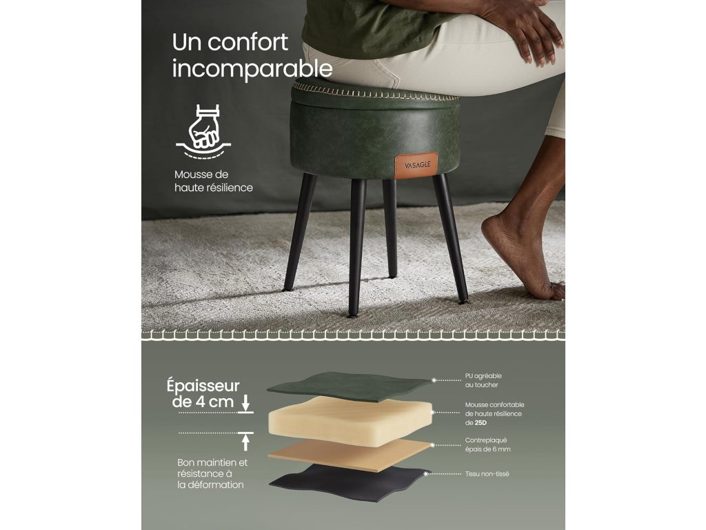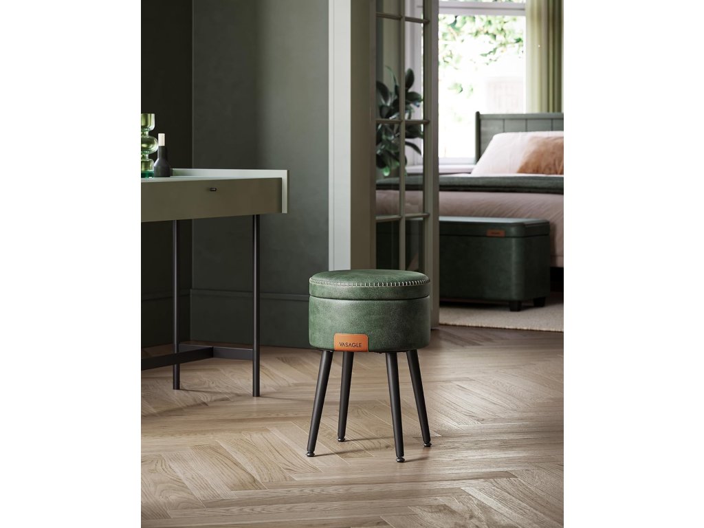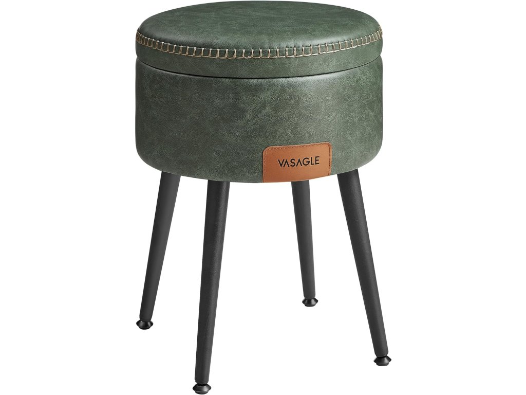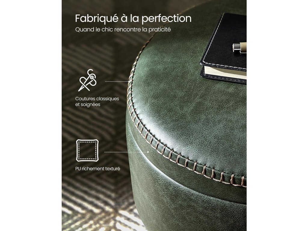 Díky čalounění z PU, rafinovanému prošívání a kuželovým nohám je taburet hmatatelnou poctou řemeslnému duchu, který pozvedne váš domov na jinou úroveň. Kulatý úložný sedák s ocelovými nohami, nosnost 150 kg, umělá kůže s prošíváním
