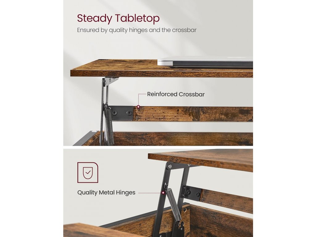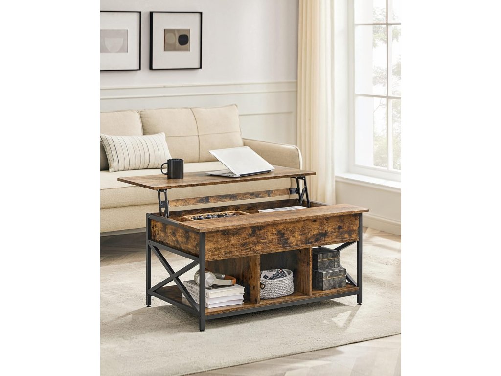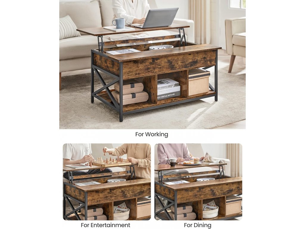 Zvedněte desku tohoto stolku dopředu. Můžete tak pracovat z pohodlí domova, surfovat na internetu, vychutnávat si chutné jídlo nebo vyrábět, zatímco sedíte na gauči. 3 otevřené přihrádky umožňují snadný přístup ke knihám a dalším drobnostem. Přihrádka pod horní deskou umožňuje uložit předměty, které chcete skrýt Stabilní držení: Díky kvalitním kovovým pantům a zesílené příčné desce se deska tohoto stolku do obývacího pokoje zvedá a spouští jemně a bez viklání. Černé ocelové nohy ztělesňují elegantní industriální styl, velbloudí hnědá stolová deska přináší teplo a X-šrouby dodávají stolku jedinečný charakter. Vylepšete svůj pokoj tímto rozkládacím stolkem! Snadná montáž a čištění: Pomocí označených dílů a jasného návodu tento konferenční stolek snadno sestavíte. Povrch je voděodolný, takže jej stačí očistit vlhkým hadříkem, když se zašpiní.