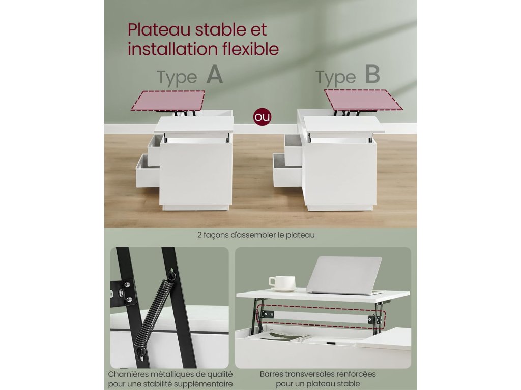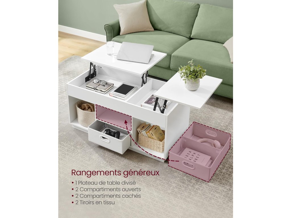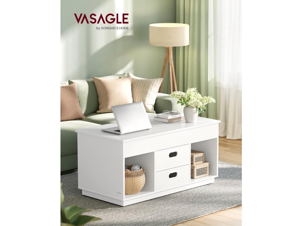 Díky obousměrnému zvedacímu mechanismu umožňuje tento konferenční stolek vytvořit 2 samostatné prostory. Nejširší část lze umístit směrem k zásuvce nebo na druhou stranu, aby se vešla na vaši pohovku. Stůl a 2 otevřené přihrádky umožňují přístup k předmětům denní potřeby. 2 skryté přihrádky a 2 zásuvky poskytují prostor pro diskrétní a uspořádané uložení knih, dálkových ovladačů a dalších předmětů. Kovové panty a zesílené příčníky tohoto konferenčního stolku umožňují tiché a vyvážené zvedání a spouštění desky stolu, čímž poskytují stabilní oporu a minimalizují riziko skřípnutí. Díky modernímu a elegantnímu designu a čistým liniím tento konferenční stolek vylepší celkovou výzdobu vašeho prostoru. Používejte jej jako konferenční stolek pro snadný přístup k věcem, když ležíte na pohovce, jako jídelní stůl k jídlu nebo jako psací stůl pro vylepšení vašeho pracovního zážitku. Barva: Sněhobílá. Materiál: Ocel, dřevotříska. Rozměry: 50 x 100 x 48/62,3 cm. Hmotnost: 27,5 kg. Maximální statická nosnost: 75 kg. Maximální statická nosnost desky stolu ve zvednutém stavu: 15 kg.