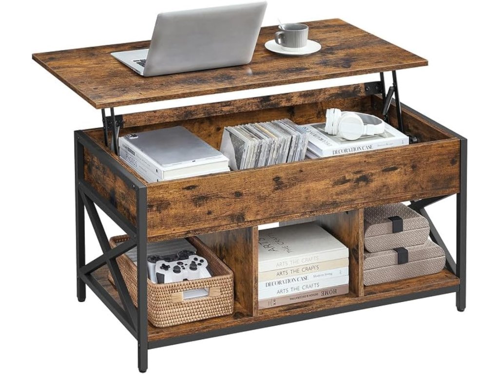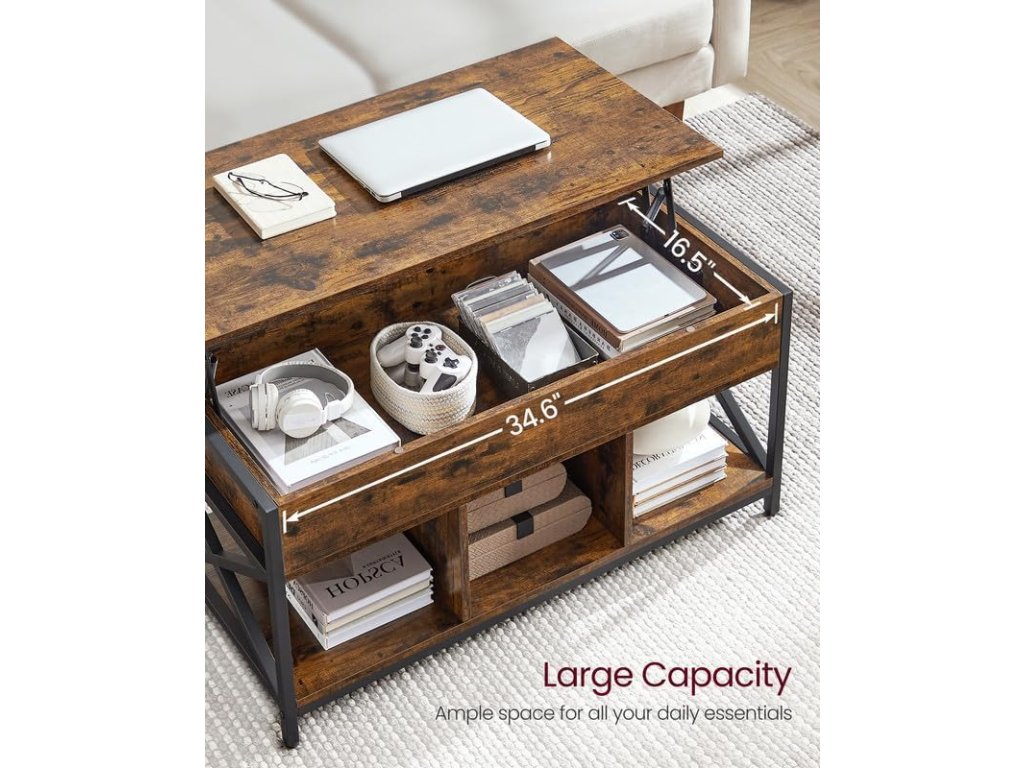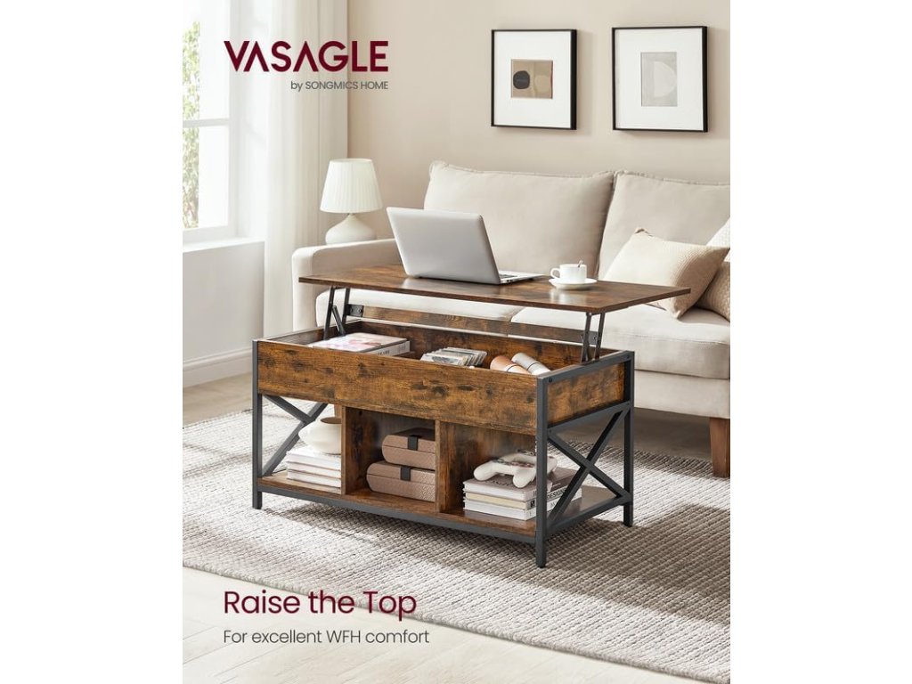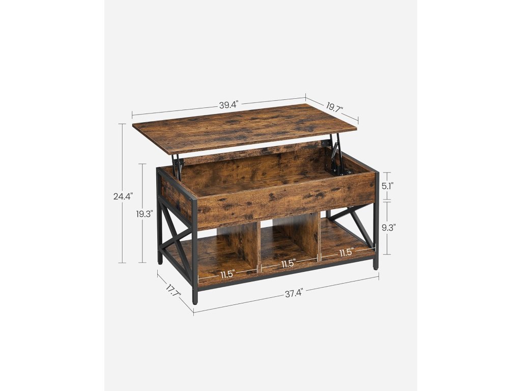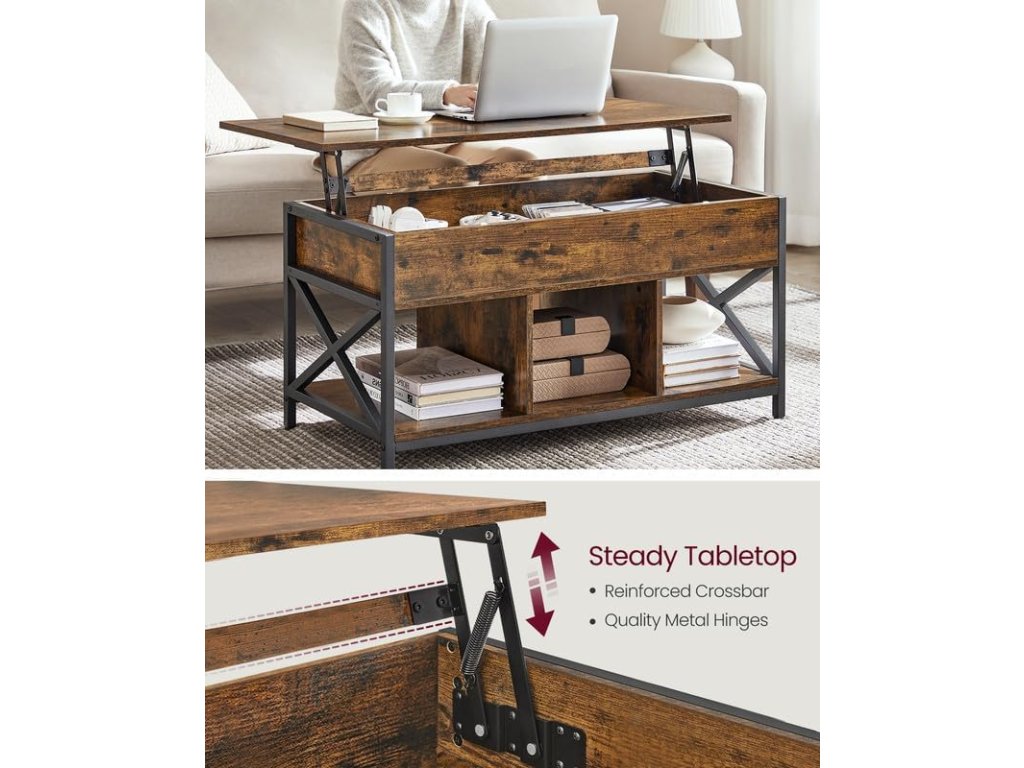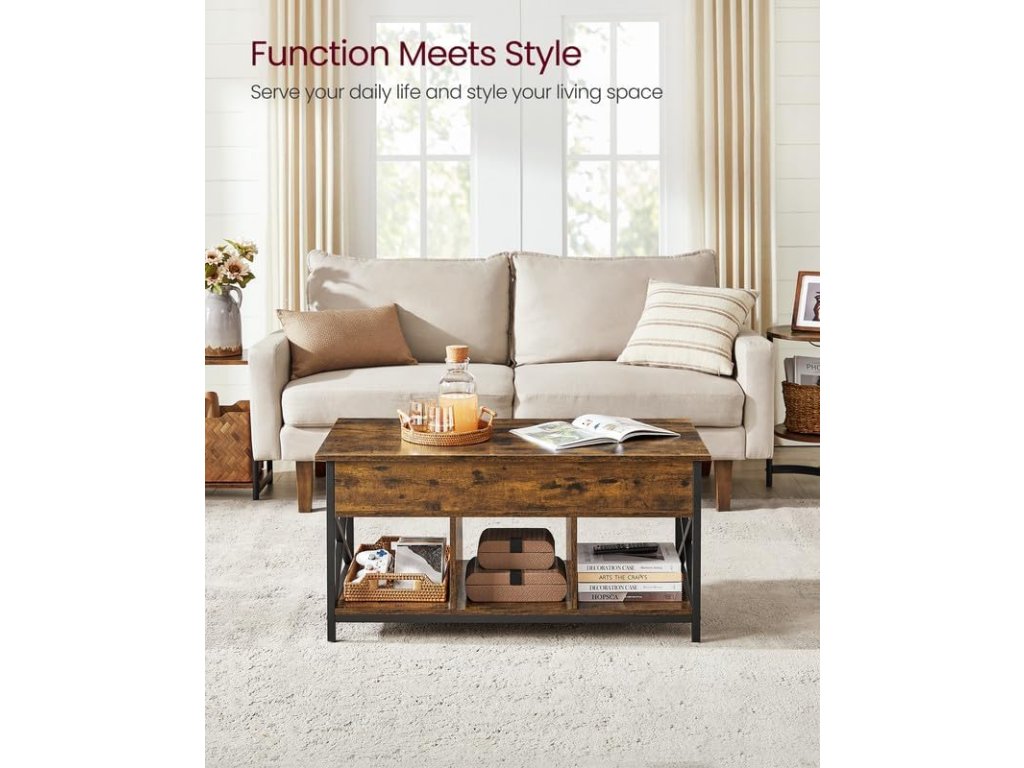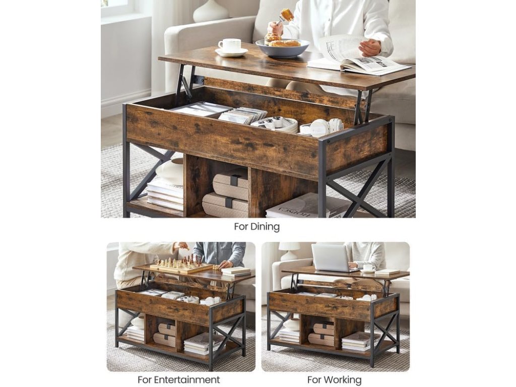 Zvedněte horní část tohoto konferenčního stolku a usnadněte si práci z domova, vychutnávání jídla, tvoření nebo hraní her pohodlně na gauči. Obývací stůl má skrytou přihrádku a 3 otevřené přihrádky, ideální pro uložení knih, časopisů, her a dek, které udrží váš obývací pokoj organizovaný a uklizený. Robustní ocelový rám zajišťuje stabilitu a pevnost tohoto konferenčního stolku s výklopnou deskou. Kvalitní kovové panty a zesílená příčka udržují desku stolu stabilní, když ji zvednete. Černé ocelové nohy vyzařují chladný industriální nádech, rustikální hnědá deska stolu prostor prohřívá a tyče ve tvaru X dodávají osobitý nádech. Tento industriální konferenční stolek jistě oživí váš obývací prostor. Číslované díly a srozumitelný návod vám pomohou snadno sestavit tento rustikální konferenční stolek. Dýha desky stolu je voděodolná, takže ji stačí otřít vlhkým hadříkem, když se zašpiní. Barva: Rustikální hnědá, černá. Materiál: Ocel, dřevotříska. Rozměry výrobku: 50 x 100 x 49–62 cm. Hmotnost výrobku: 25,9 kg. Max. statické zatížení desky stolu: 45,4 kg. Max. statické zatížení skryté přihrádky: 22,5 kg. Celkové max. statické zatížení 3 otevřených přihrádek: 22,5 kg