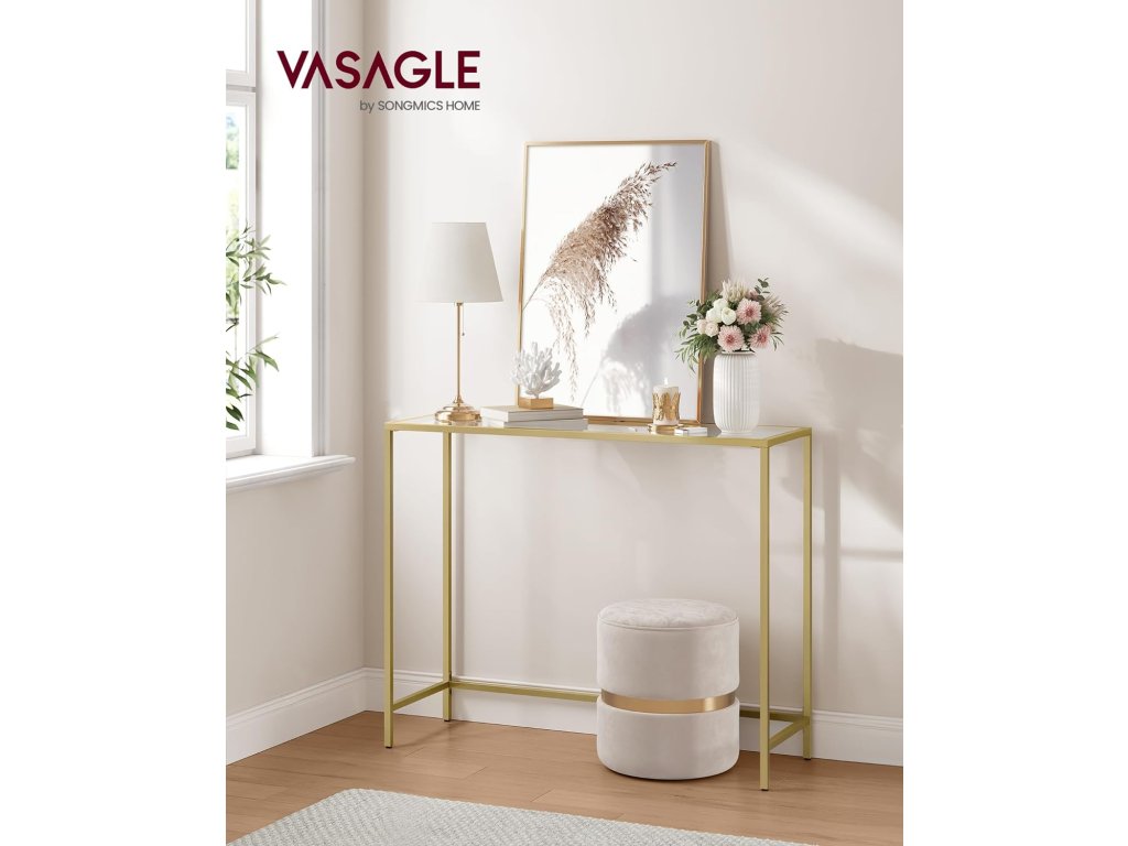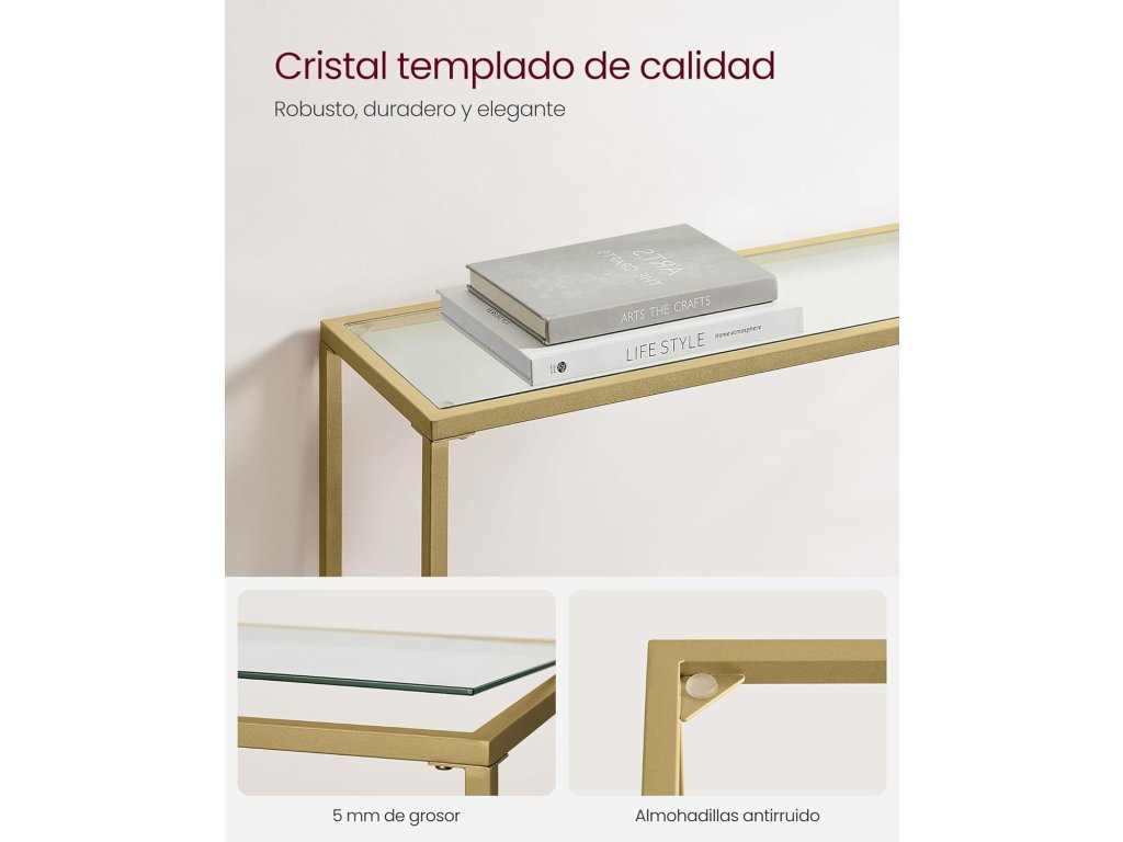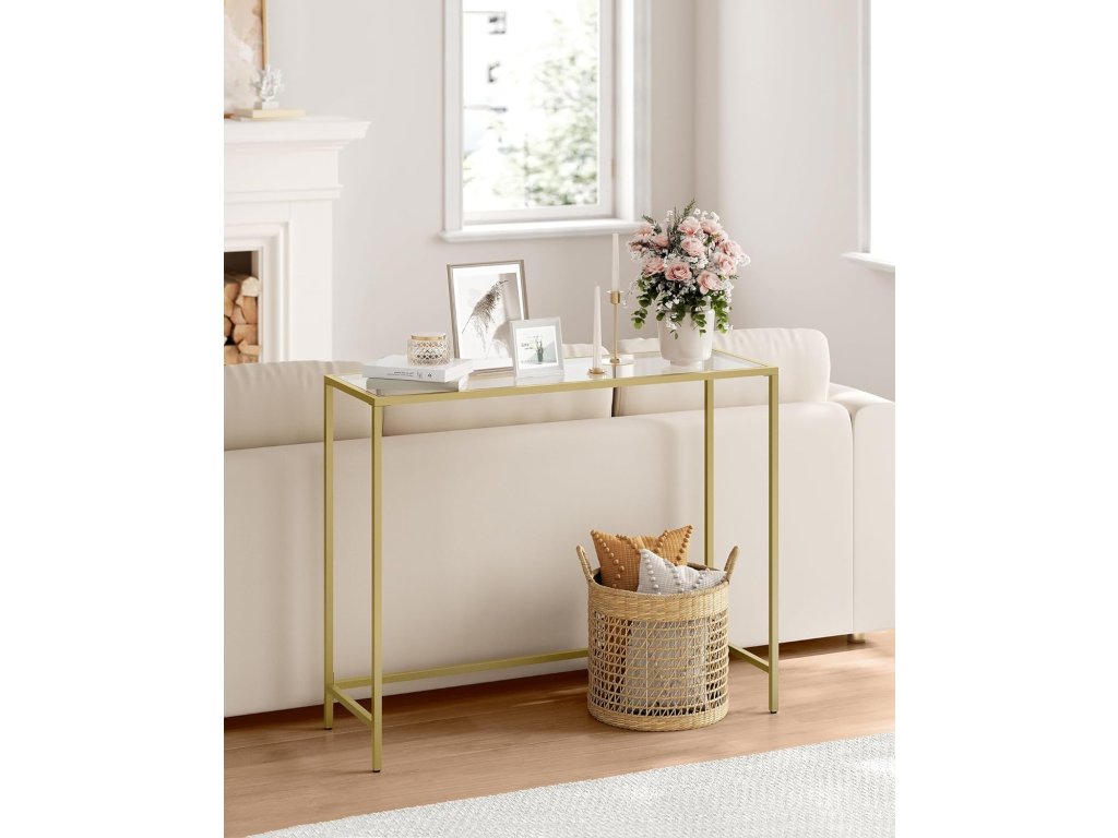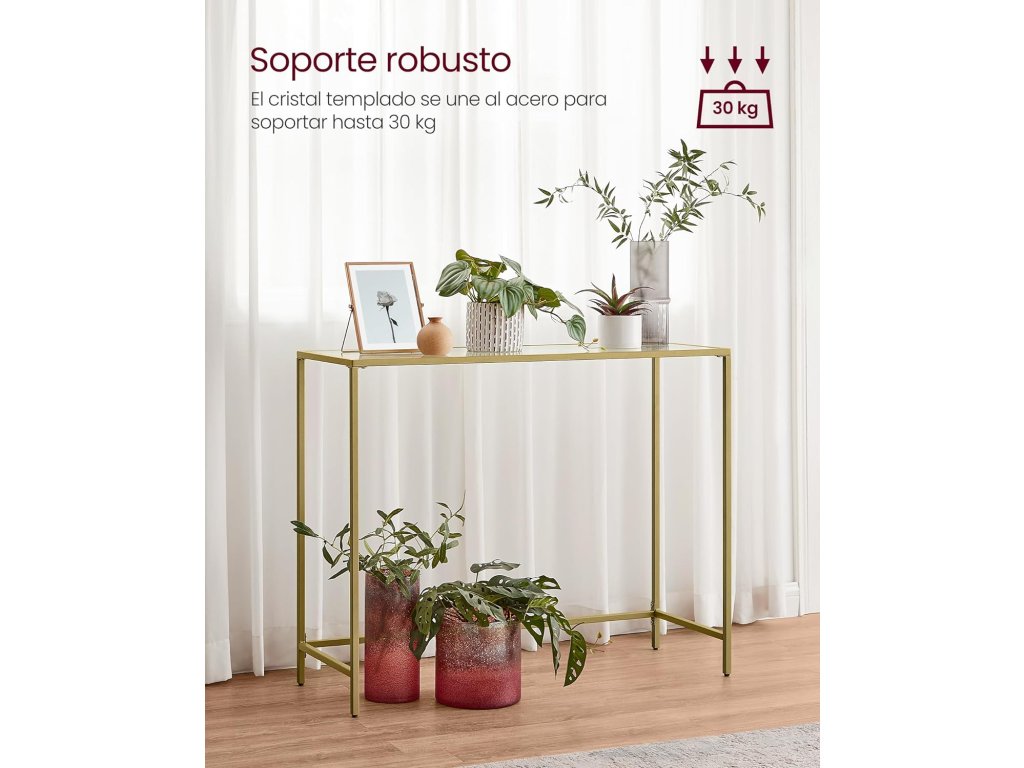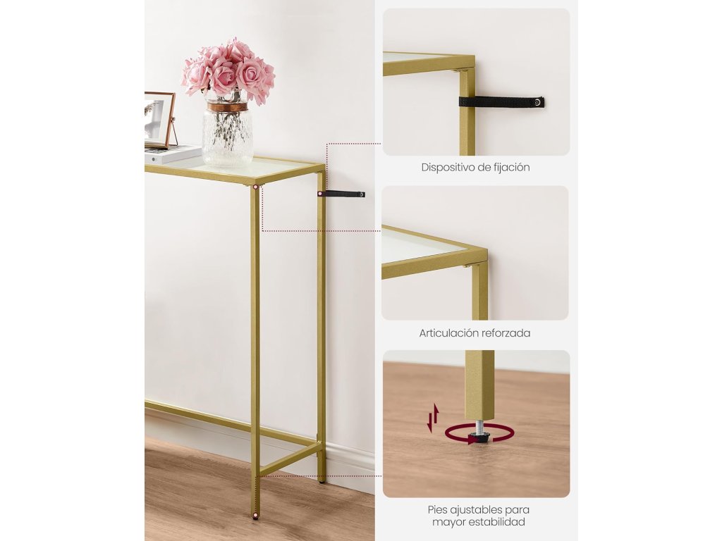 Na kovovém rámu tohoto konzolového stolku je umístěna 5 mm silná deska z tvrzeného skla, která poskytuje pevnou oporu až pro 30 kg rostlin, dekorací, knih nebo rámečků s obrázky. fotografie. Nastavitelné nohy