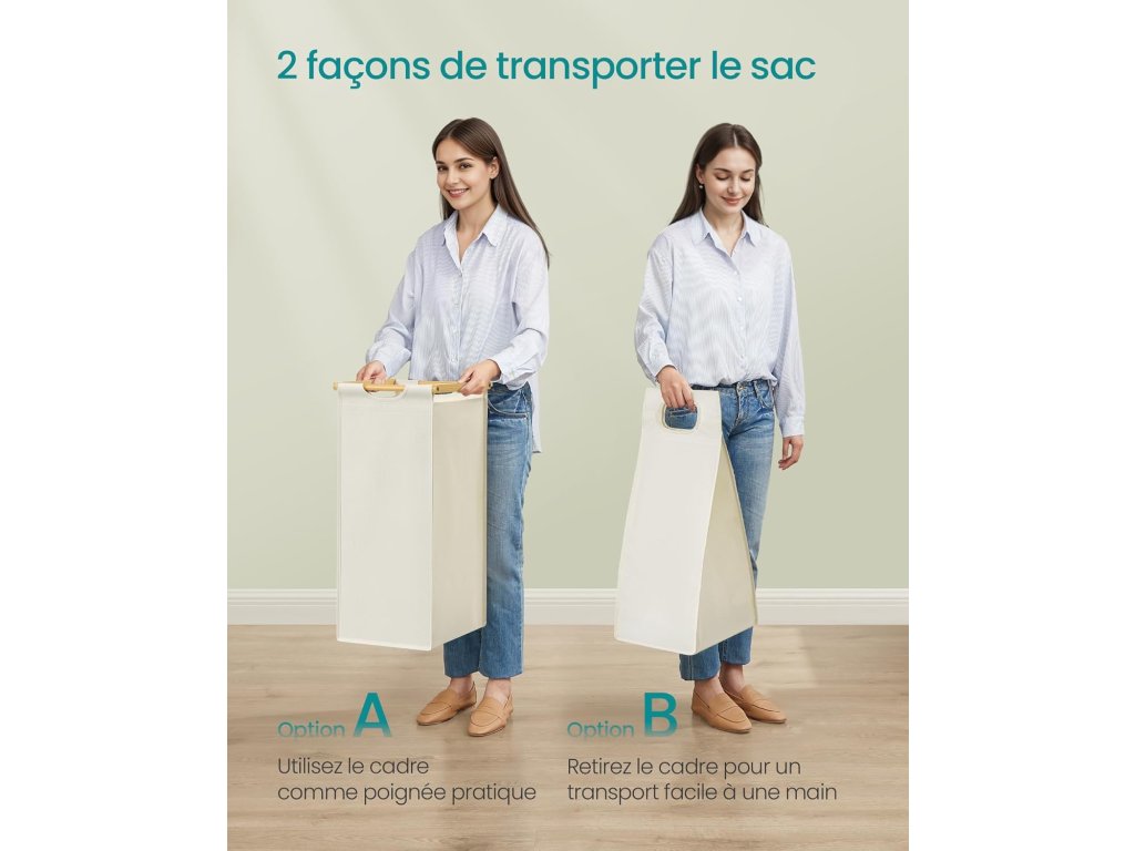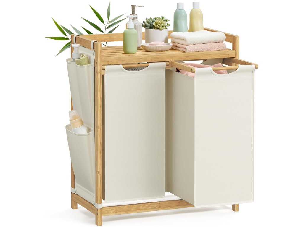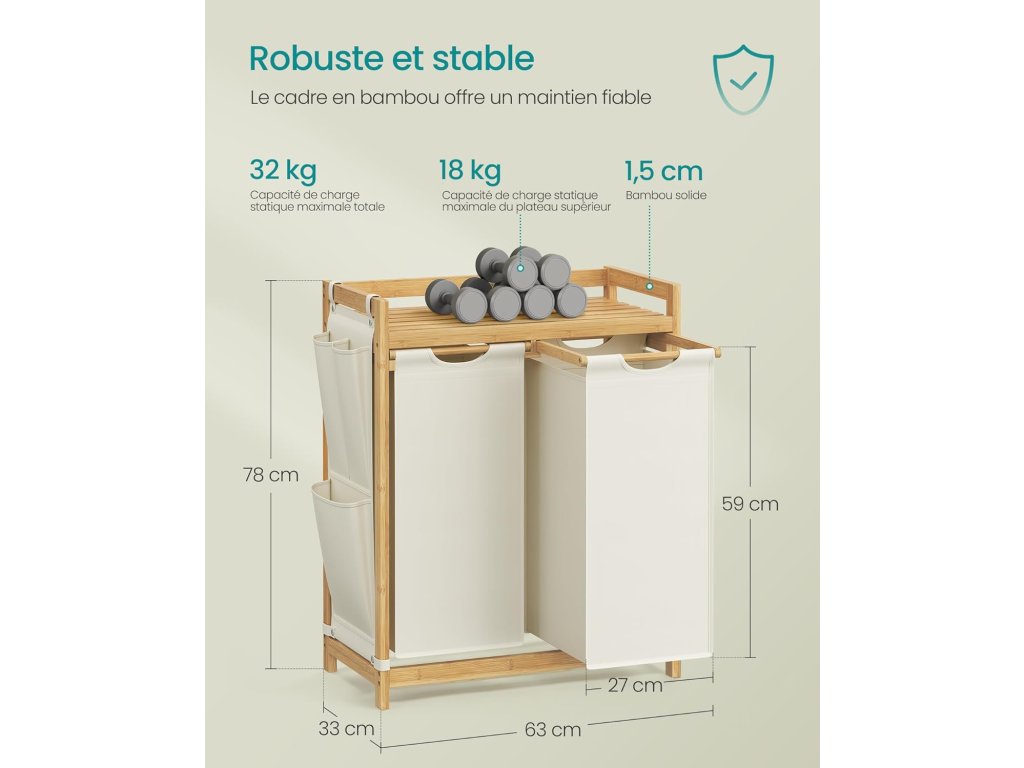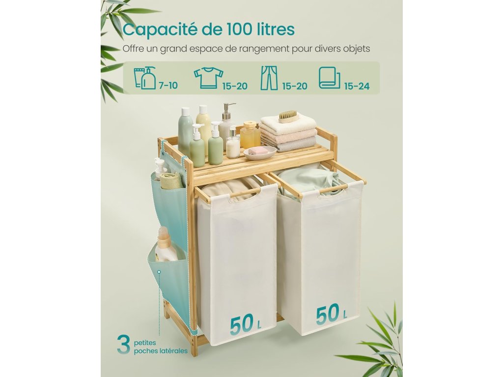 Tento koš na prádlo má celkový objem 100 l (50 l na každý pytel). Dvoudílná konstrukce umožňuje třídit prádlo podle typu nebo oddělit světlé od tmavého. Na police můžete ukládat prací prostředky, síťky na prádlo a další předměty. Malé boční kapsy poskytují další prostor pro uložení drobných předmětů. Koš na špinavé prádlo je vyroben z vysoce kvalitního bambusu, což je velmi pevný materiál (police unesou až 18 kg). Boční kryty zabraňují pádu předmětů. Vyjímatelná a pratelná taška: taška se neprohýbá, protože je držena plastovým panelem ve spodní části. Díky suchým zipům ji můžete snadno vyjmout a vyprat. Rám koše vyrobený z přírodního bambusu vnese do vašeho domova přirozenou a harmonickou atmosféru a hodí se k různým stylům dekorace. Barva: krémově bílá. Materiál: Bambus, oxfordská tkanina Celkové rozměry: 63 x 33 x 78 cm. Rozměry každého sáčku na prádlo: 31 x 27 x 59 cm. Hmotnost: 5,8 kg. Maximální zatížení: celkové statické zatížení: 32 kg. Zatížení každého sáčku na prádlo: 7 kg. Zatížení police: 18 kg.