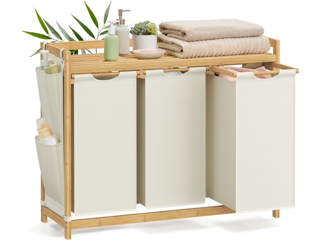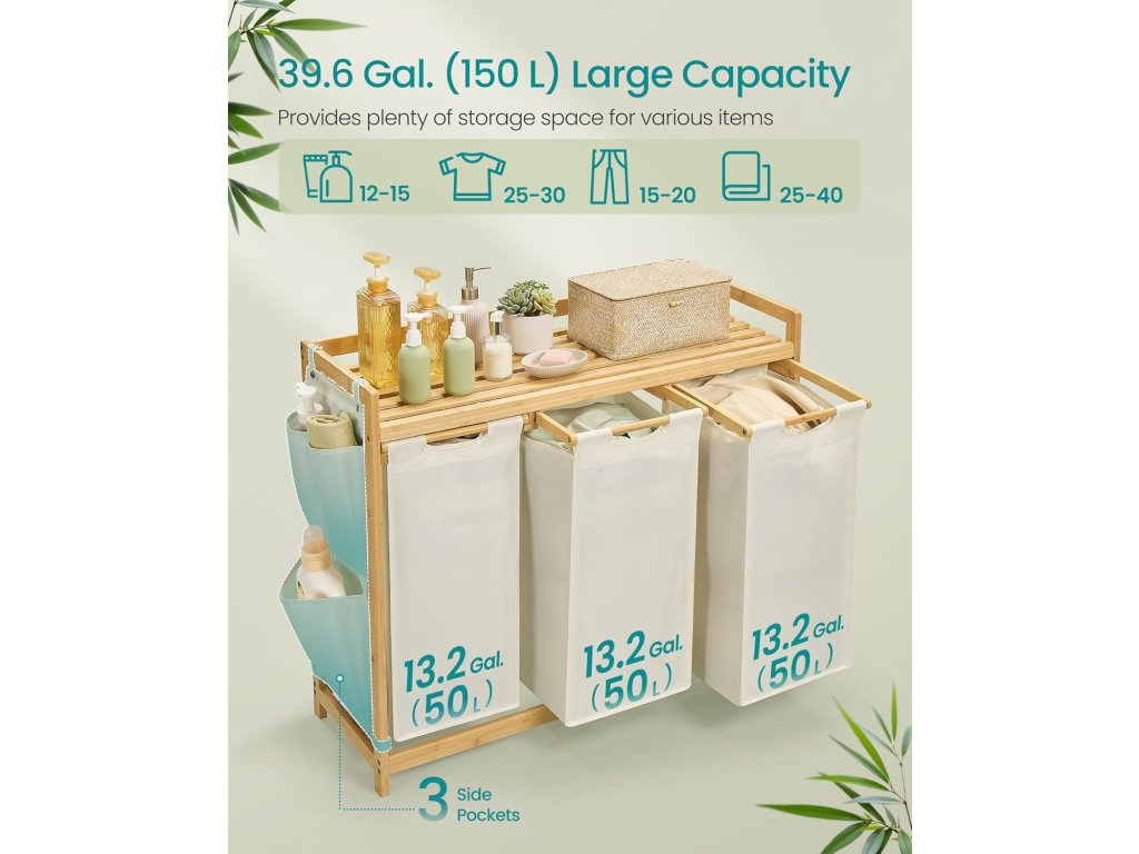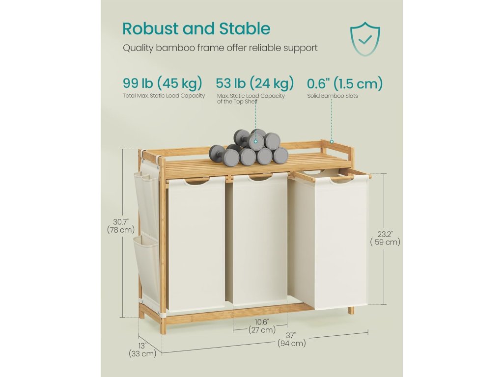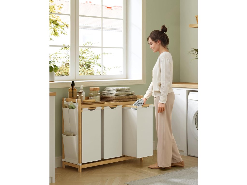 Koš na prádlo se pyšní celkovou kapacitou 150 litrů, přičemž každá vložka pojme 50 litrů. Jeho třípásmová konstrukce umožňuje uspořádat prádlo podle typu a oddělit světlé prádlo od tmavého. Horní police poskytuje praktické místo pro uložení pracího prostředku, sítěk na prádlo a dalších věcí. Kompaktní boční kapsy nabízejí další prostor pro drobné předměty. Třídič prádla je vyroben z prvotřídního bambusu, je robustní a odolný a horní police unese až 24 kg. Police je opatřena boční ochranou, která zabraňuje pádu předmětů. Každá vložka je vybavena plastovým spodním panelem, který zabraňuje prohýbání, a díky suchému zipu můžete vložky bez námahy vytáhnout a odstranit a snadno je přenést do pračky. Rám tohoto 3sáčkového koše na prádlo je vyroben z vybraného bambusu. vyzařuje přirozenou a harmonickou atmosféru a bezproblémově se hodí do různých stylů interiéru vašeho domova. Barva: Krémově bílá. Materiál: Bambus, oxfordská látka. Rozměry výrobku: 94 x 33 x 78 cm. Velikost každé vložky: 31 x 27 x 59 cm. Hmotnost výrobku: 7,9 kg. Max. statická nosnost celkem: 45 kg. Max. statická nosnost každé vložky: 7 kg. Max. statická nosnost police: 24 kg