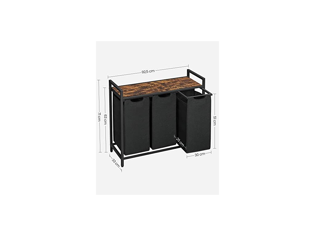 Tříkomorový koš na prádlo s policí, 92,5 x 33 x 72 cm, 3 x 38 l, rustikálně hnědý a černý