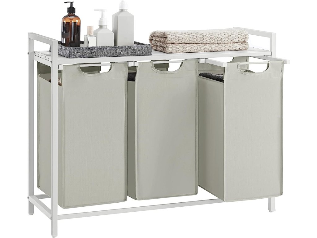 Tříkomorový koš na prádlo s policí, 92,5 x 33 x 72 cm, 3 x 38 l, bílý