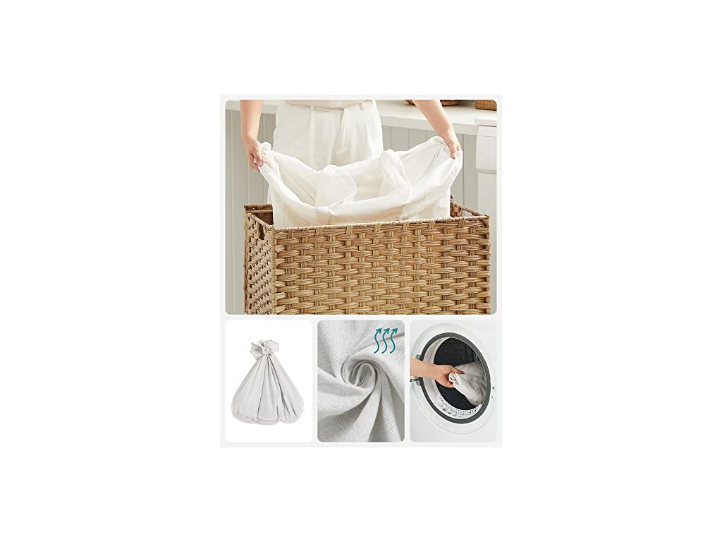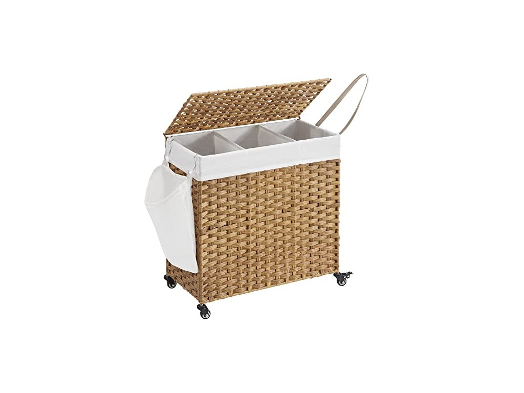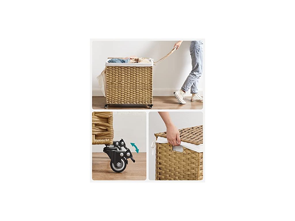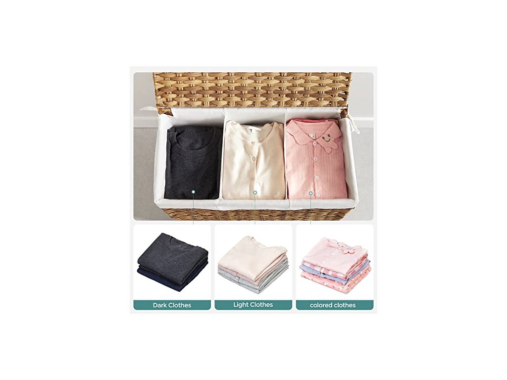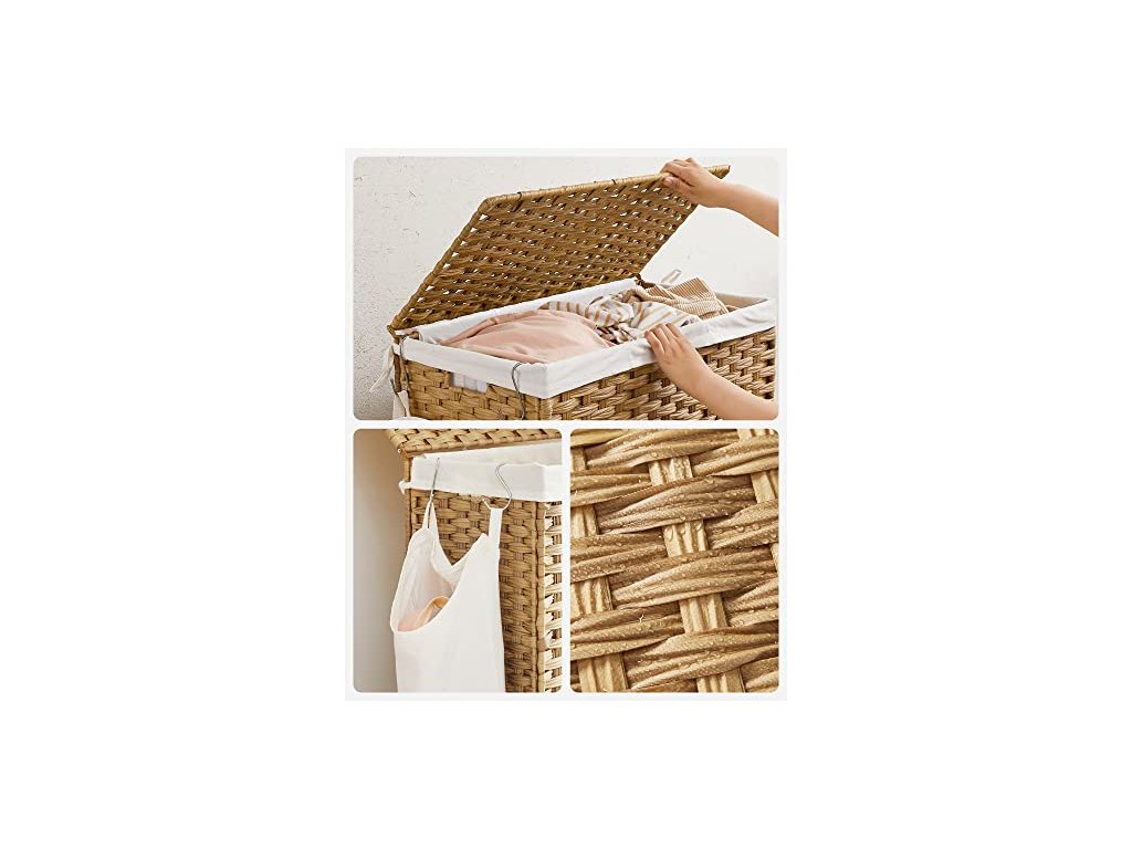 Koš na prádlo má rozměry 66 x 33 x 60 cm a velkou kapacitu 140 l. Přihrádky vám pomohou roztřídit světlé, tmavé a choulostivé oblečení pro snadné čištění a skladování. Ručně tkaný koš na prádlo, 140 l, v ratanovém stylu, 3 přihrádky, vyjímatelná vložka, madla, víko