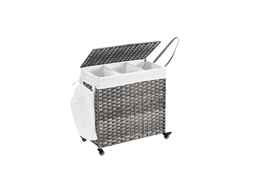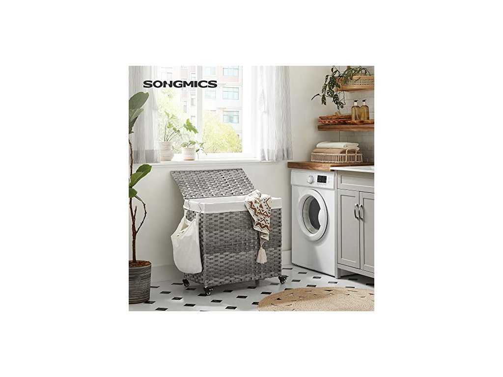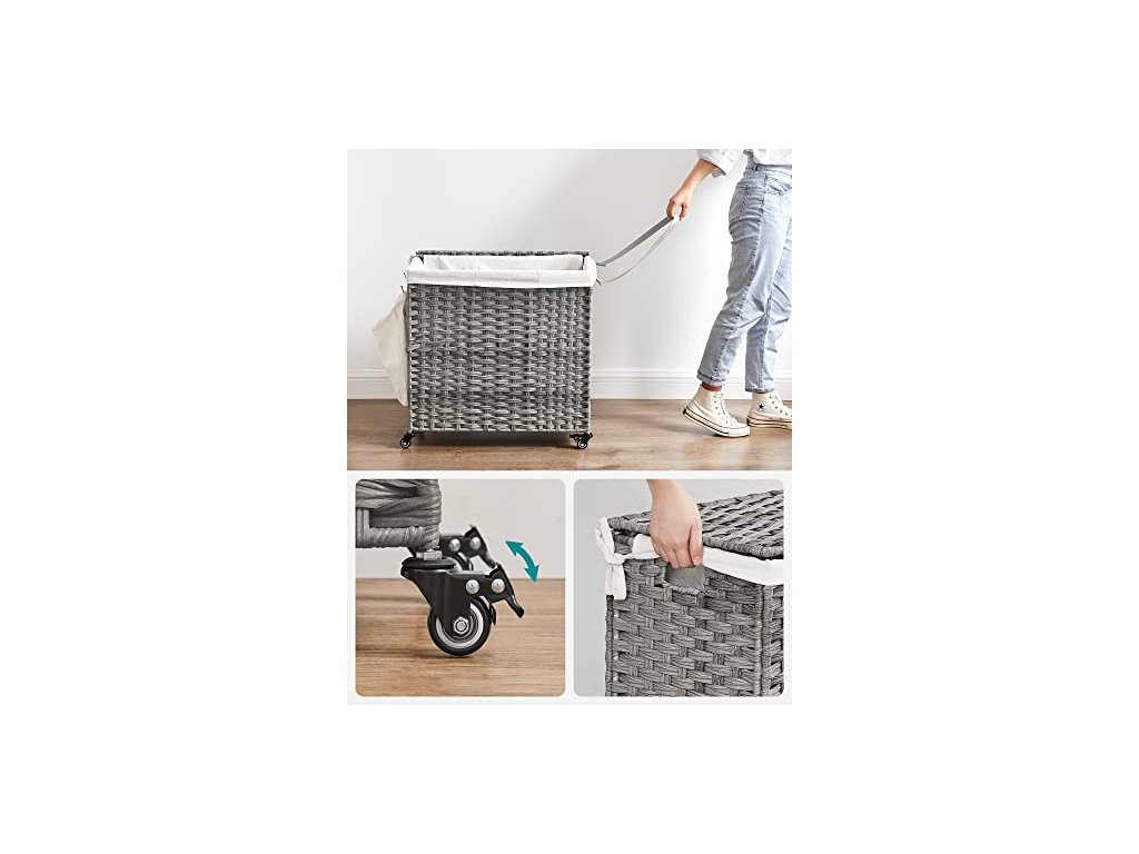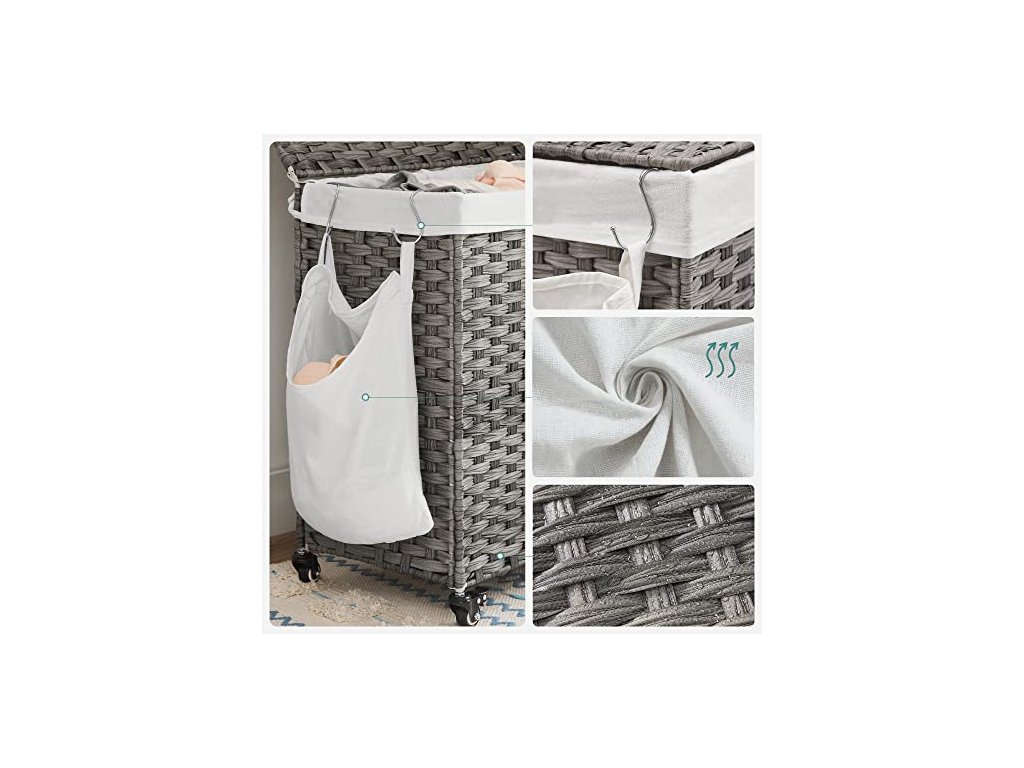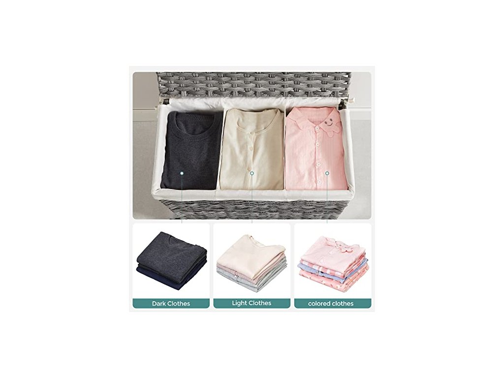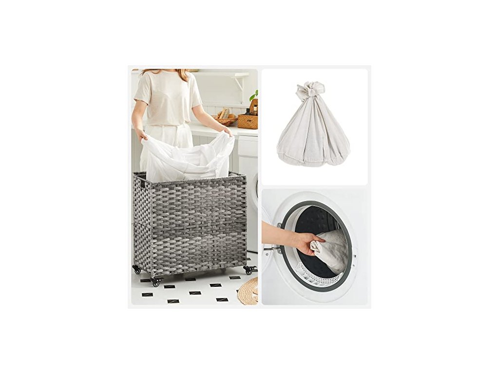 Koš na prádlo má rozměry 66 x 33 x 60 cm a velkou kapacitu 140 l. Přihrádky vám pomohou roztřídit světlé, tmavé a choulostivé oblečení pro snadné čištění a skladování. Ručně tkaný koš na prádlo, 140 l, v ratanovém stylu, 3 přihrádky, vyjímatelná vložka, madla, víko
