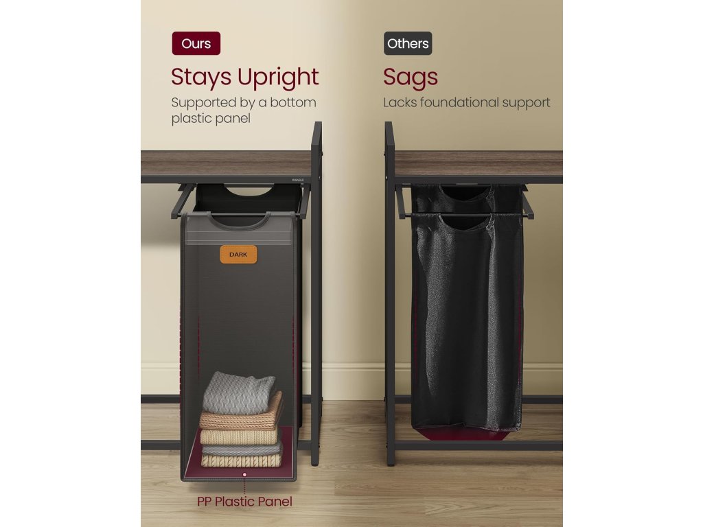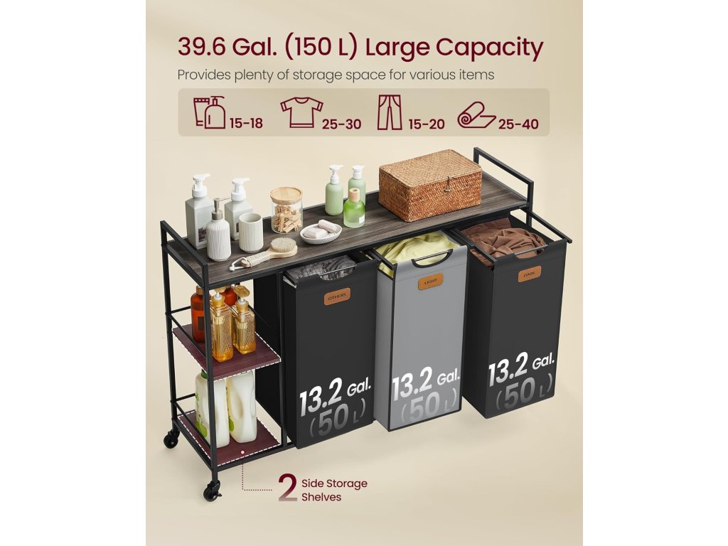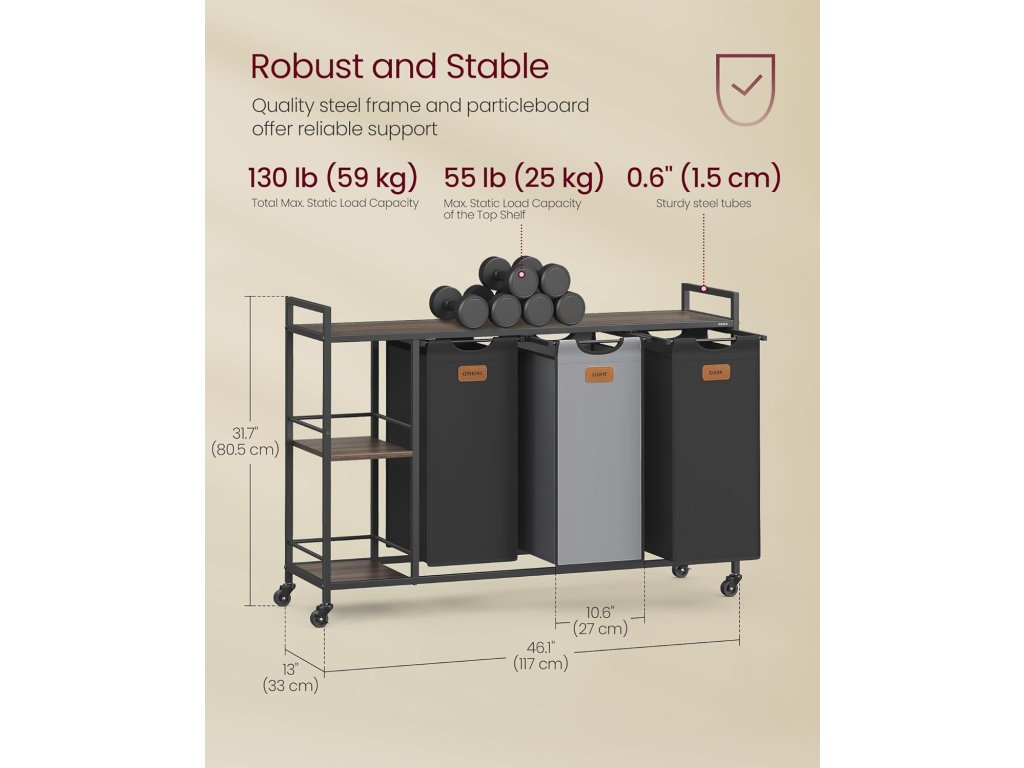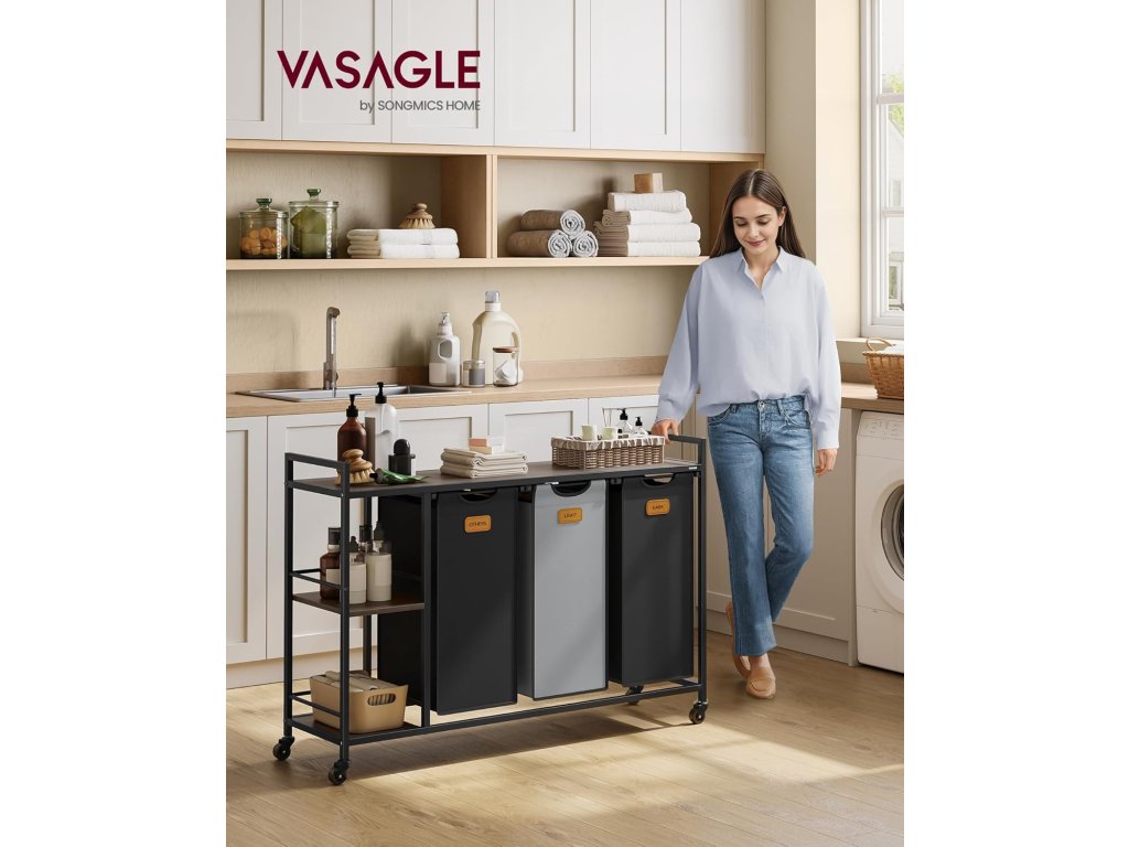 Tento prádelní vozík obsahuje tři koše o objemu 50 litrů, které nabízejí prostor pro 150 litrů prádla. 3 police poskytují úložný prostor pro prací prostředek, pytle na prádlo a další. Všechno má své místo. S 6 přiloženými štítky můžete snadno třídit prádlo. Štítky se snadno připevňují suchým zipem a různobarevné koše na prádlo třídění usnadňují. S tímto košem na prádlo se 4 kolečky, z nichž 2 mají brzdu, snadno pohybuje a zajistí. Vložky se snadno vyjímají a přepravují díky suchým zipům a praktickým rukojetím. Ocelové trubky o rozměrech 1,5 x 1,5 cm, kvalitní dřevotříska a voděodolná oxfordská tkanina činí tento třídič prádla robustním a odolným. Místo koleček můžete také připevnit 4 nastavitelné nožičky, aby byl stabilní a bezpečně upevněn na jednom místě. Díky označeným komponentům a srozumitelným pokynům je sestavení tohoto vozíku na prádlo hračka, takže můžete začít s organizací prádla bez prodlení. Barva: Kaštanovo hnědá, inkoustově černá, holubí šedá. Materiál: Dřevotříska, ocel, Oxfordská látka. Rozměry výrobku: 117 x 33 x 80,5 cm. Hmotnost výrobku: 13 kg. Max. statická nosnost horní police: 25 kg. Max. statická nosnost každé malé spodní police: 5 kg. Max. statická nosnost každého koše: 8 kg. Max. statická nosnost celkem: 59 kg
