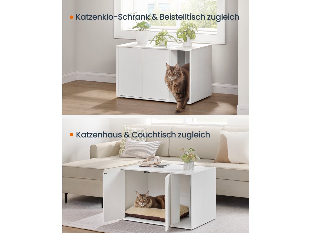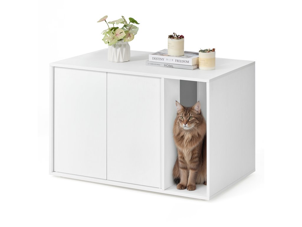 Díky medově hnědé a rustikálně bílé povrchové úpravě a unikátním dvířkům do stodoly se tento záchod snadno začlení do většiny stylů domácností a promění nepříjemný pohled v pastvou pro oči. Díky uzavřenému prostoru má vaše kočka soukromé místo, kde se cítí bezpečně, aby mohla odpovědět na volání přírody, a vy máte méně nepříjemného nepořádku – řešení výhodné pro všechny! S vnitřními rozměry 50 x 50 x 46,5 cm hlavní části se do ní vejde většina kočičích toalet. Nebo můžete přepážku odstranit a vytvořit tak větší prostor. Vnější rozměry: 80 x 53 x 50 cm (poznámka: po odstranění přepážky se maximální nosnost horní části změní ze 60 kg na 10 kg). Udělejte z něj skříňku na toaletu, abyste schovali nepořádek, přidejte dovnitř kočičí pelíšek pro útulný kočičí domeček nebo ho doplňte krásnými rostlinami, které oživí váš domov – můžete ho využít mnoha způsoby. Vaše kočka se už nemůže dočkat, až si vyzkouší skrytou toaletu? Žádné starosti. Díky podrobným pokynům a označeným dílům ji budete mít připravenou do 20 minut. Barva: Medově hnědá a rustikálně bílá. Materiál: Dřevotříska, MDF (středně hustá dřevovláknitá deska). Rozměry výrobku: 80 x 53 x 50 cm. Hmotnost výrobku: 15,9 kg. Max. statická nosnost horní části (s vnitřní přepážkou): 60 kg. Max. statická nosnost horní části (bez vnitřní přepážky): 10 kg. Max. statická nosnost dna: 30 kg