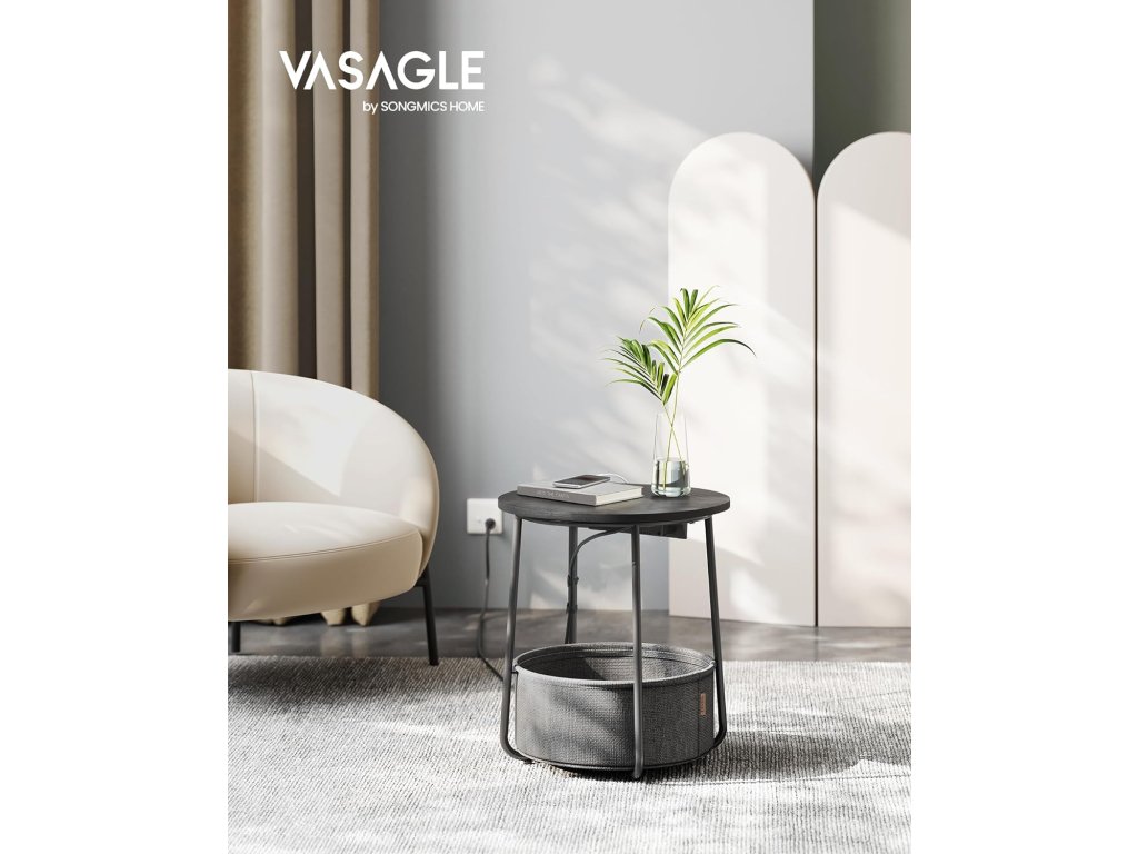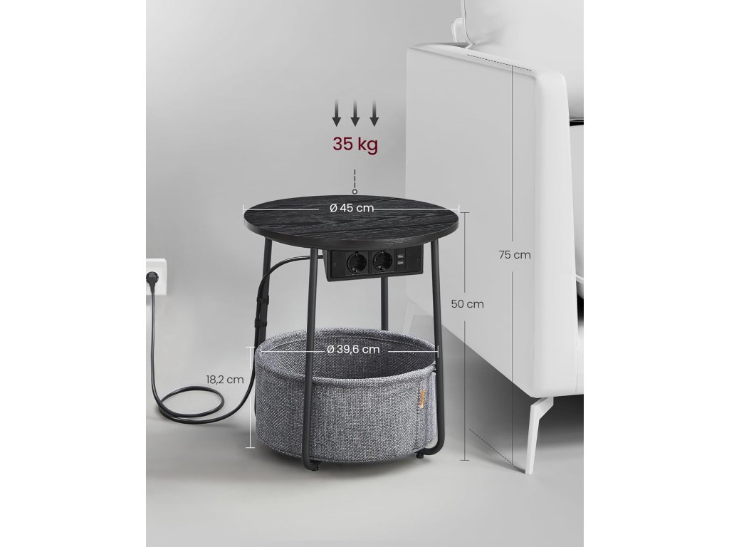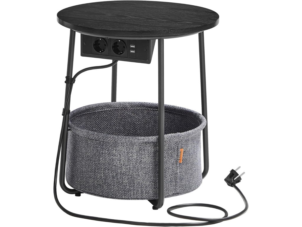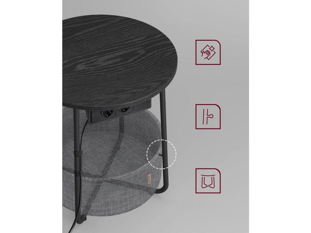 Tento stůl poslouží jako odkládací stolek v obývacím pokoji nebo jako noční stolek v ložnici. Nabízí nový úložný prostor, aniž by zabíral místo. Stolek s látkovým košem a napájecí lištou