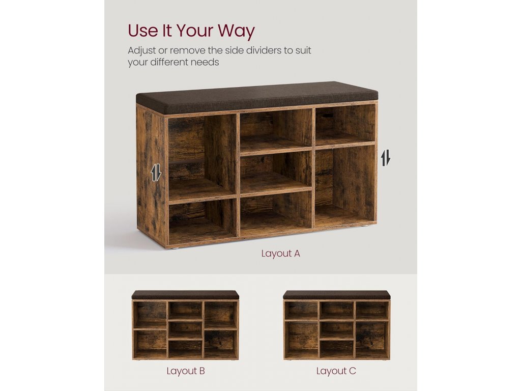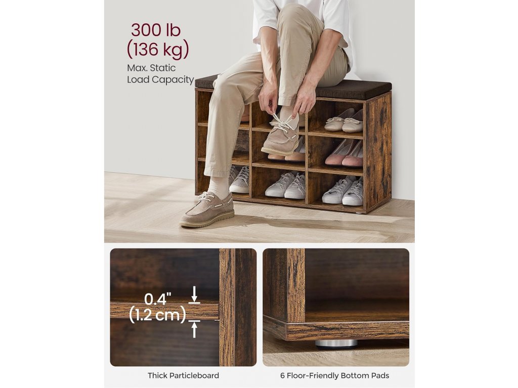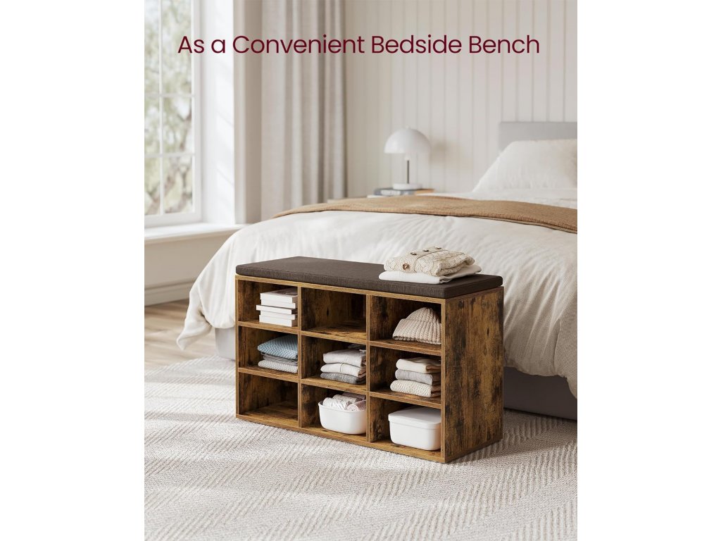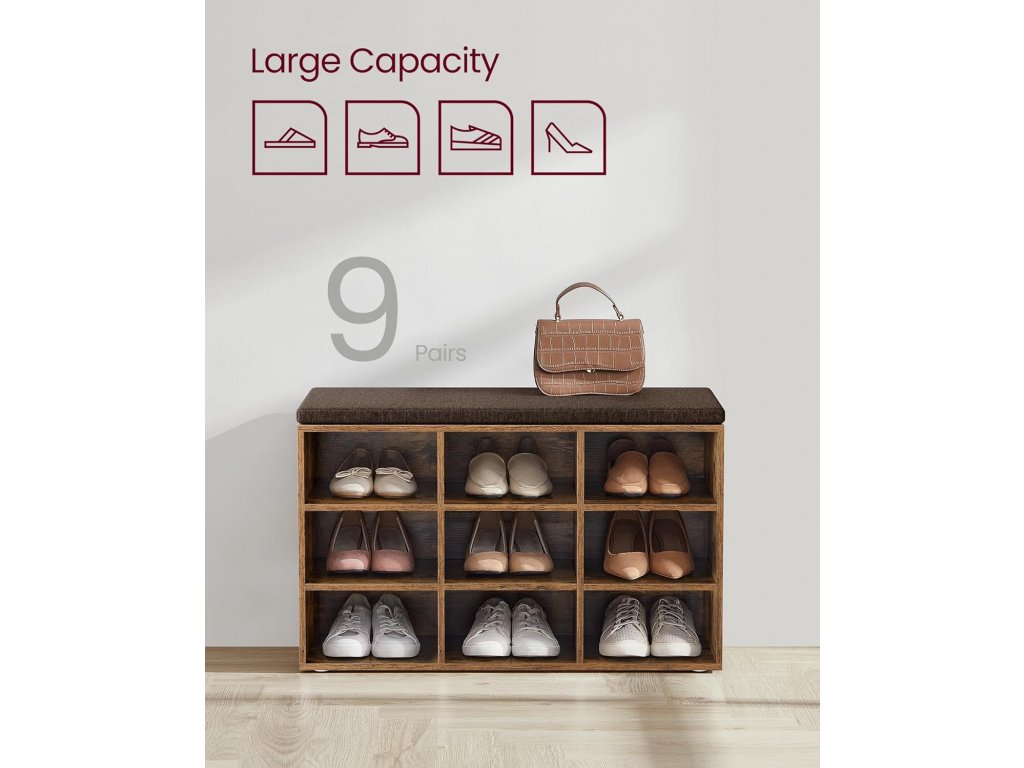 Tato lavice má 9 uzamykatelných skříněk o rozměrech 29,7 x 24,5 cm, které pojmou až 9 párů bot; Přepážky po stranách jsou nastavitelné a odnímatelné a poskytují vám více prostoru pro uložení bot a košíků. Tato úložná lavice je vyrobena z 12mm dřevotřísky a unese až 136 kg, takže se nemusíte bát, že se při sezení převrátí. 6 podložek chrání podlahu před poškrábáním. Polstrované sedadlo umožňuje pohodlné sezení. Polštář je připevněn suchým zipem a lze jej snadno sejmout. Potah z lněné látky se zipem je odnímatelný. S montáží této botníku se nemusíte starat. Číslované díly a ilustrovaný návod vám pomohou s její snadnou montáží. Ať už v chodbě jako botník, v obývacím pokoji jako úložný prostor nebo jako konec postele - tato praktická a stylová lavička se skvěle hodí.