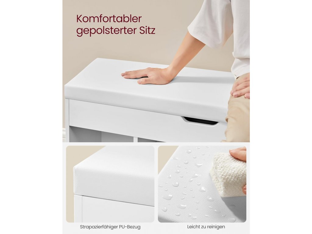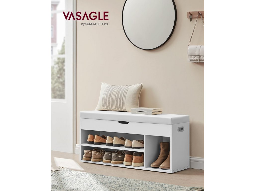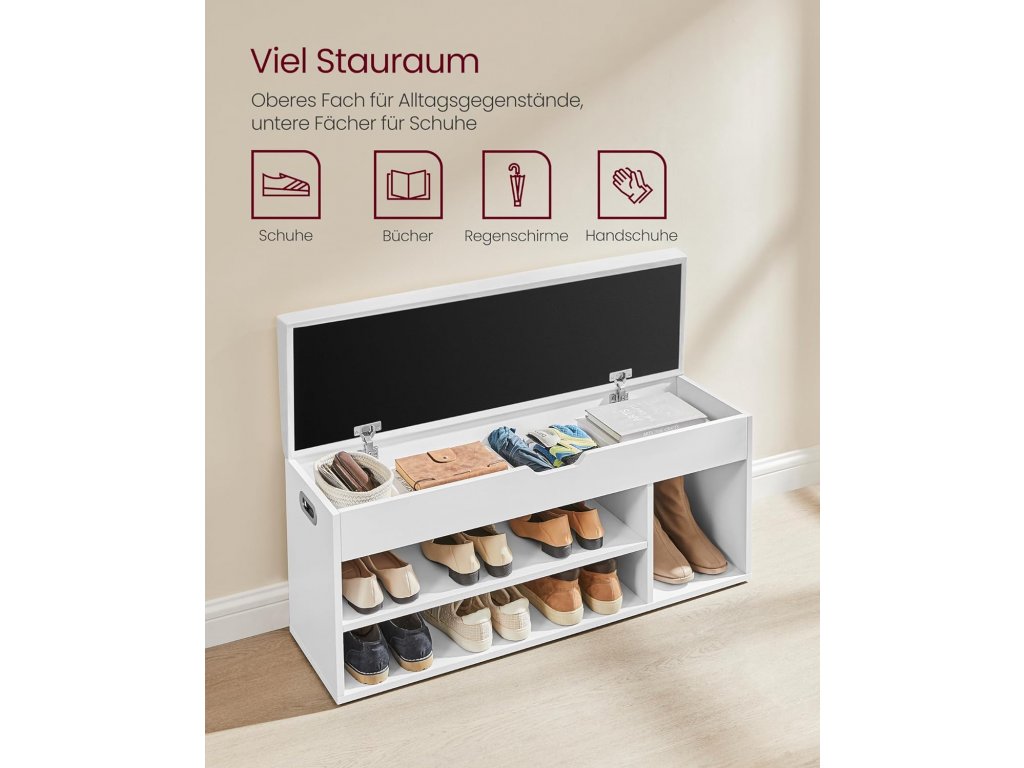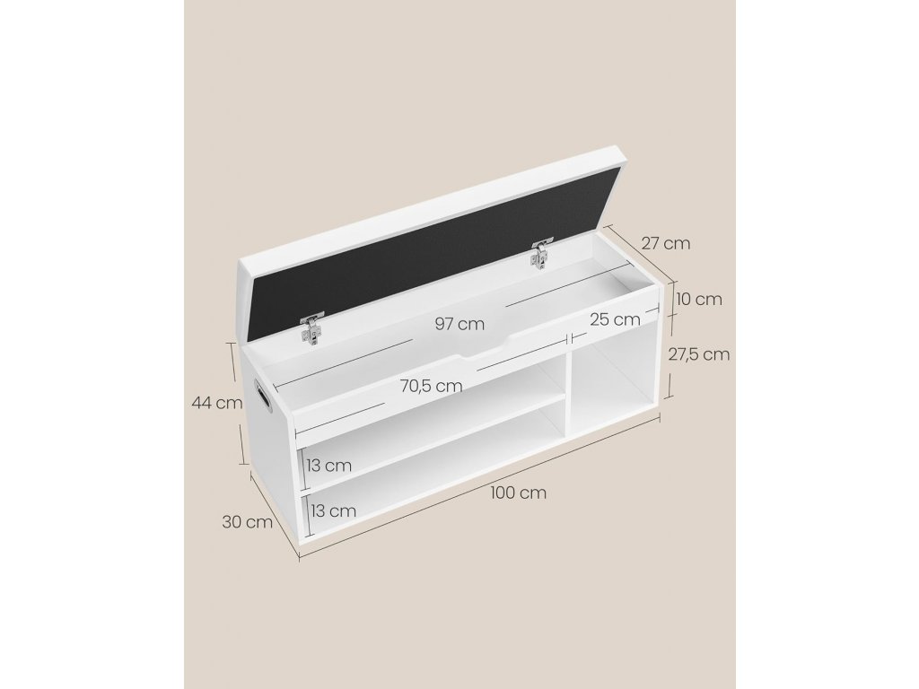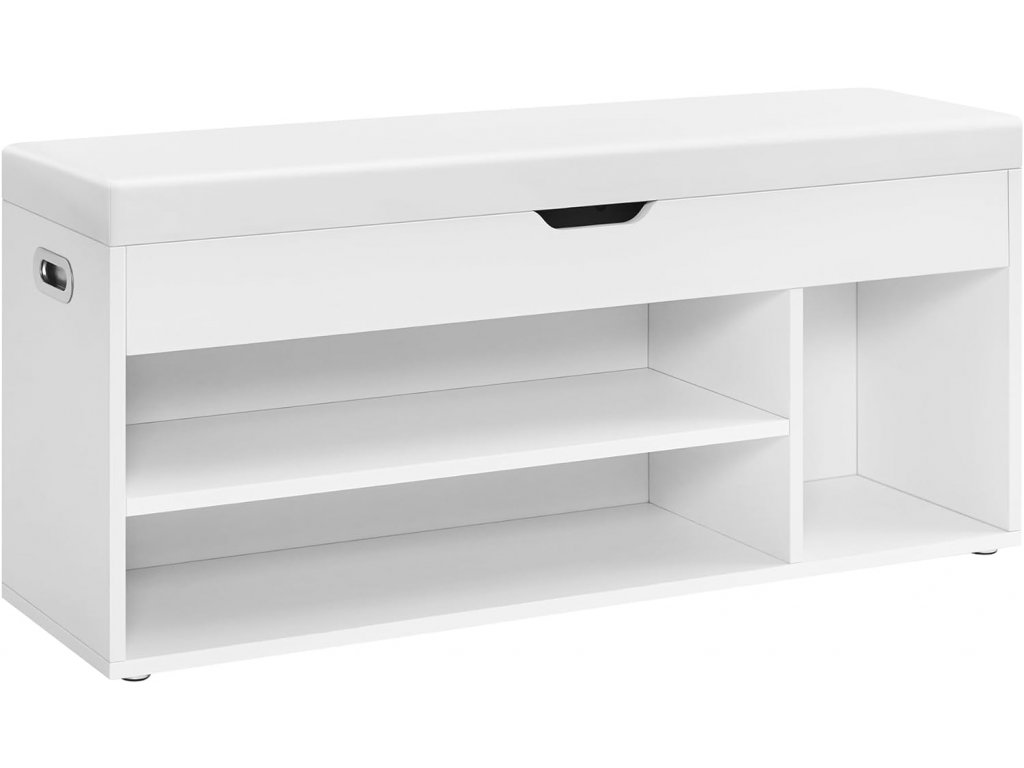 Tato lavice na boty má pod sedákem 7 cm hluboký úložný prostor, do kterého můžete uložit rukavice, knihy a další věci. Otevřené police pod ní pojmou až 8 párů bot nebo vaše sportovní vybavení. Botník má 3 otevřené přihrádky a uzavřený úložný prostor. Nosnost 150 kg