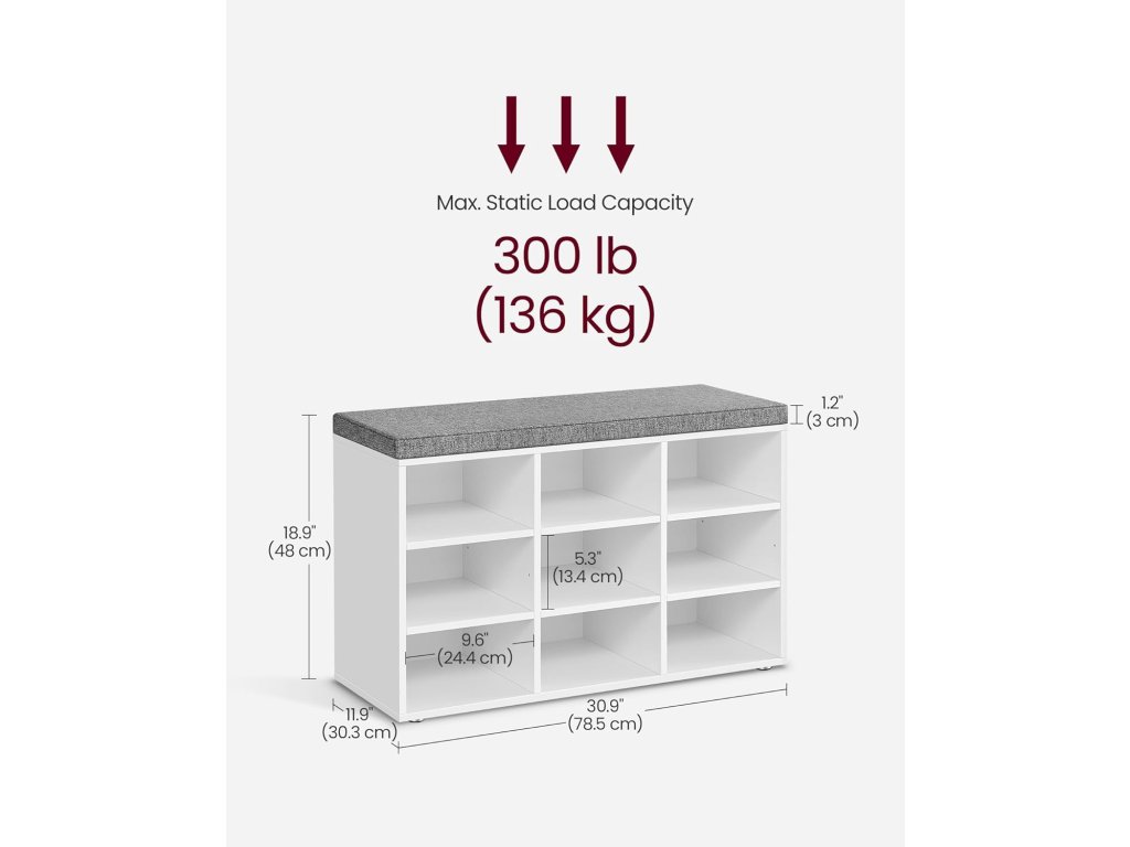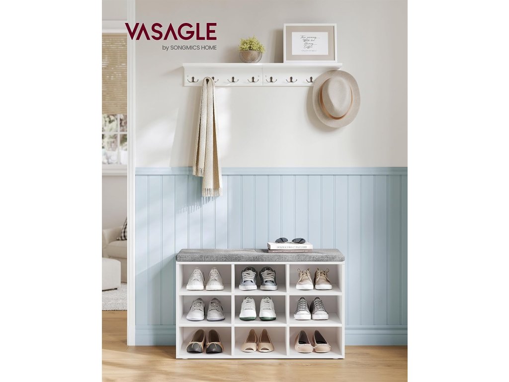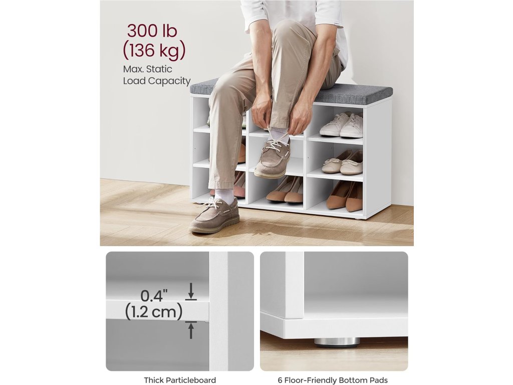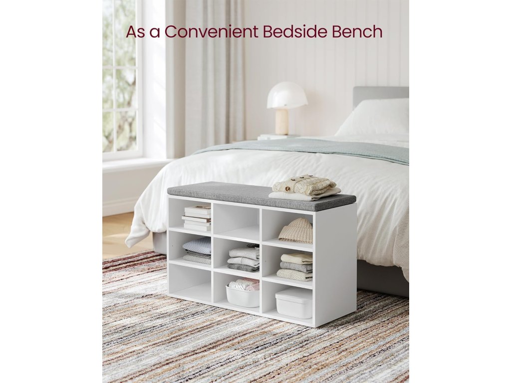 Tato lavice má 9 uzamykatelných skříněk o rozměrech 29,7 x 24,5 cm, které pojmou až 9 párů bot; Přepážky po stranách jsou nastavitelné a odnímatelné a poskytují vám více prostoru pro uložení bot a košíků. Tato úložná lavice je vyrobena z 12mm dřevotřísky a unese až 136 kg, takže se nemusíte bát, že se při sezení převrátí. 6 podložek chrání podlahu před poškrábáním. Polstrované sedadlo umožňuje pohodlné sezení. Polštář je připevněn suchým zipem a lze jej snadno sejmout. Potah z lněné látky se zipem je odnímatelný. S montáží této botníku se nemusíte starat. Číslované díly a ilustrovaný návod vám pomohou s její snadnou montáží. Ať už v chodbě jako botník, v obývacím pokoji jako úložný prostor nebo jako konec postele - tato praktická a stylová lavička se skvěle hodí.