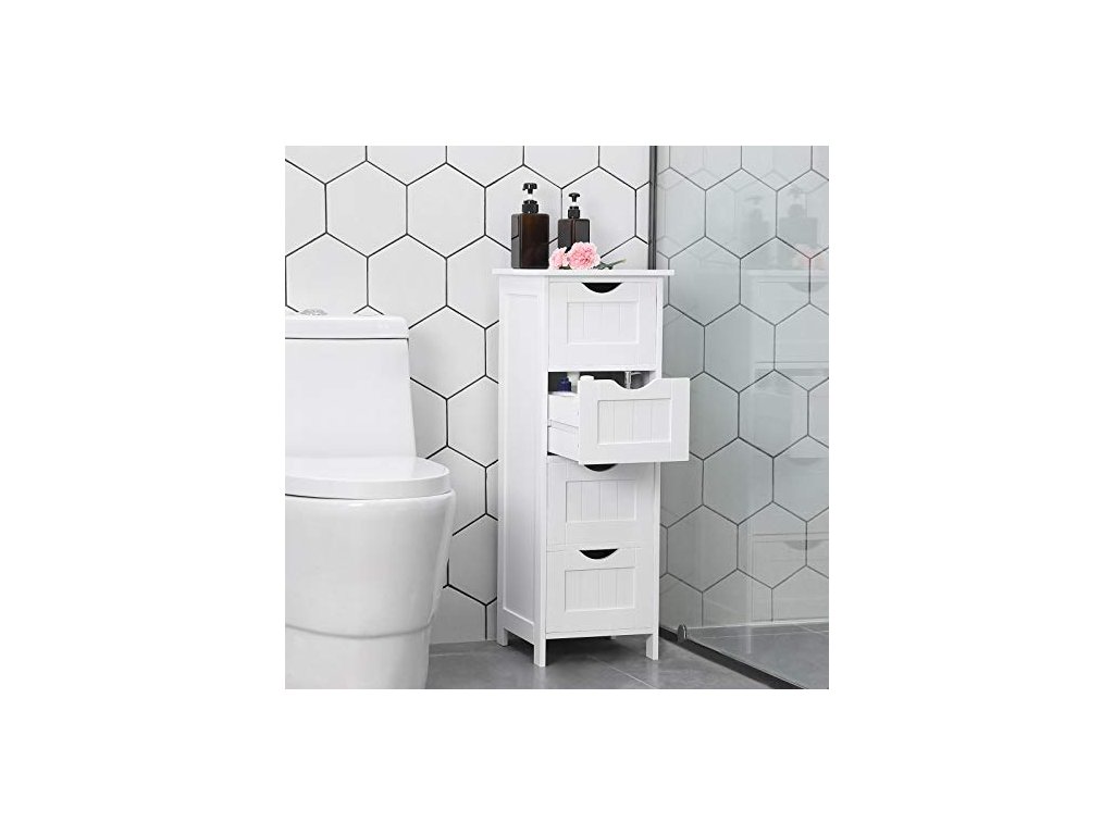 Tato koupelnová skříňka se 4 zásuvkami nabízí dostatek prostoru pro vaše předměty, jako jsou ručníky, toaletní papír, parfémy a další. Díky rozměrům 30 x 30 x 82 cm zabírá tato skříňka velmi málo místa na podlaze. Tato úložná skříňka není vhodná jen do koupelny, ale můžete ji použít i v obývacím pokoji na CD a foto rámečky, v jídelně na uložení sklenic nebo v kuchyni na lahve a sklenice. Díky jednoduchému designu a zelené barvě se tato koupelnová skříňka snadno začlení do vašeho interiéru a dodá vašemu domovu stylový nádech jako dekorace. Nemusíte se starat o montáž. Díky označeným dílům a snadno srozumitelnému návodu můžete moderní boční skříňku rychle sestavit. Tato koupelnová skříňka je vyrobena z pevných MDF panelů, což zaručuje dlouhou životnost. Navíc ji můžete připevnit ke zdi pomocí dodaného systému proti převrácení pro zvýšení stability. Barva: bílá. Materiál: MDF (dřevovláknitá deska střední hustoty). Rozměry: 30 x 30 x 82 cm. Hmotnost: 8,3 kg. Max. statická nosnost horní police: 45 kg. Max. statická nosnost zásuvky: 4,5 kg.