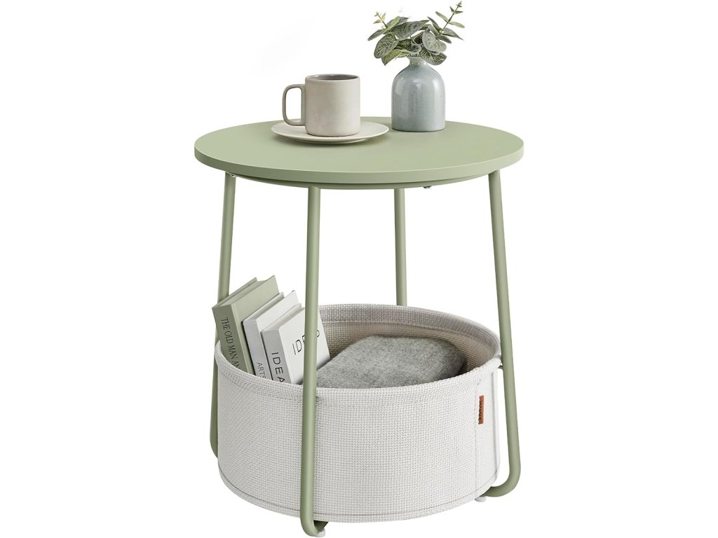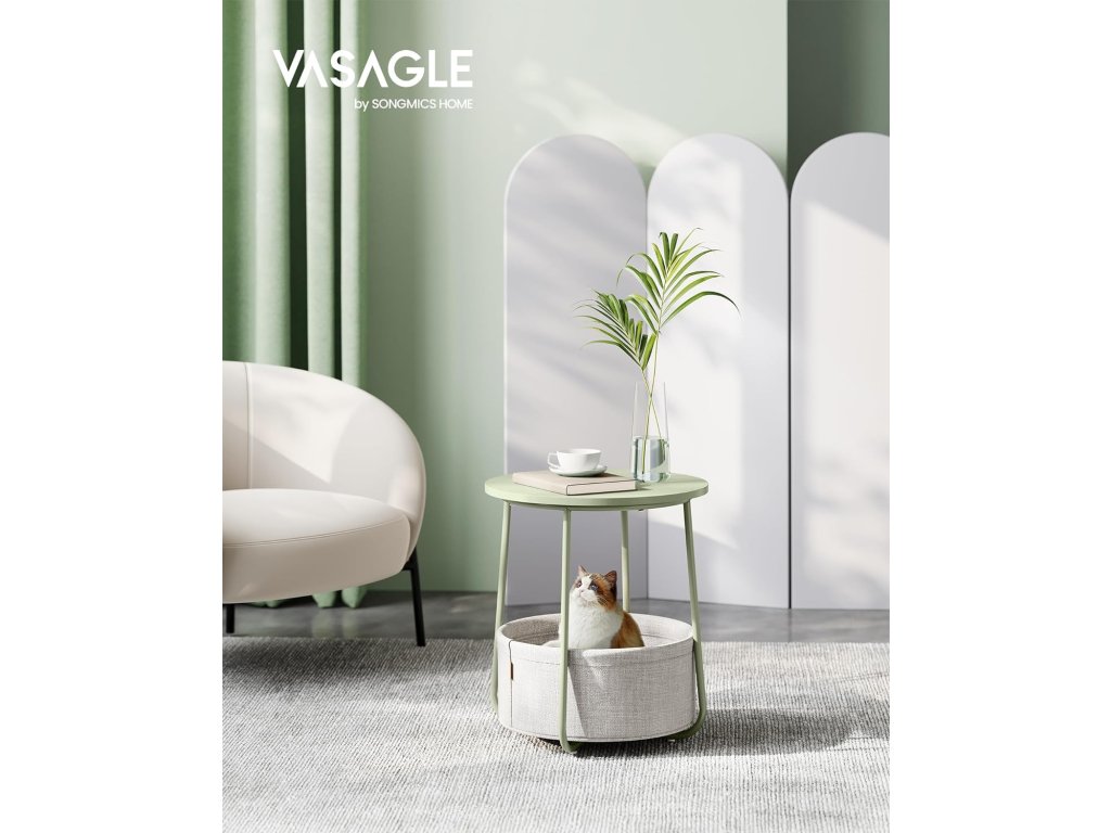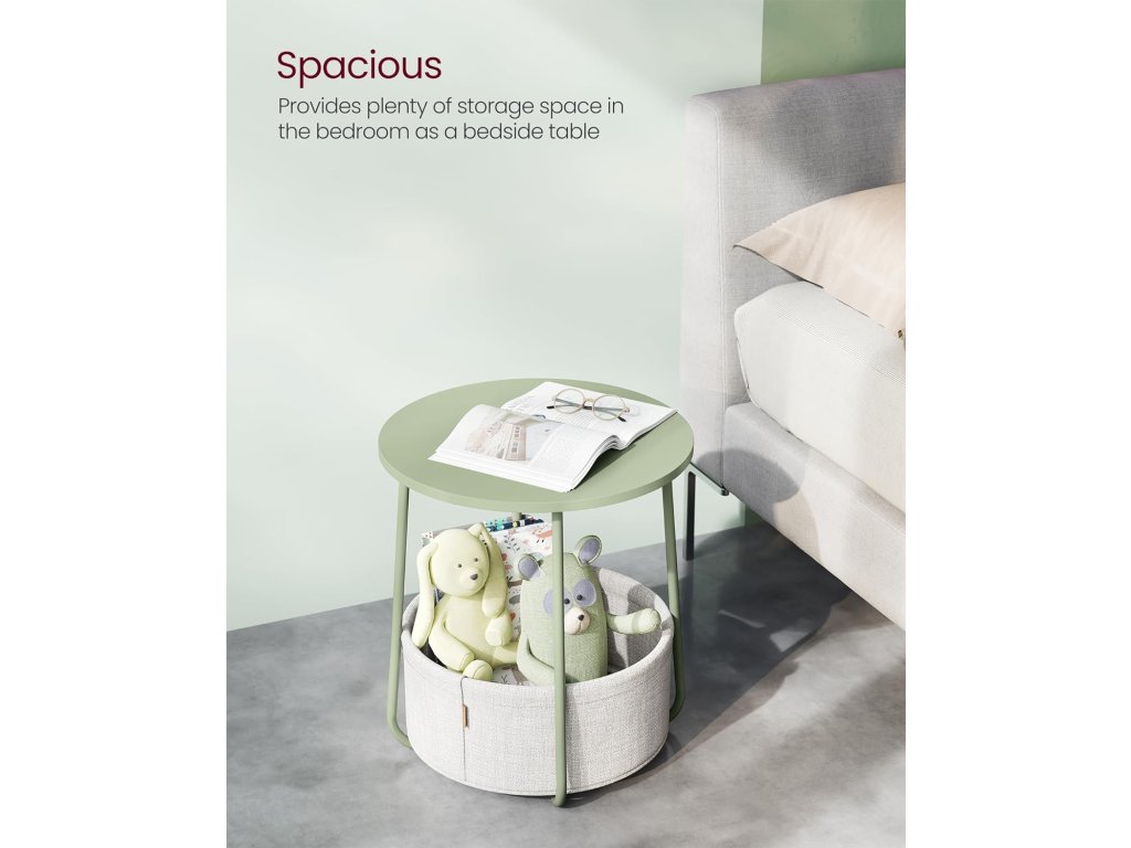 Stolek je vhodný do malých prostor. Jako odkládací stolek v obývacím pokoji nebo jako noční stolek v ložnici není objemný, ale nabízí dostatek úložného prostoru pro vaše věci. Kulatý odkládací stolek s látkovým košem