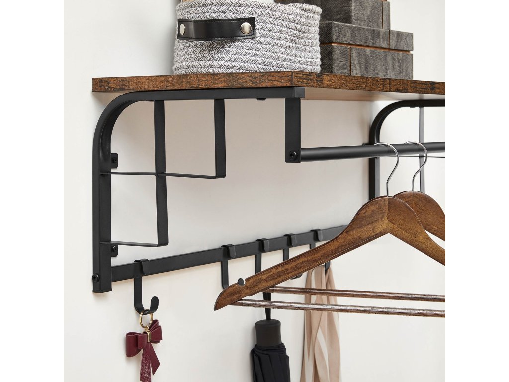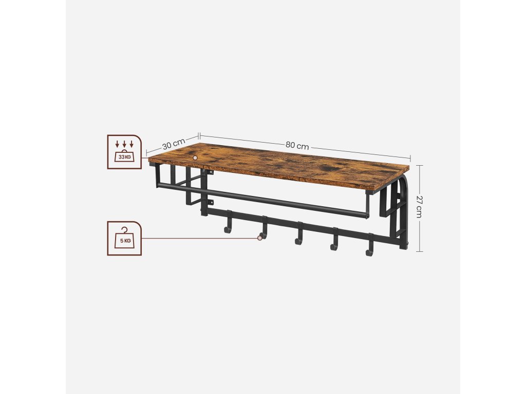 Tento věšák na kabáty kombinuje poličku (30 x 80 cm), závěsnou tyč a 5 odnímatelných háčků, které splňují vaše různé potřeby úložného prostoru – vaše kabáty, tašky, deštníky i klíče zde najdou své místo. Elegantní linie, rustikální police a unikátní boční lišty pro zavěšení deštníků a ramínek dělají z této nástěnné police praktickou i stylovou věc. Dodá úložný prostor i styl kamkoli ji umístíte. Robustní ocel v kombinaci s vysoce kvalitní dřevotřískou vytváří robustní plovoucí polici, která poskytuje vašim předmětům spolehlivou oporu. Police unese až 25 kg, závěsná lišta 20 kg a každý háček 2,3 kg. S montáží této nástěnné šatní věšáky se nemusíte starat. Díky srozumitelnému návodu a označeným dílům zvládnete tuto plovoucí polici sestavit raz dva. Barva: Rustikálně hnědá, černá. Materiál: Dřevotříska, ocel. Rozměry výrobku: 30 x 80 x 27 cm. Hmotnost výrobku: 3,8 kg. Max. statická nosnost horní police: 25 kg. Max. statická nosnost závěsné lišty: 20 kg. Max. statická nosnost každého háčku: 2,3 kg