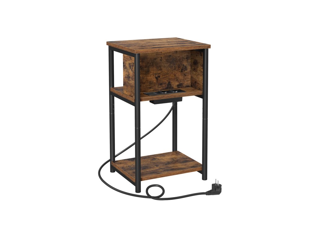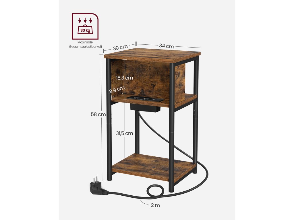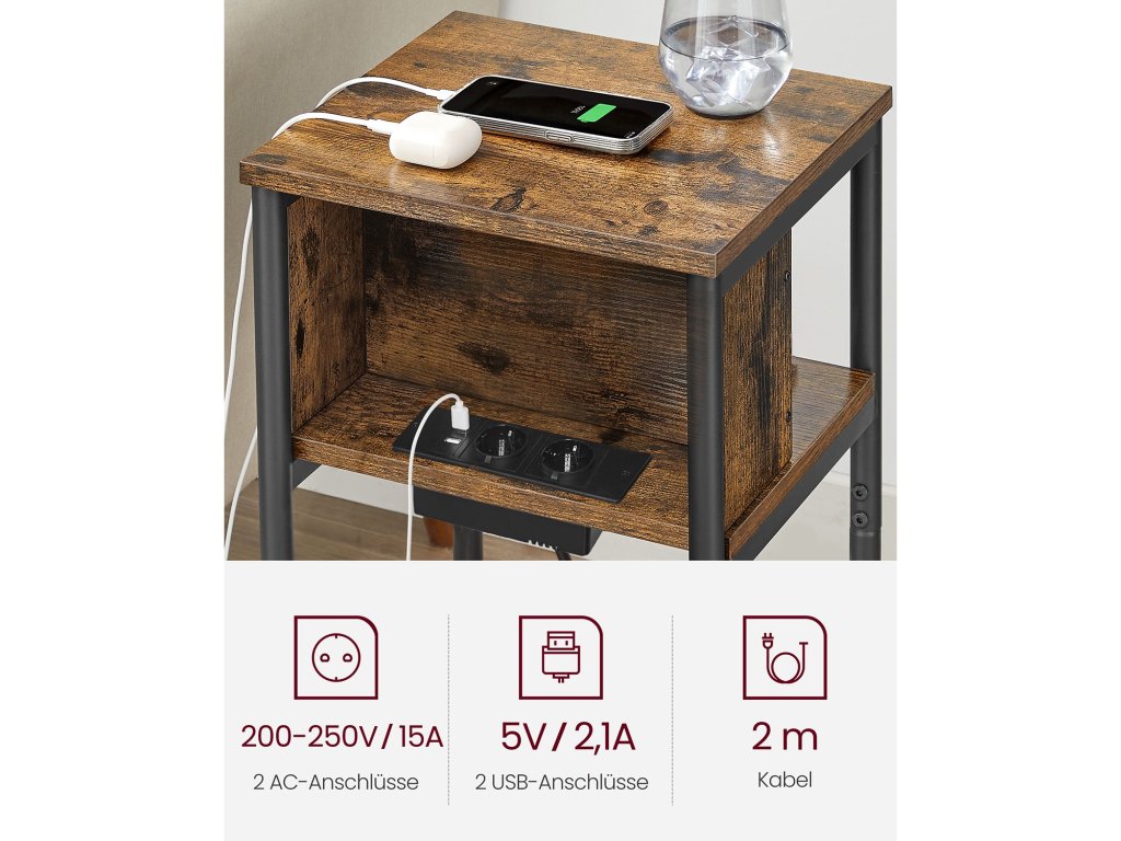 Tento odkládací stolek má integrovanou zásuvku se 2 AC porty, 2 USB porty a 2m nabíjecím kabelem, který vám umožní napájet zařízení, aniž byste museli vstávat ze židle. Horizontální prodlužovací kabel pro snadné nabíjení; mezera mezi prodlužovacím kabelem a deskou stolu poskytuje přehledný průchod pro kabely. Správa kabelů místo zamotaných kabelů. Lampa na povrchu, dálkové ovládání na prostřední polici a oblíbené knihy na spodní polici - s tímto třípatrovým nočním stolkem máte všechny potřebné věci dobře uspořádané. Díky ocelovému rámu, vysoce kvalitní dřevotřísce a nastavitelným nohám unese každá police tohoto nočního stolku až 10 kg. Úspora místa: S rozměry 30 x 34 x 58 cm se tento štíhlý odkládací stolek perfektně vejde do malého prostoru mezi dvěma čalouněnými židlemi nebo vedle postele. Barva: Vintage hnědá/černá. Materiál: Dřevěná dřevotříska, ocel. Rozměry: 30 x 34 x 58 cm. Hmotnost: 5,7 kg. Max. statická nosnost na polici: 10 kg. Max. celková statická nosnost: 30 kg