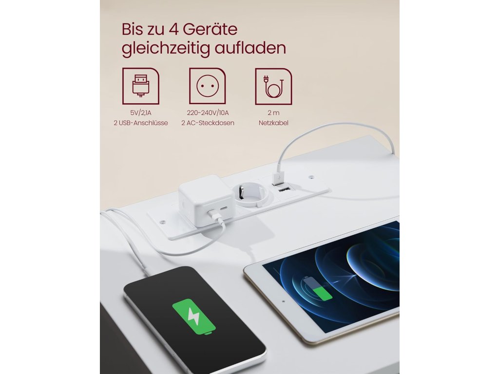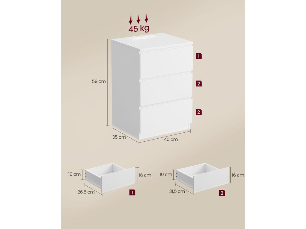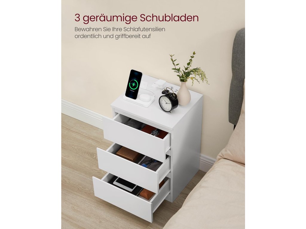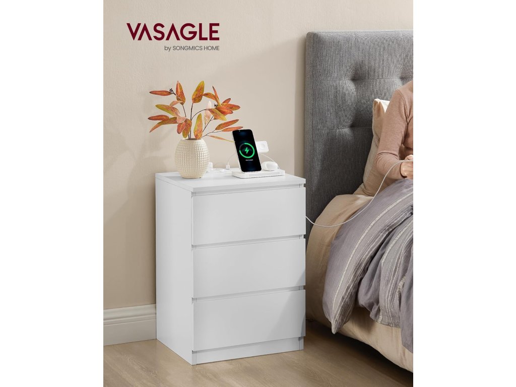 Vestavěný prodlužovací kabel se 2 zásuvkami, 2 USB porty a 2 m dlouhým kabelem umožňuje napájet všechna vaše zařízení, jako jsou mobilní telefony, tablety, lampy a notebooky, přímo z postele. Ať už si chcete schovat čtení před spaním nebo mít po ruce brýle, tento noční stolek vám díky prostorné desce a 3 snadno otevíratelným zásuvkám se zkosenými hranami poskytne dostatek prostoru. Díky minimalistickému designu, bílé barvě a neviditelným úchytkám se tento elegantní noční stolek bez problémů začlení do vašeho interiéru. Jeho moderní kouzlo zkrášlí ložnice i obývací pokoje. Tento odkládací stolek s prodlužovacím kabelem je vyroben z vysoce kvalitní dřevotřísky o tloušťce 15 mm. Je robustní a dostatečně robustní, aby unesl až 62 kg, a bude vám věrně sloužit po mnoho let. Díky jasně označeným dílům a snadno srozumitelným pokynům je sestavení tohoto konferenčního stolku se zásuvkami hračka, takže si můžete zkrášlit svůj obytný prostor s minimálním úsilím. Barva: bílá. Materiál: Dřevotříska. Rozměry: 40 x 35 x 59 cm. Hmotnost: 13 kg. Max. celková statická nosnost: 62 kg