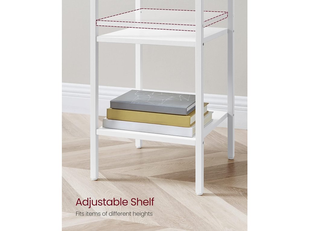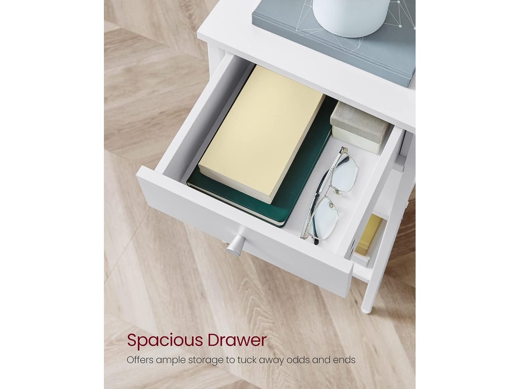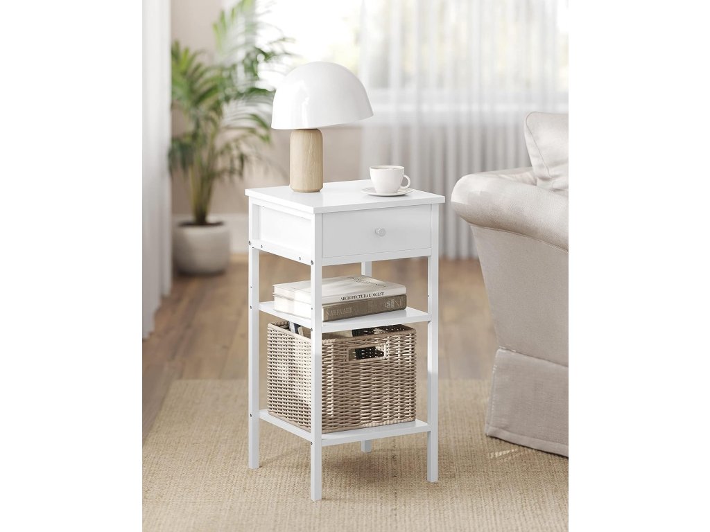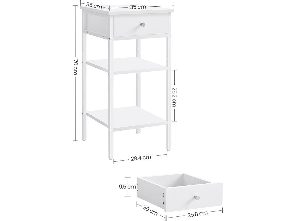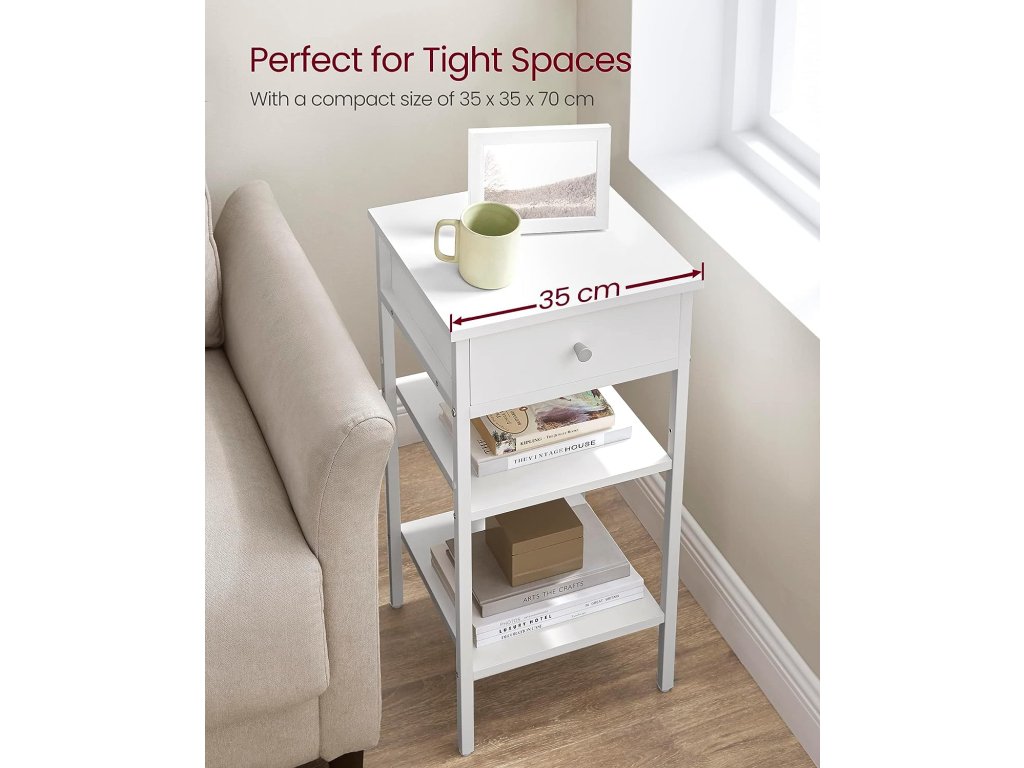 Bílá barva a čisté linie dodávají tomuto nočnímu stolku moderní minimalistický vzhled. Jeho prostorná zásuvka a police jsou funkční i vizuálně působivé a dodají vašemu domovu styl i úložný prostor. Tento vysoký noční stolek o rozměrech 35 x 35 x 70 cm nezabere mnoho místa na podlaze a bez problémů se vejde i do úzkých rohů. Jeho prostorově úsporný design se skvěle hodí do ložnice, na chodbu nebo do obývacího pokoje. Tento štíhlý odkládací stolek vám nabízí 3 možnosti ukládání - horní plochu, zásuvku a 2 otevřené police. Využijte je naplno k uložení a vystavení lampy, knih a dalších drobností. Tento boční stolek je vyroben z vysoce kvalitní dřevotřísky a oceli a má robustní konstrukci, která unese celkem až 40 kg: 20 kg na horní ploše, 5 kg v zásuvce a 10 kg na každé polici - můžete bezpečně uložit všechny své věci. Postupujte krok za krokem podle přehledných pokynů s označenými díly a tento odkládací stolek snadno sestavíte během chvilky. Je jednoduchý, ale stylový, takže se stane dokonalým doplňkem každé domácnosti