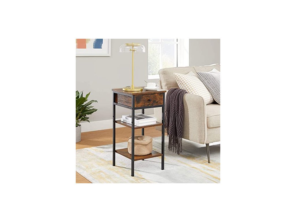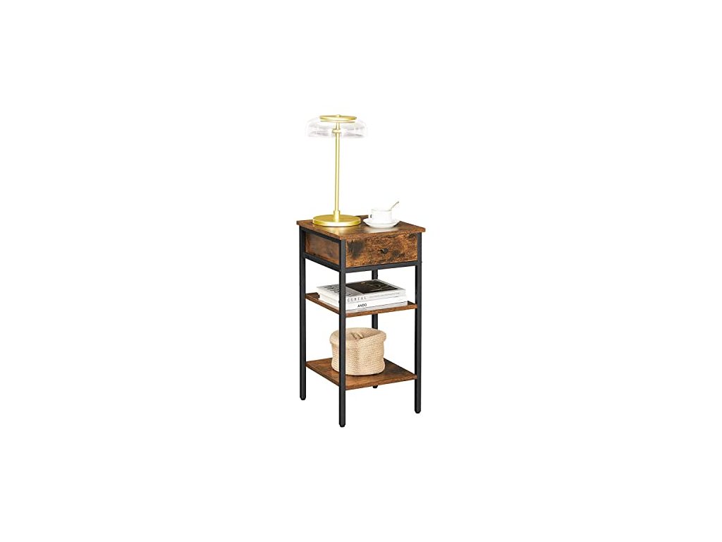 Hnědá a černá barva a čisté linie dodávají tomuto nočnímu stolku moderní minimalistický vzhled. Jeho prostorná zásuvka a police jsou funkční i vizuálně působivé a dodají vašemu domovu styl i úložný prostor. Tento vysoký noční stolek o rozměrech 35 x 35 x 70 cm nezabere mnoho místa na podlaze a bez problémů se vejde i do úzkých rohů. Jeho prostorově úsporný design se skvěle hodí do ložnice, na chodbu nebo do obývacího pokoje. Tento štíhlý odkládací stolek vám nabízí 3 možnosti ukládání - horní plochu, zásuvku a 2 otevřené police. Využijte je naplno k uložení a vystavení lampy, knih a dalších drobností. Tento boční stolek je vyroben z vysoce kvalitní dřevotřísky a oceli a má robustní konstrukci, která unese celkem až 40 kg: 20 kg na horní ploše, 5 kg v zásuvce a 10 kg na každé polici - můžete bezpečně uložit všechny své věci. Postupujte krok za krokem podle přehledných pokynů s označenými díly a tento odkládací stolek snadno sestavíte během chvilky. Je jednoduchý, ale stylový, takže se stane dokonalým doplňkem každé domácnosti