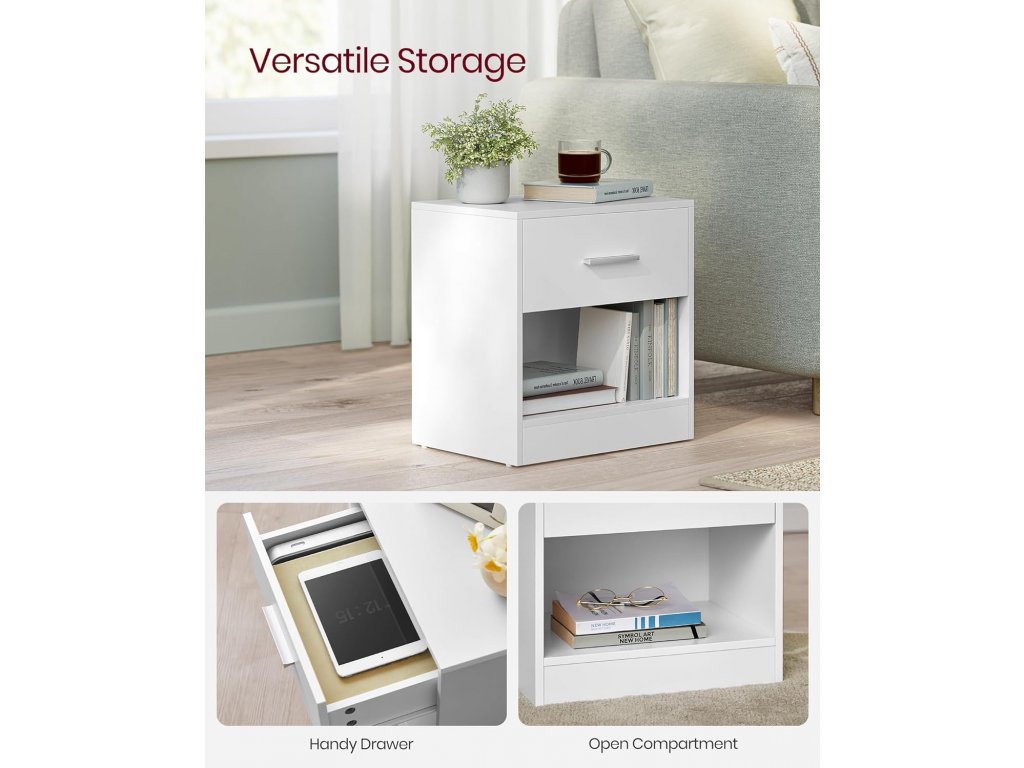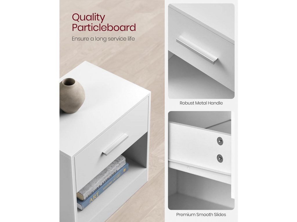 Odolné dřevotřískové desky, vysoce kvalitní kování a robustní konstrukce dodávají každému postrannímu stolku vysokou stabilitu. Celkem unese až 75 kg a zásuvka až 5 kg. Stolek se zásuvkou, madlem a otevřenou přihrádkou