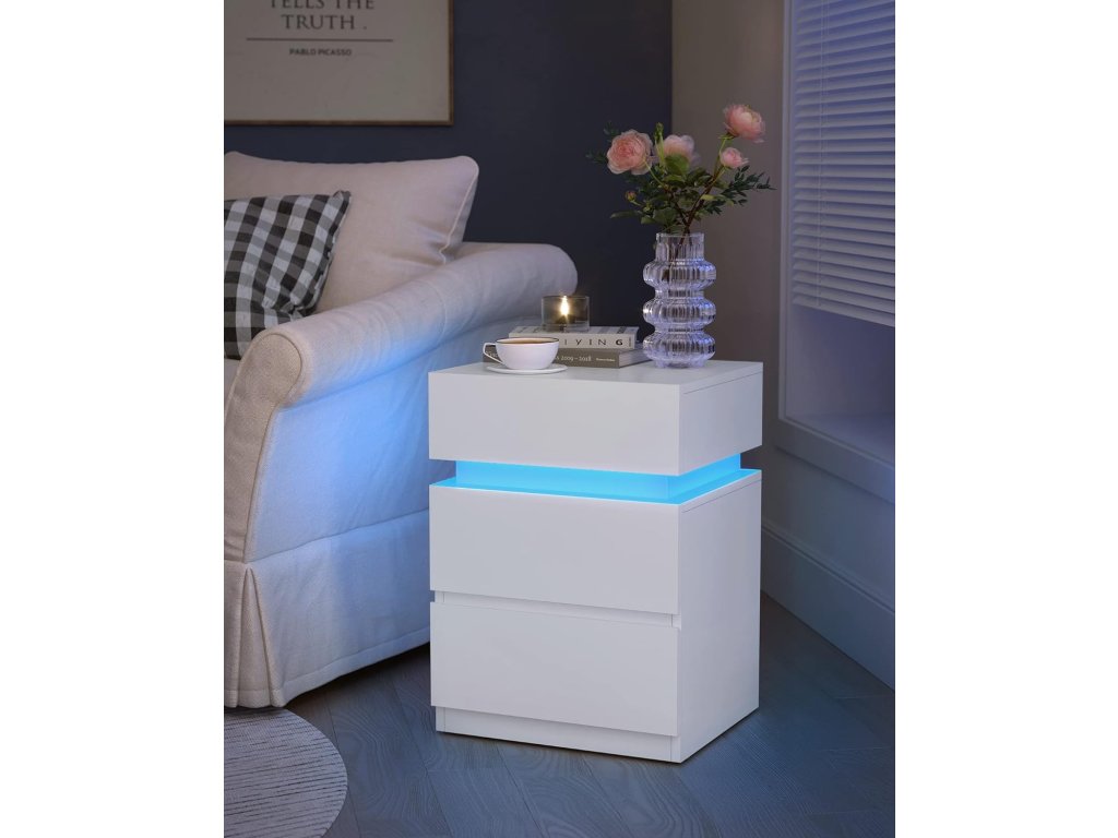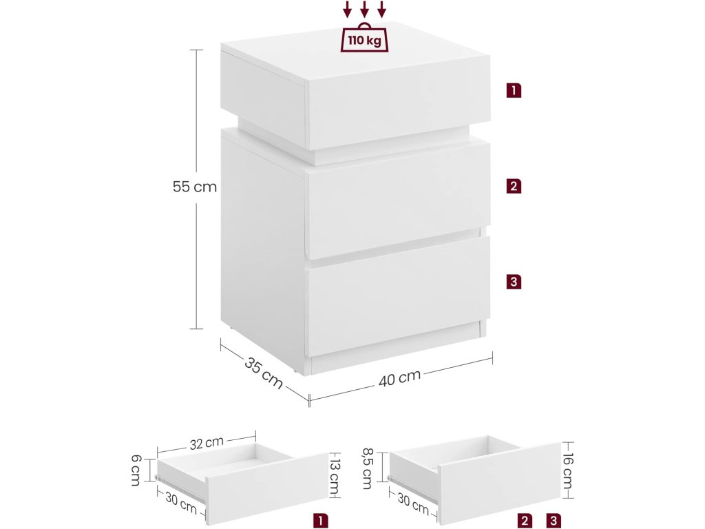 Noční stolek lze díky 3 prostorným zásuvkám a velké přihrádce umístit vedle postele a uložit do zásuvek noviny. Budík a rámečky na fotografie najdou své ideální místo na odkládací ploše.