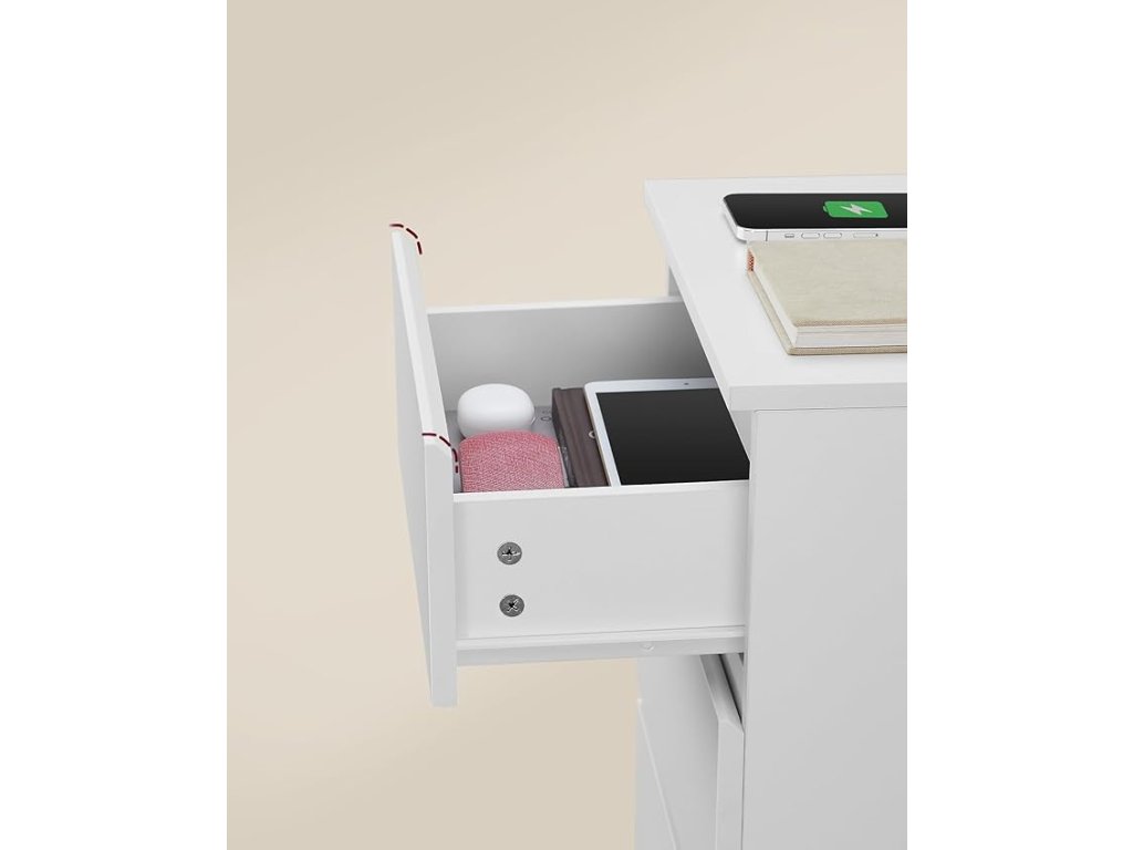 Vestavěný prodlužovací kabel se 2 zásuvkami, 2 USB porty a 2m dlouhým kabelem umožňuje napájet všechna vaše zařízení, jako jsou mobilní telefony, tablety, lampy a notebooky, přímo z postele. Ať už si chcete schovat čtení před spaním nebo mít po ruce brýle, tento noční stolek vám díky prostorné desce a 3 snadno otevíratelným zásuvkám se zkosenými hranami poskytne dostatek prostoru. Díky minimalistickému designu, bílé barvě a neviditelným úchytkám se tento elegantní noční stolek bez problémů začlení do vašeho interiéru. Jeho moderní kouzlo zkrášlí ložnice i obývací pokoje. Tento odkládací stolek s prodlužovacím kabelem je vyroben z vysoce kvalitní dřevotřísky o tloušťce 15 mm. Každý stolek je robustní a dostatečně pevný, aby unesl až 62 kg, a bude vám věrně sloužit po mnoho let. Díky jasně označeným dílům a snadno srozumitelným pokynům je sestavení tohoto konferenčního stolku se zásuvkami hračka, takže si můžete zkrášlit svůj obytný prostor s minimálním úsilím. Barva: Světle bílá. Materiál: Dřevotříska. Rozměry: 35 x 40 x 59 cm. Hmotnost: 13 kg. Max. celkové statické zatížení: 62 kg