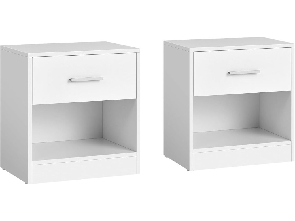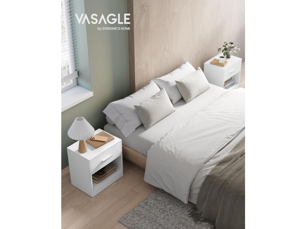 Díky minimalistickému designu a čistým liniím tato sada 2 nočních stolků vnese do vašeho obývacího prostoru moderní atmosféru a snadno se začlení do vašeho interiéru. Odolná dřevotříska, vysoce kvalitní kování a robustní konstrukce dodávají každému odkládacímu stolku vysokou stabilitu. Celková nosnost je až 75 kg a zásuvka až 5 kg. Označené díly, dodávaná sada příslušenství, snadno srozumitelný návod a přesně předvrtané otvory. To vše usnadňuje montáž těchto 2 koncových stolků. Zásuvka se hladce a tiše posouvá po prémiových kluzných lištách a při přístupu dovnitř se tiše otevírá. Sada 2 robustních a stylových všestranných malých stolků, které se skvěle hodí jako noční stolek, odkládací stolek nebo kartotéka. Navíc oživí váš prostor. Barva: Klasická bílá. Materiál: Dřevotříska. Rozměry na stůl: 39 x 28 x 41 cm. Hmotnost na stůl: 5,7 kg. Max. statická nosnost zásuvky: 5 kg. Max. celková statická nosnost na stůl: 75 kg