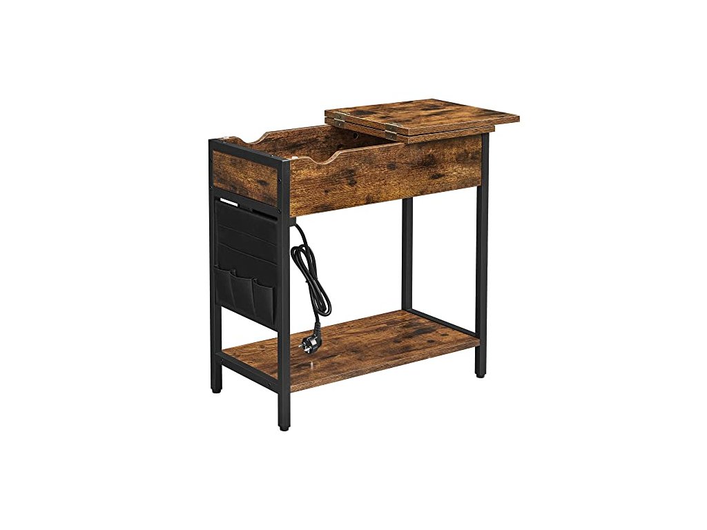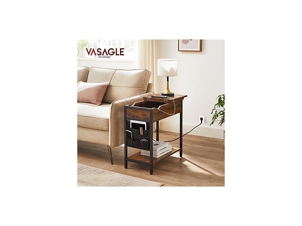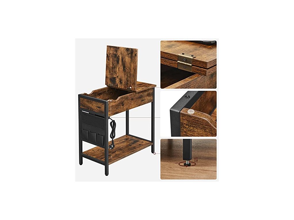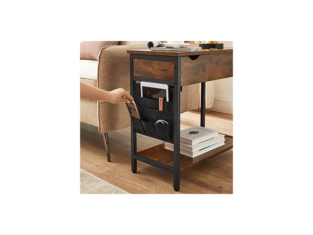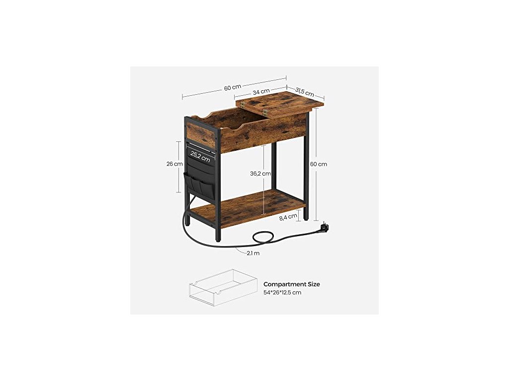 Díky 2 zásuvkám, 2 portům USB a 2,1m kabelu můžete pohodlně nabíjet více zařízení. Také prostor mezi zásuvkami zabraňuje vzájemnému blokování adaptérů. Přihrádka pro ukrytí drobností, horní část pro vystavení dekorací a polička pro uložení časopisů. Díky otevřeným a uzavřeným prostorům pomáhá tento noční stolek vytvořit dobře organizovaný prostor. Látkové tašky jsou navrženy tak, aby se do nich vešly předměty každodenní potřeby: jedna o rozměrech 23,1 x 17 cm na tablet nebo časopisy, jedna o rozměrech 23,1 x 13,2 cm na notebook a 3 perfektní malé tašky na dálkové ovládání, telefon a adaptéry. Tento boční stolek se může pochlubit 2 bočními otvory pro kabely, 1 velkou odkládací deskou pro snadný přístup k předmětům a 1 boční napájecí lištou, která neruší při ukládání předmětů uvnitř. Díky rozměrům 60 x 31,5 x 60 cm (D x Š x V) se tento prostorově úsporný boční stolek skvěle hodí do malých prostor mezi dvě křesla nebo vedle postele