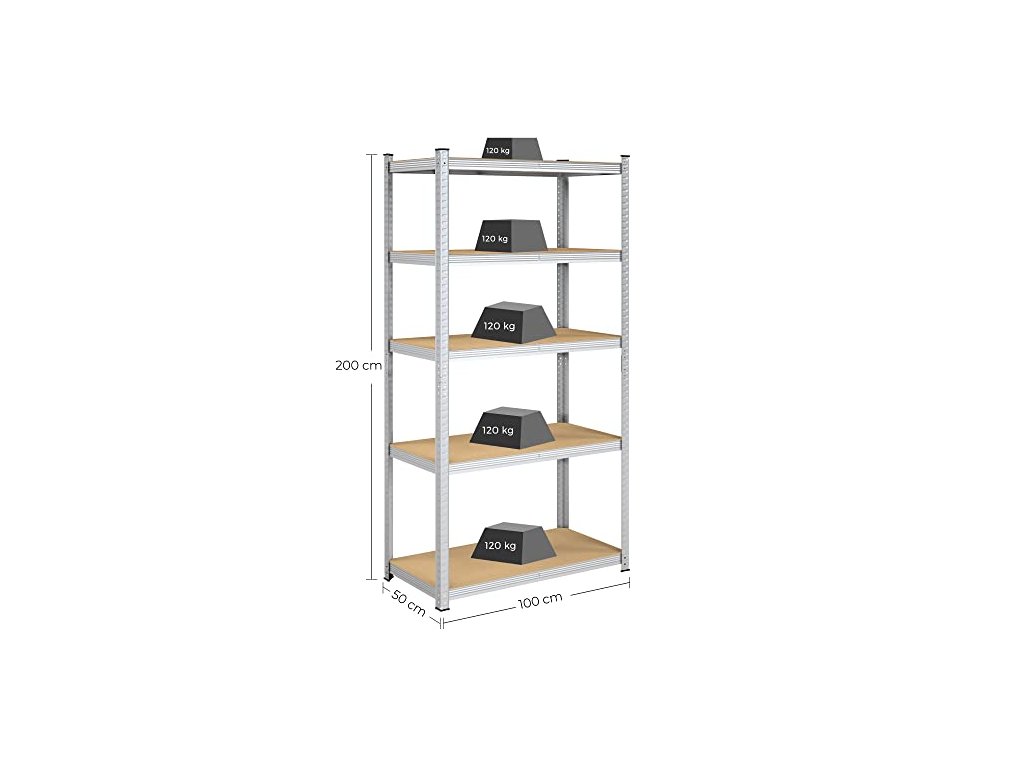 Skladovací regál, 5 pater, 100 x 50 x 200 cm, stříbrný