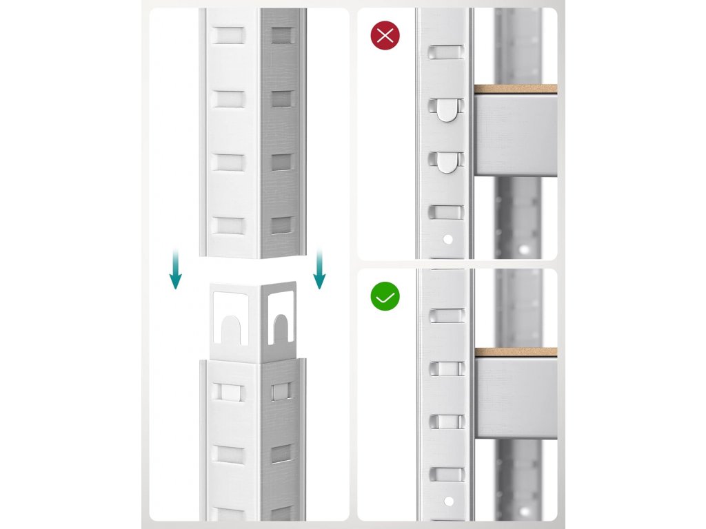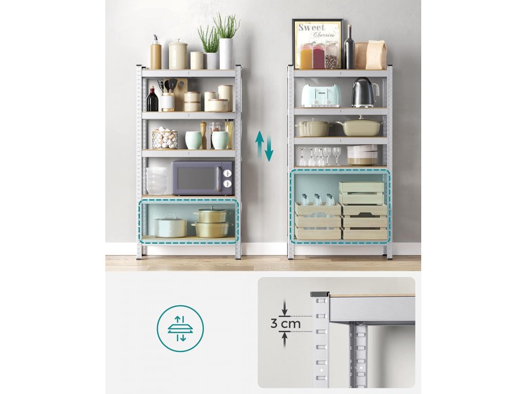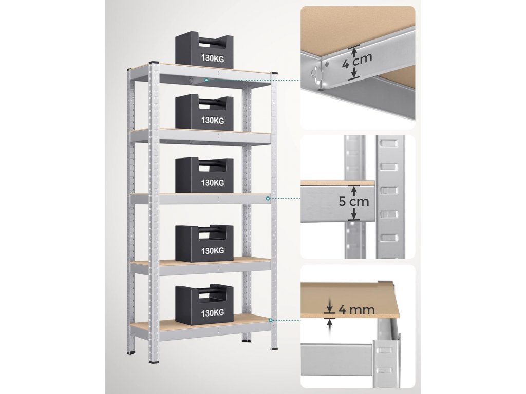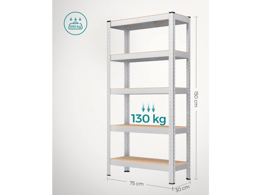 Tuto kovovou polici lze rozdělit na 2 samostatné jednotky, aby vyhovovala vašim úložným potřebám a prostoru. Po rozdělení také skvěle poslouží jako pracovní stůl s úložným prostorem. Každou polici lze snadno nastavit po 3 cm, což vyhovuje vašim potřebám pro ukládání předmětů různých velikostí. Tento regál o rozměrech 75 x 30 x 150 cm a celkové nosnosti 650 kg lze použít v garáži, skladu, sklepě nebo prádelně k uspořádání veškerého nářadí a vybavení. Jednoduchá montáž bez šroubů. Díky vzájemně propojené konstrukci a jasným pokynům se tento robustní regál snadno montuje.