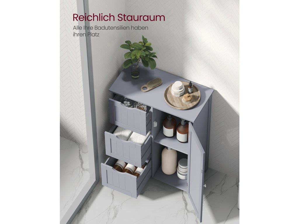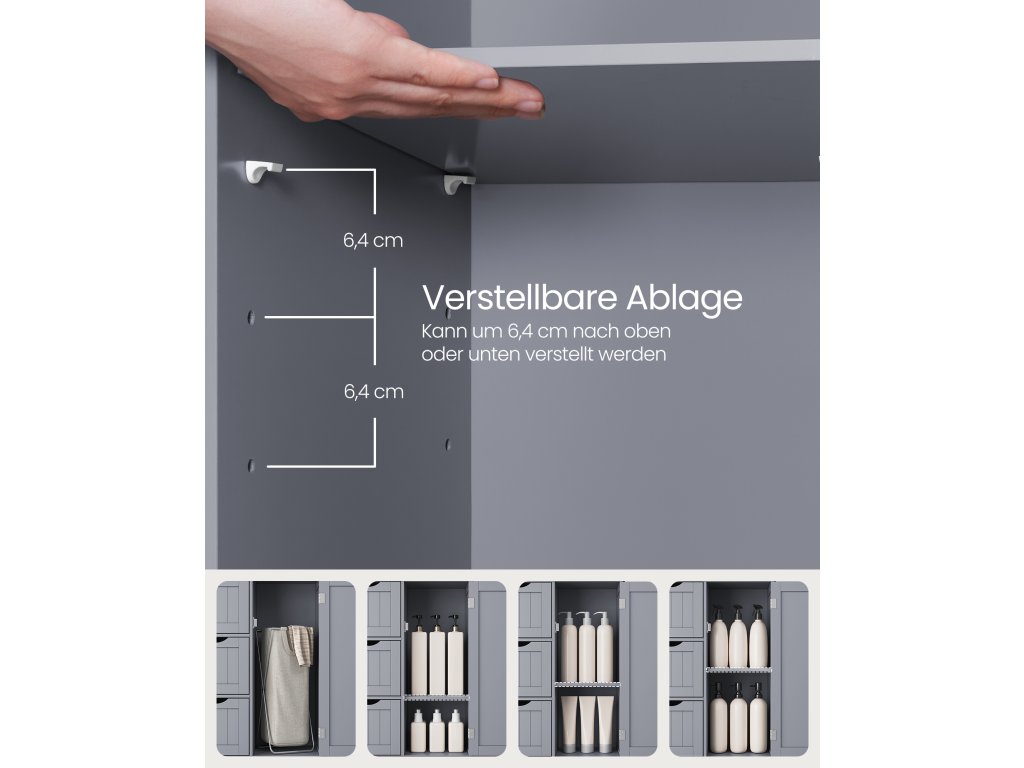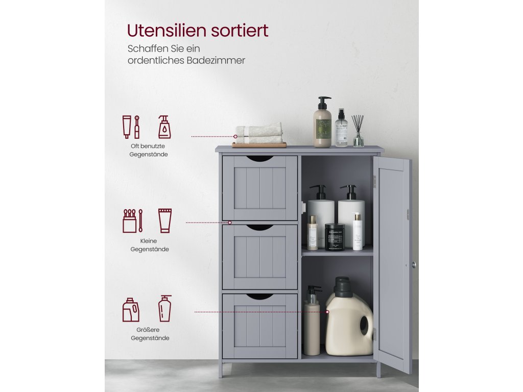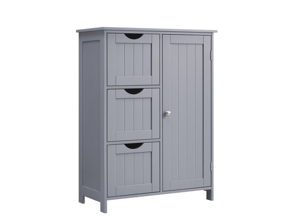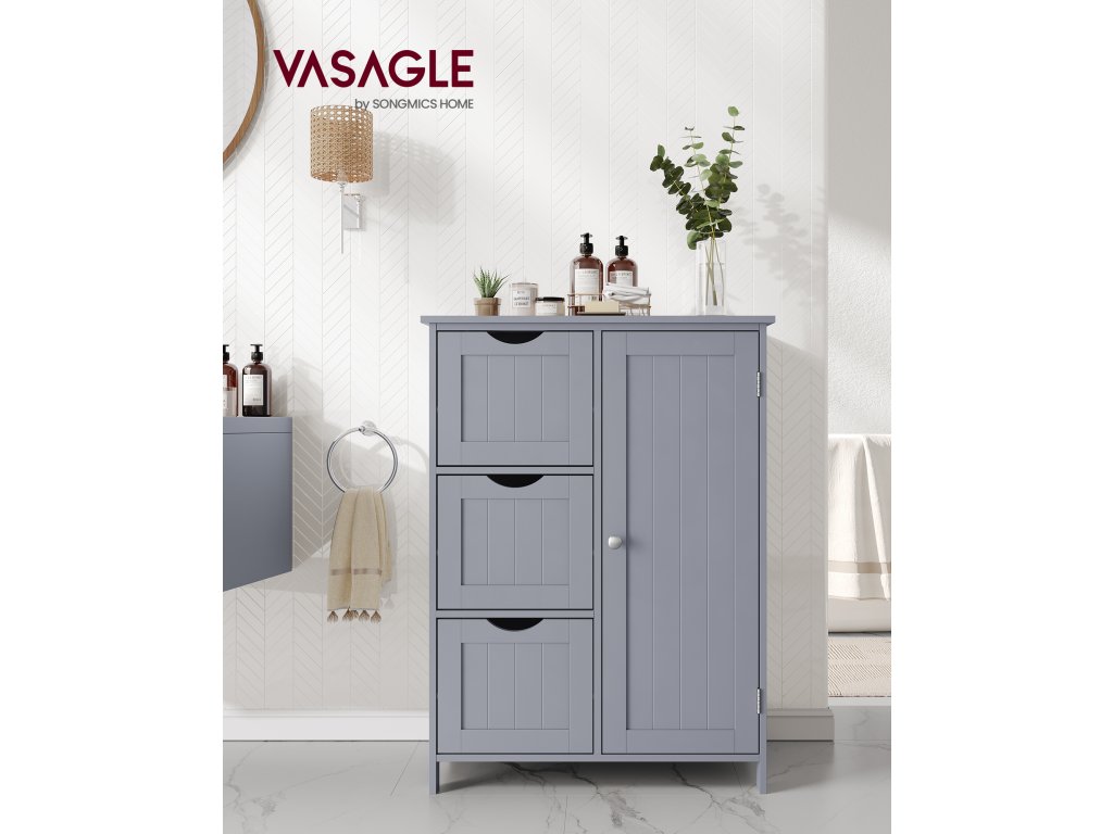 Tato koupelnová skříňka je vyrobena z robustní MDF a je pevná a stabilní; sada proti převrácení skrytá na zadní straně této skříňky zvyšuje celkovou stabilitu a bezpečnost. Volně stojící koupelnová skříňka se 3 zásuvkami a 1 výškově nastavitelnou policí