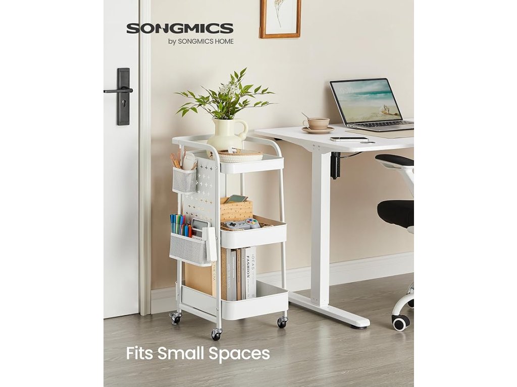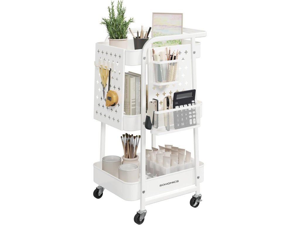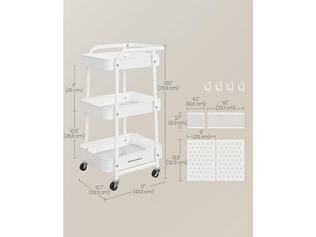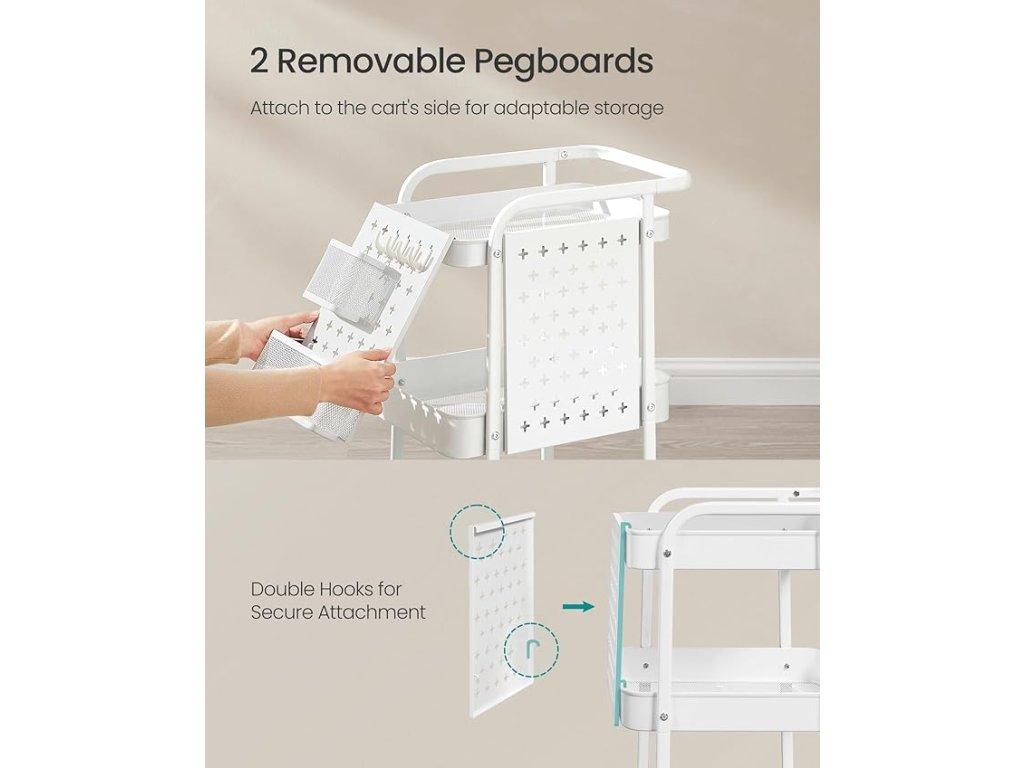 Tento úložný vozík je vyroben z prvotřídní oceli a má 3 kovové síťované police, z nichž každá má nosnost až 10 kg. Jeho robustní konstrukce zajišťuje dlouhou životnost pro vaše různé potřeby skladování. Tento úložný vozík je vybaven 2 kovovými držáky na zavěšení a 4 háčky a pomáhá udržovat vaše nářadí a další drobné předměty uspořádané a po ruce, což je ideální pro udržení pořádku v prostoru. Na kteroukoli stranu vozíku lze připevnit 2 odnímatelné příčky. Závěsné držáky a háčky lze také na příčkách přemístit, což nabízí přizpůsobitelné úložné řešení. Používejte jej jako úložný vozík v obývacím pokoji, police v kuchyni, úložnou jednotku v koupelně nebo jako užitkový vozík, servisní vozík nebo vozík na řemesla v jiných prostorách. Popusťte uzdu své fantazii! Tento úložný vozík je vybaven horní rukojetí a čtyřmi otočnými kolečky o 360°, z nichž 2 jsou uzamykatelná, a zajišťuje plynulý pohyb a bezpečné umístění. Umožňuje vám bez námahy přenášet vaše předměty po místnosti. Barva: bílá. Materiál: Ocel. Rozměry výrobku: 43,3 x 32,3 x 73,9 cm . Hmotnost výrobku: 4 kg. Max. statická nosnost na patro: 10 kg. Max. statická nosnost celkem: 30 kg