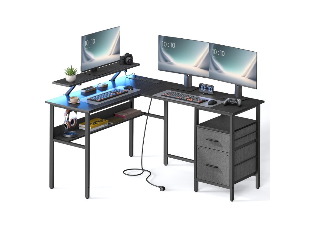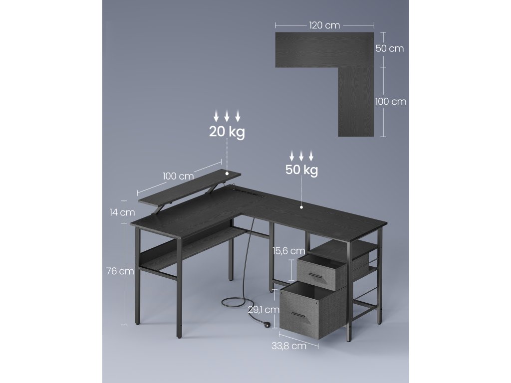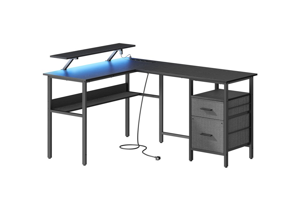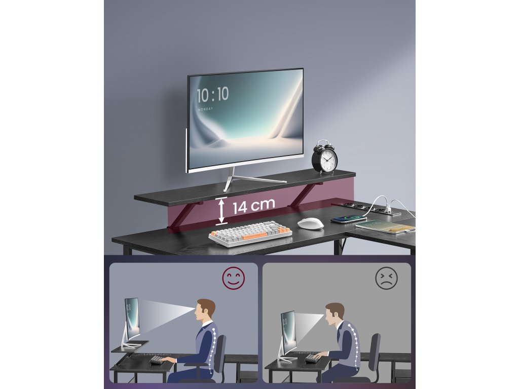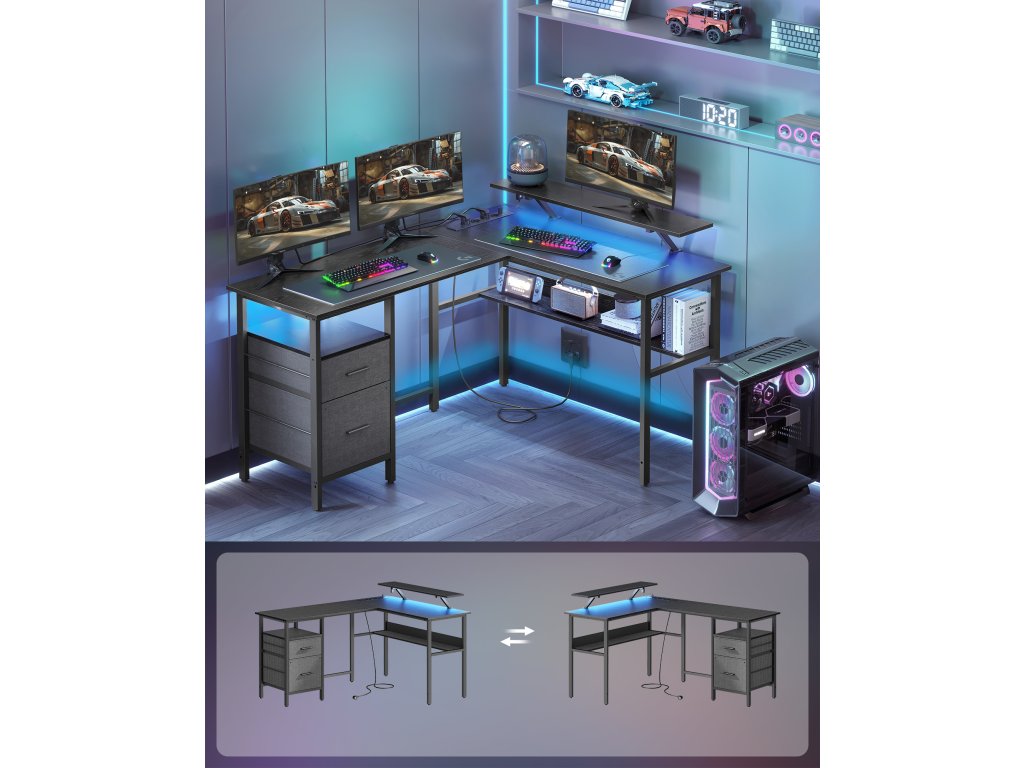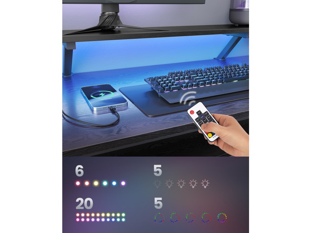 Tento rohový stůl je vybaven vestavěným LED osvětlením, které nabízí 20 barev, 6 režimů blikání, 5 úrovní jasu a 5 rychlostí blikání, které vám umožní snadno přizpůsobit atmosféru vašeho pokoje. Stůl je vybaven napájecí lištou, podstavcem na monitor a LED osvětlením. Má 2 zásuvky a 2 USB porty. Deska stolu je ve výšce 76 cm. Snadná montáž