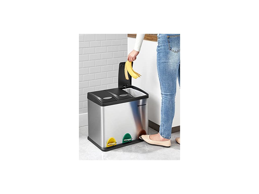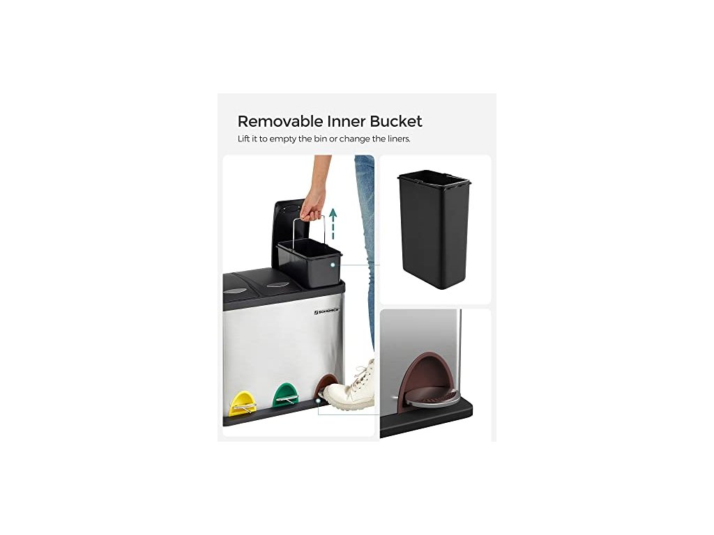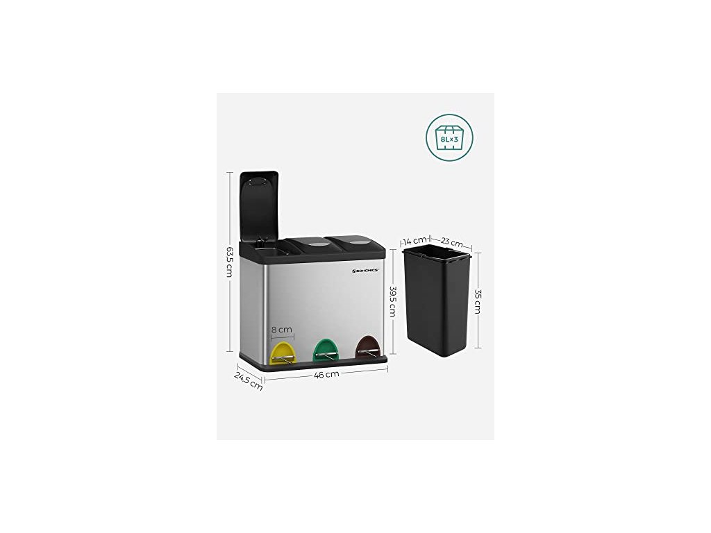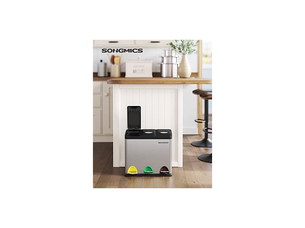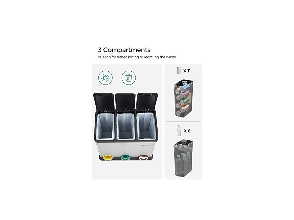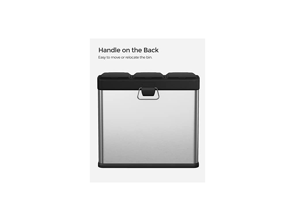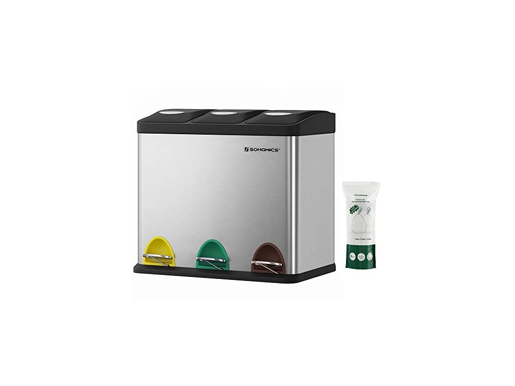 Tento recyklační koš s jednoduchou, elegantní siluetou a rafinovaným nerezovým krytem, vybavený vzduchotěsnými víky. Tříkomorový ocelový odpadkový koš, včetně 15 sáčků do koše, snadno se čistí.