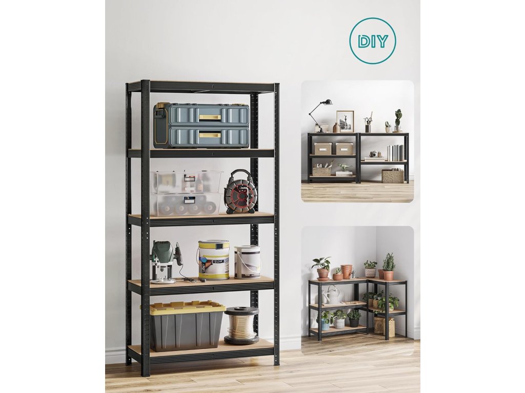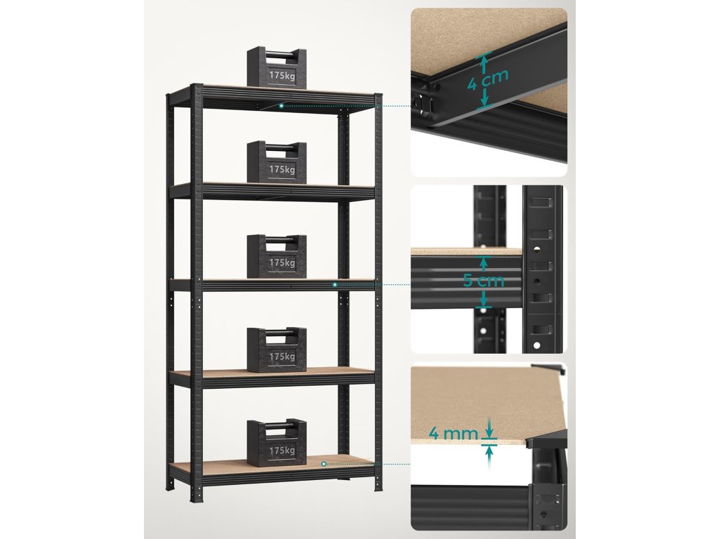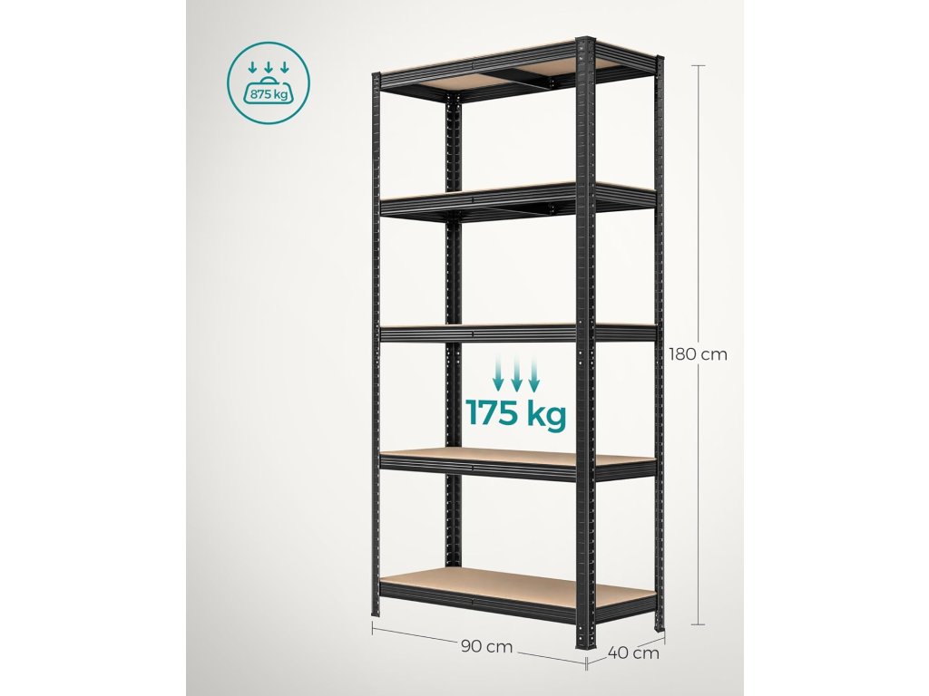 Tato sada 2 garážových regálů je vyrobena z ocelových rámů a každá úroveň unese až 175 kg. Součástí dodávky jsou sady proti převrácení, které pomáhají připevnit regály ke zdi, čímž je činí stabilnějšími a bezpečnějšími. Každý kovový regál lze rozdělit na 2 samostatné jednotky, aby vyhovoval vašim potřebám a prostoru; po rozdělení skvěle fungují i jako pracovní stoly s úložným prostorem. Posuňte své úložné prostory na vyšší úroveň s policemi, které lze nastavit v intervalech 5 cm, a dokonale se hodí pro předměty různých velikostí a tvarů. S rozměry 90 x 40 x 180 cm a celkovou nosností 875 kg lze tento regál použít v garáži, skladu, sklepě nebo technické místnosti k uspořádání veškerého nářadí a vybavení. Proměňte svůj prostor s našimi odolnými regály, které nově definují jednoduchost. Díky chytrému zámkovému designu a podrobným pokynům je sestavení vašeho úložného řešení hračka. Barva: Černá. Materiál: Ocelový rám, MDF (dřevovláknitá deska střední hustoty). Rozměry výrobku: 90 x 40 x 180 cm. Hmotnost každého regálu: 13,2 kg. Max. statická nosnost na patro: 175 kg. Max. statická nosnost celkem na regál: 875 kg