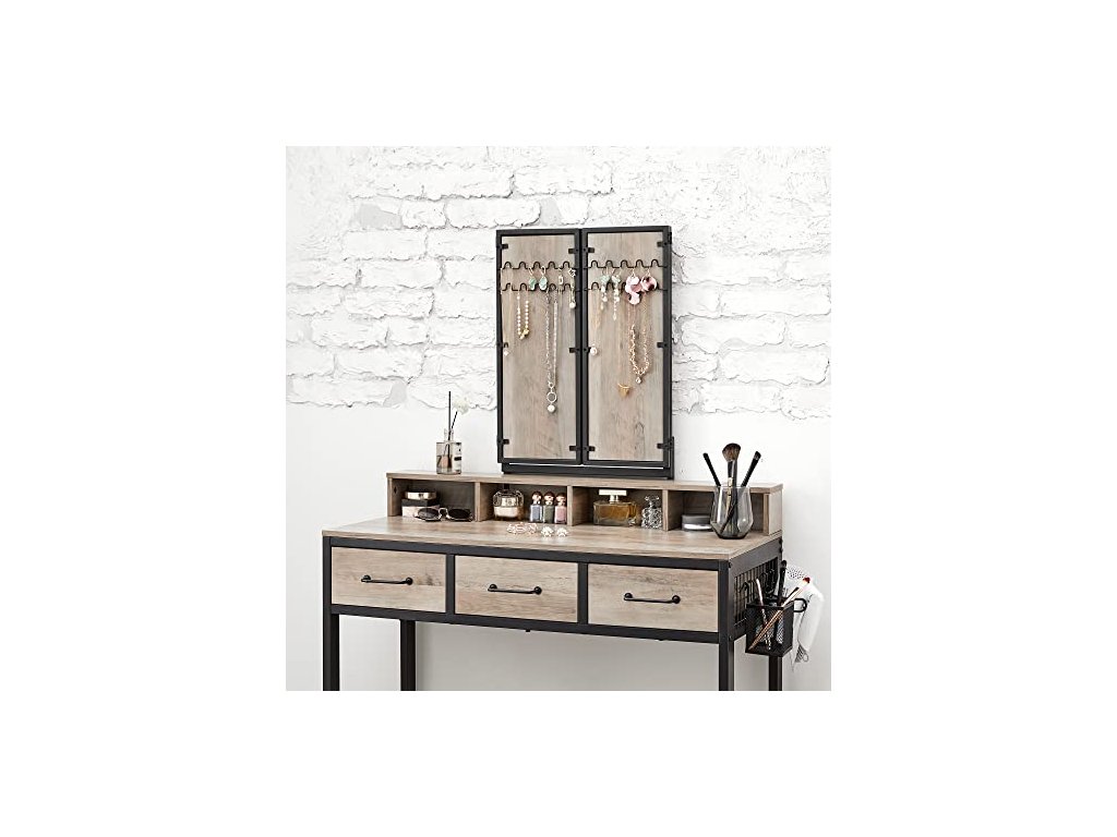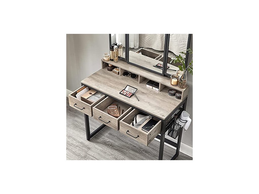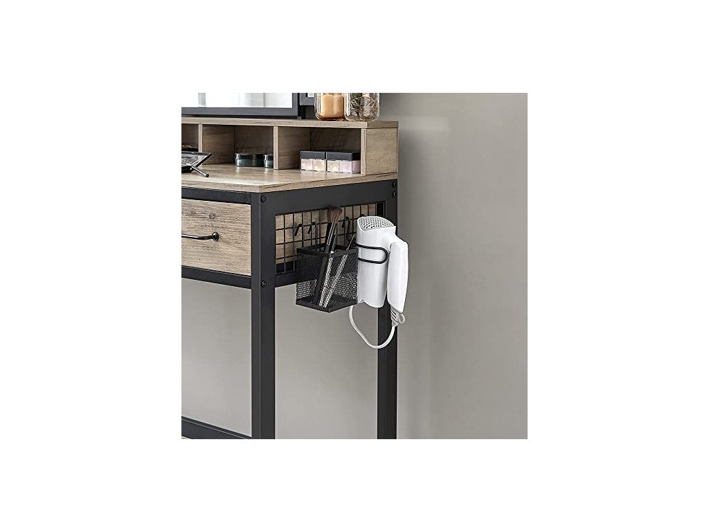 Elegantní žena nemůže žít bez krásy, kartáče a vlasového příslušenství. Proto je tento toaletní stolek v industriálním stylu vybaven 4 přihrádkami pod zrcadlem, košíčkem (8 x 8 x 10 cm) a držákem na fén na boku.