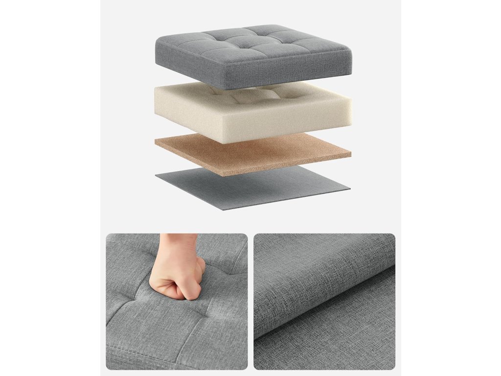 Tato lavička je vyrobena ze stylového umělého lnu a je jemně prošívaná; silné a vysoce kvalitní MDF panely vytvářejí robustní celkovou konstrukci, která lavici dává vysokou nosnost 130 kg. Tato úložná schránka je polstrovaná pěnou s vysokou hustotou a potažená umělým lnem, což zajišťuje měkké, podpůrné a prodyšné sedadlo a maximální pohodlí. Díky rozměrům 30 x 30 x 30 cm a objemu 22 litrů si do této botníky můžete úhledně uložit ložní prádlo, polštáře, přikrývky, časopisy atd. Díky unikátnímu skládacímu designu lze tuto komodu s podsedákem sestavit během několika sekund. Když se nepoužívá, můžete ji snadno složit a uložit, abyste ušetřili místo. Všestranné použití: Tuto lavičku můžete použít jako úložný box, podnožku nebo dokonce jako konferenční stolek! Lze ji umístit kamkoli, např. v obývacím pokoji, na konec postele, v chodbě nebo pod okno. Barva Světle šedá. Typ látky: Umělá kůže. Základní materiál: Technické dřevo Materiál rámu Technické dřevo. Maximální doporučená hmotnost 130 kilogramů. Montáž není nutná. Rozměry 30 x 30 x 30 cm