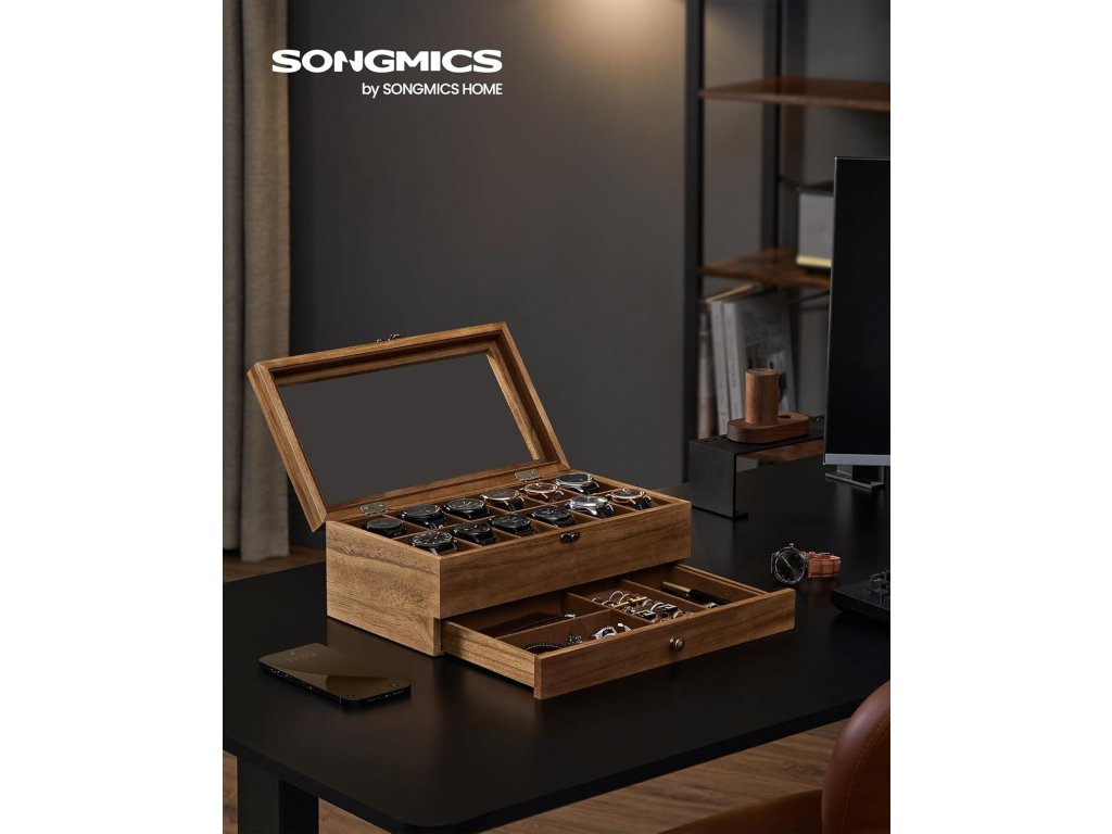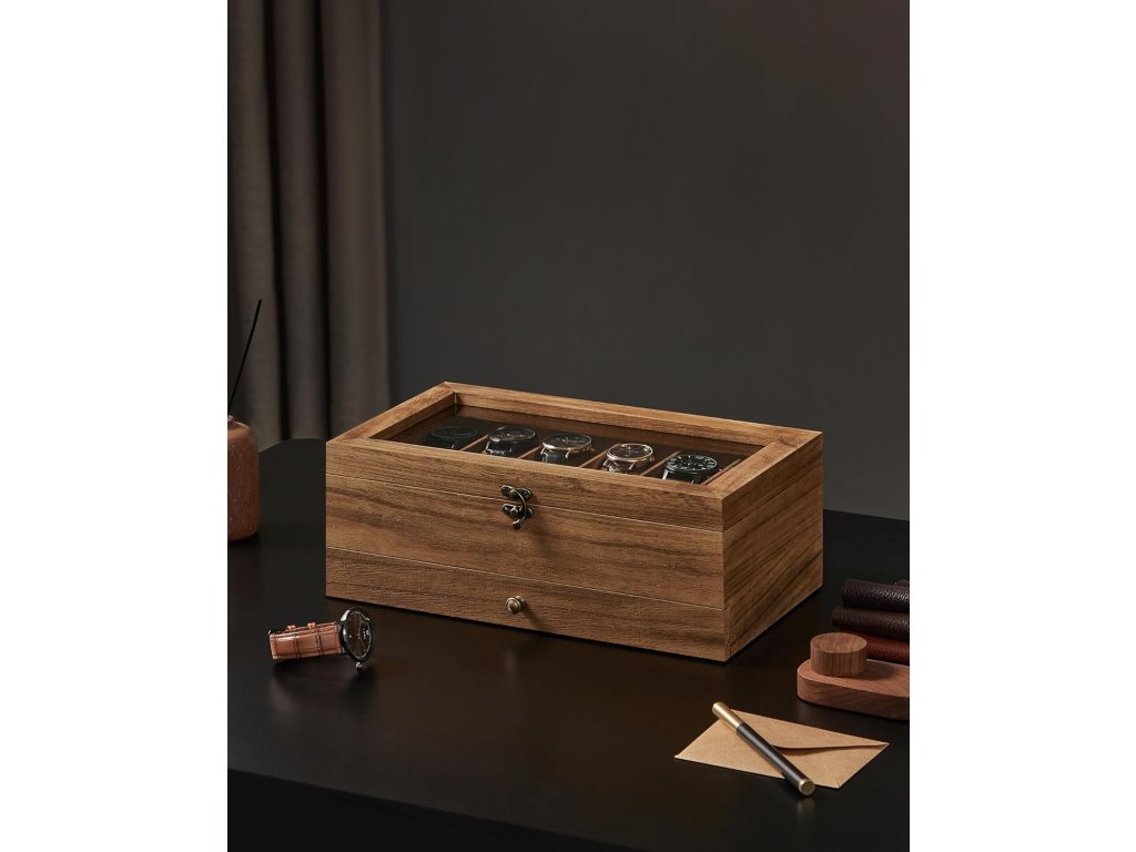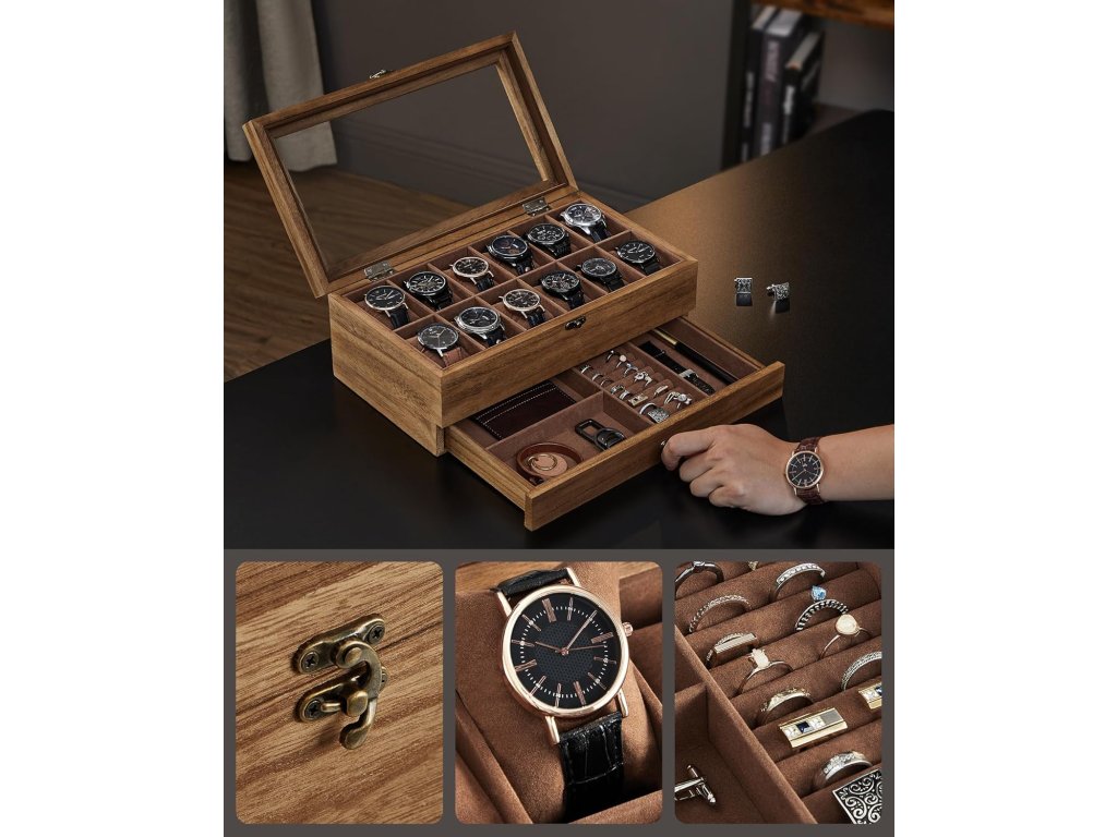 S 12 přihrádkami na hodinky v první vrstvě a různými přihrádkami ve spodní zásuvce na řemínky k hodinkám, prsteny a manžetové knoflíčky udržuje tato dvoupatrová krabička na hodinky přehledně uspořádané hodinky i šperky. Tento držák na hodinky s masivním dřevěným rámem s bohatou kresbou dřeva a velkým víkem z čirého skla nejen splňuje vaše potřeby v oblasti úložného prostoru, ale také stylově doplní vaši sbírku hodinek a oživí váš prostor. Tato krabička na hodinky s robustním dřevěným rámem zvenku a měkkým sametem zevnitř nabízí všestrannou ochranu vašich hodinek před nehodami a poškrábáním. Měkké, ale zároveň podpůrné polštářky je udrží v dobrém stavu. Toto pouzdro na hodinky má velké, čiré skleněné víko, takže můžete vystavit svou sbírku hodinek, chránit je před prachem a okamžitě najít své oblíbené, abyste ušetřili čas během hektických rán. Tato elegantní a praktická krabička na hodinky je skvělým dárkem k narozeninám, výročím nebo svátkům, ať už pro vaši rodinu, přátele nebo někoho blízkého. Nebo proč si neudělat radost sami sobě? Zasloužíte si to. Barva: Rustikální ořech. Materiál: Dřevo paulovnie, sametová podšívka, sklo. Rozměry výrobku: 34 x 19 x 12,5 cm. Hmotnost výrobku: 1,6 kg